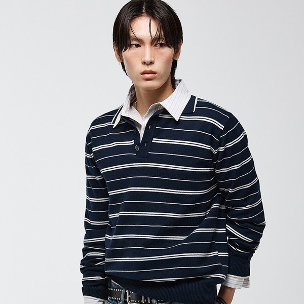 [HALEINE] STRIPED WOOL-COTTON POLO KNIT NAVY (WT302)