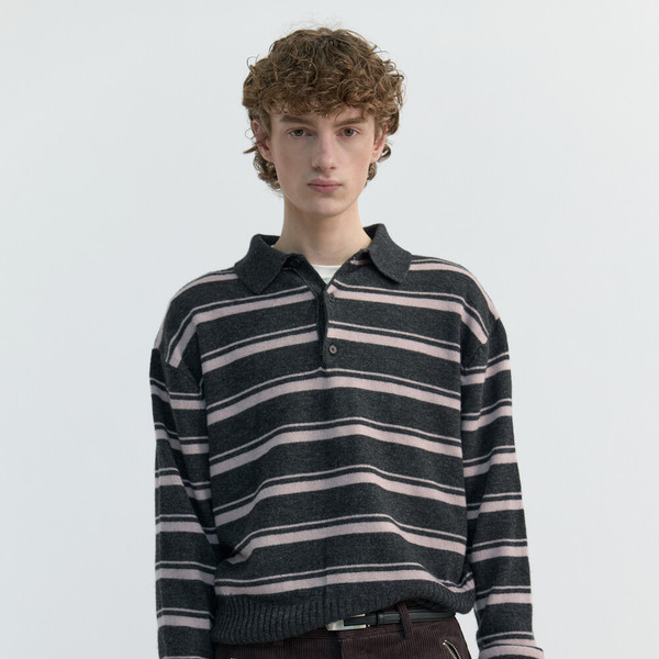 [WINDER] CASHMERE BLEND STRIPE POLO SWEATER - CHAROCAL PINK