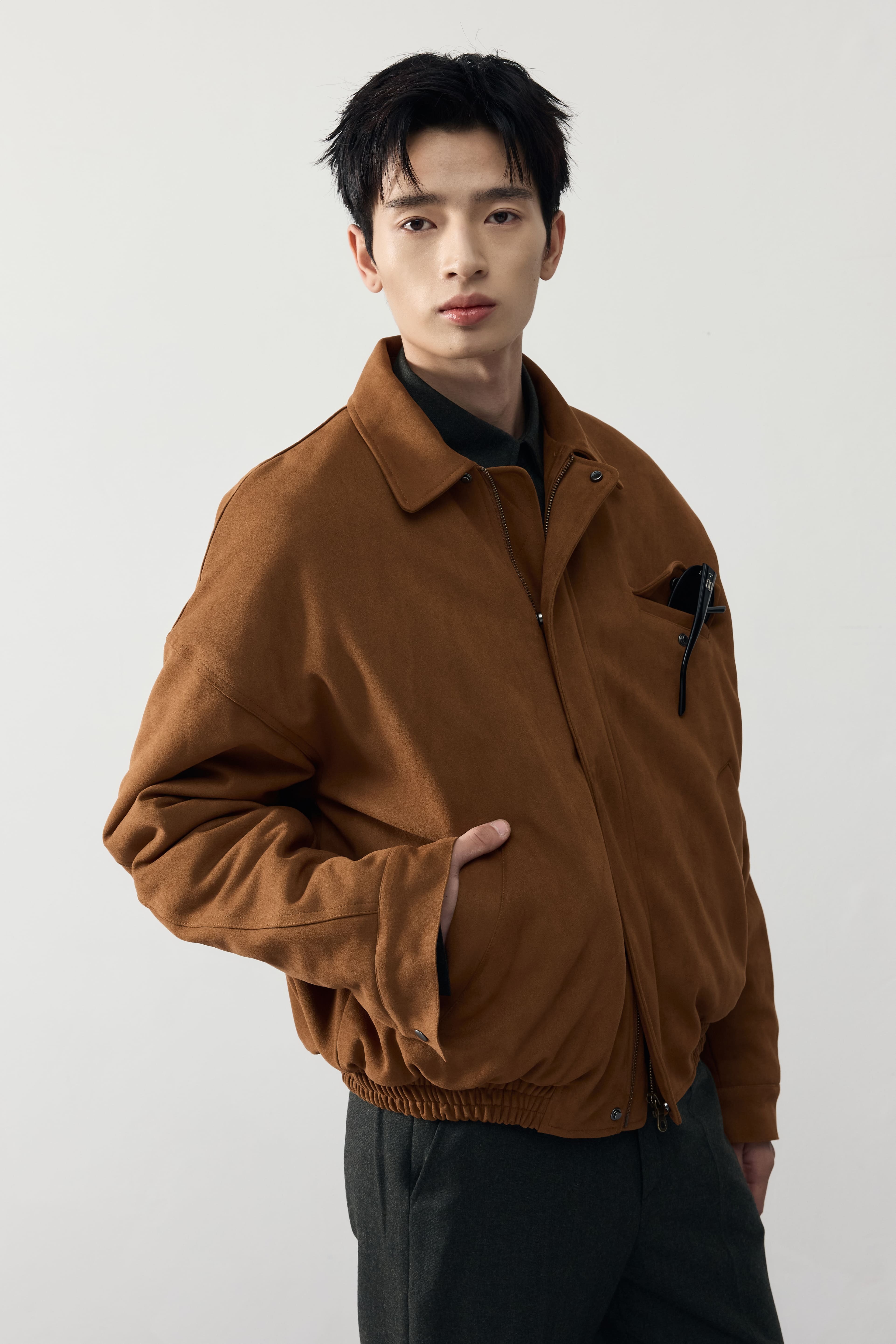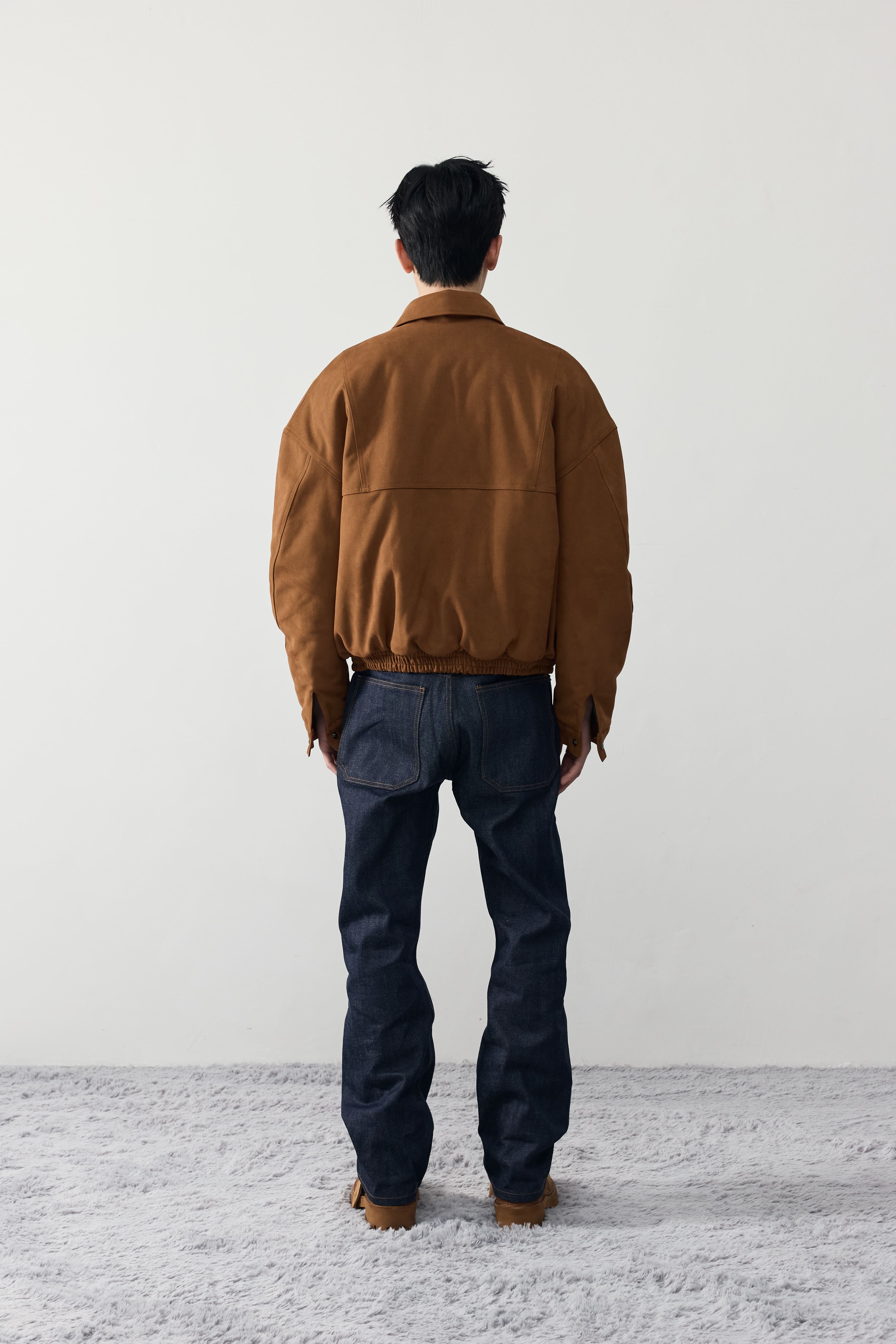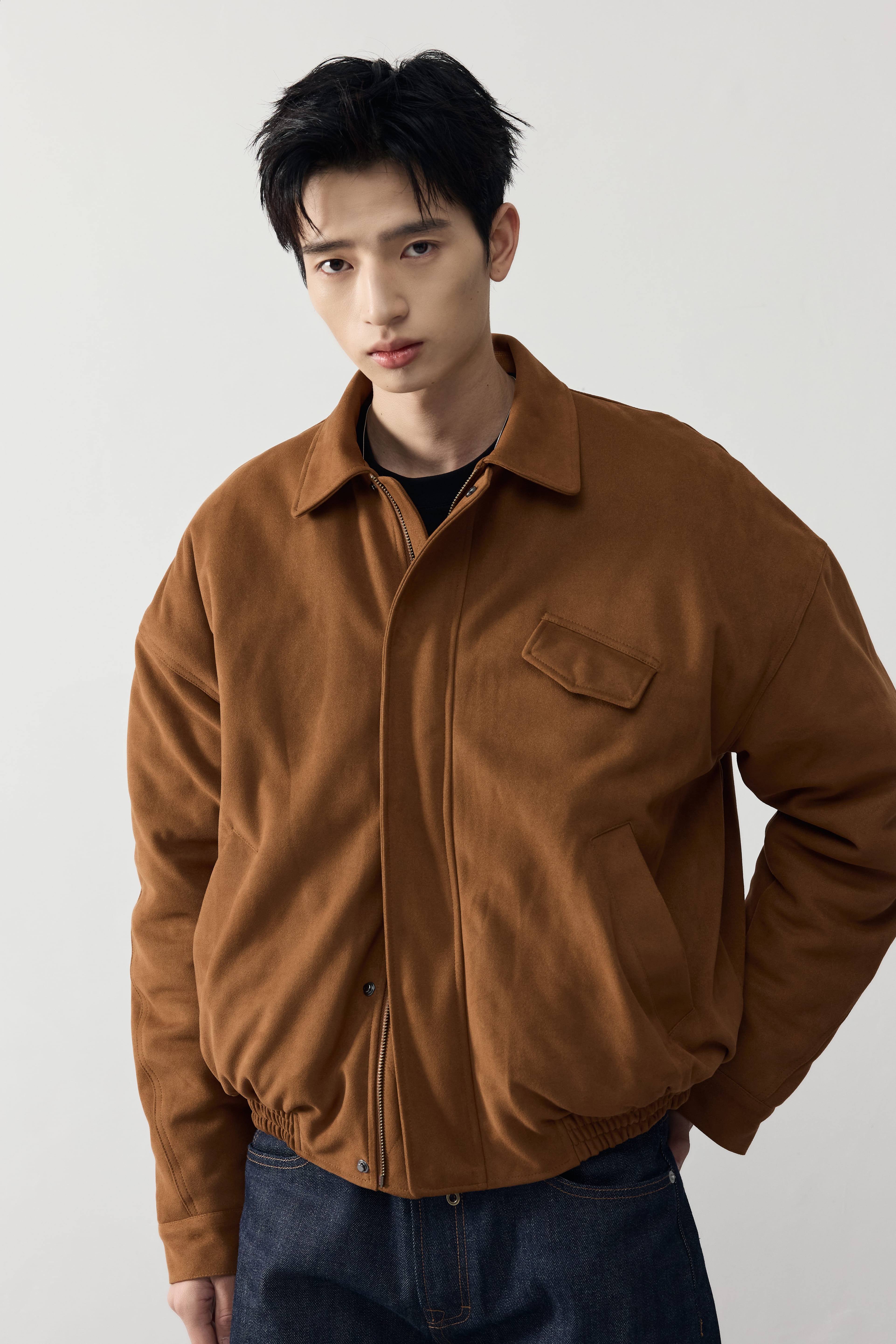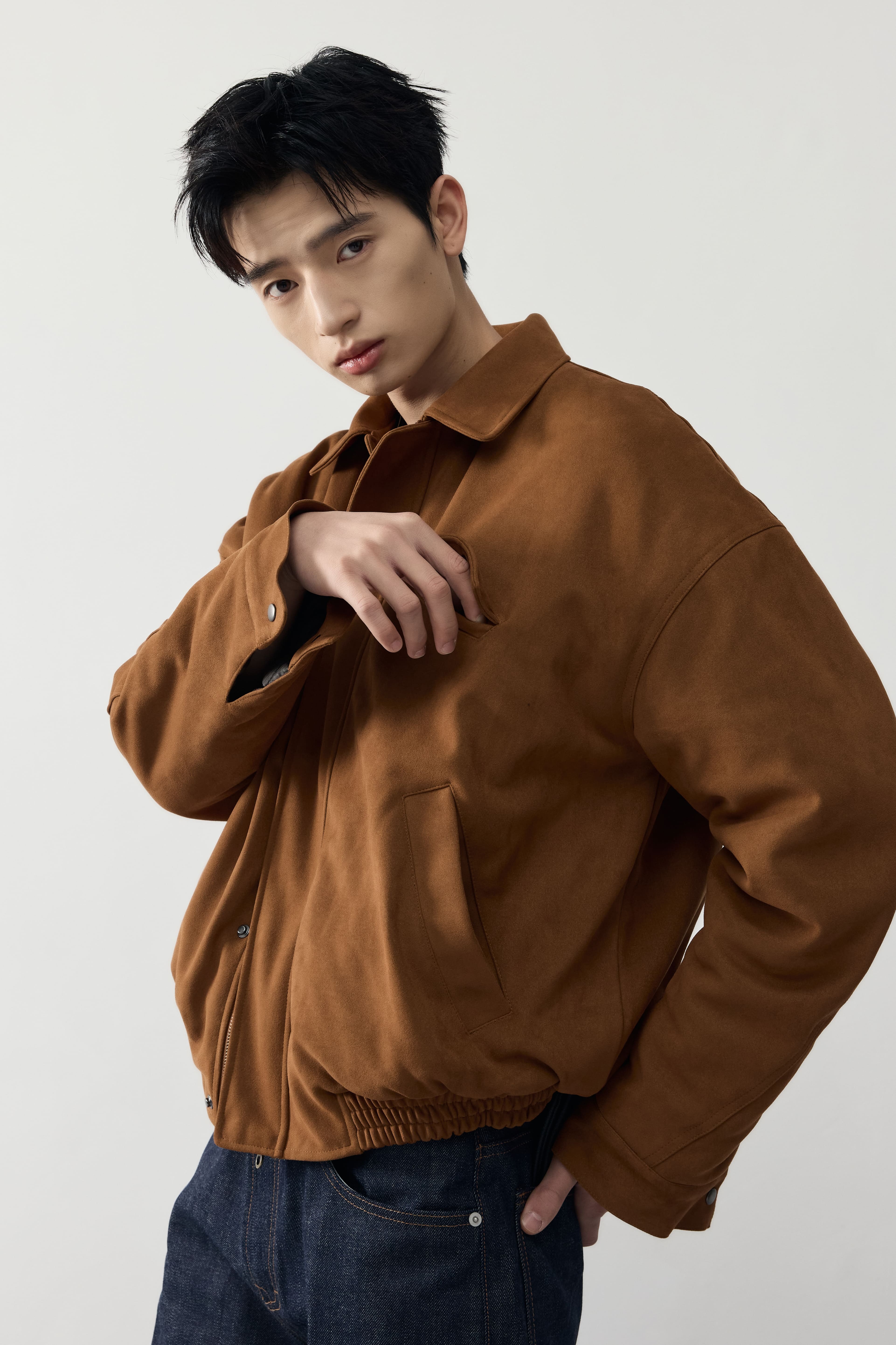 부드러운 비건 스웨이드 소재로 제작된 봄버 자켓입니다