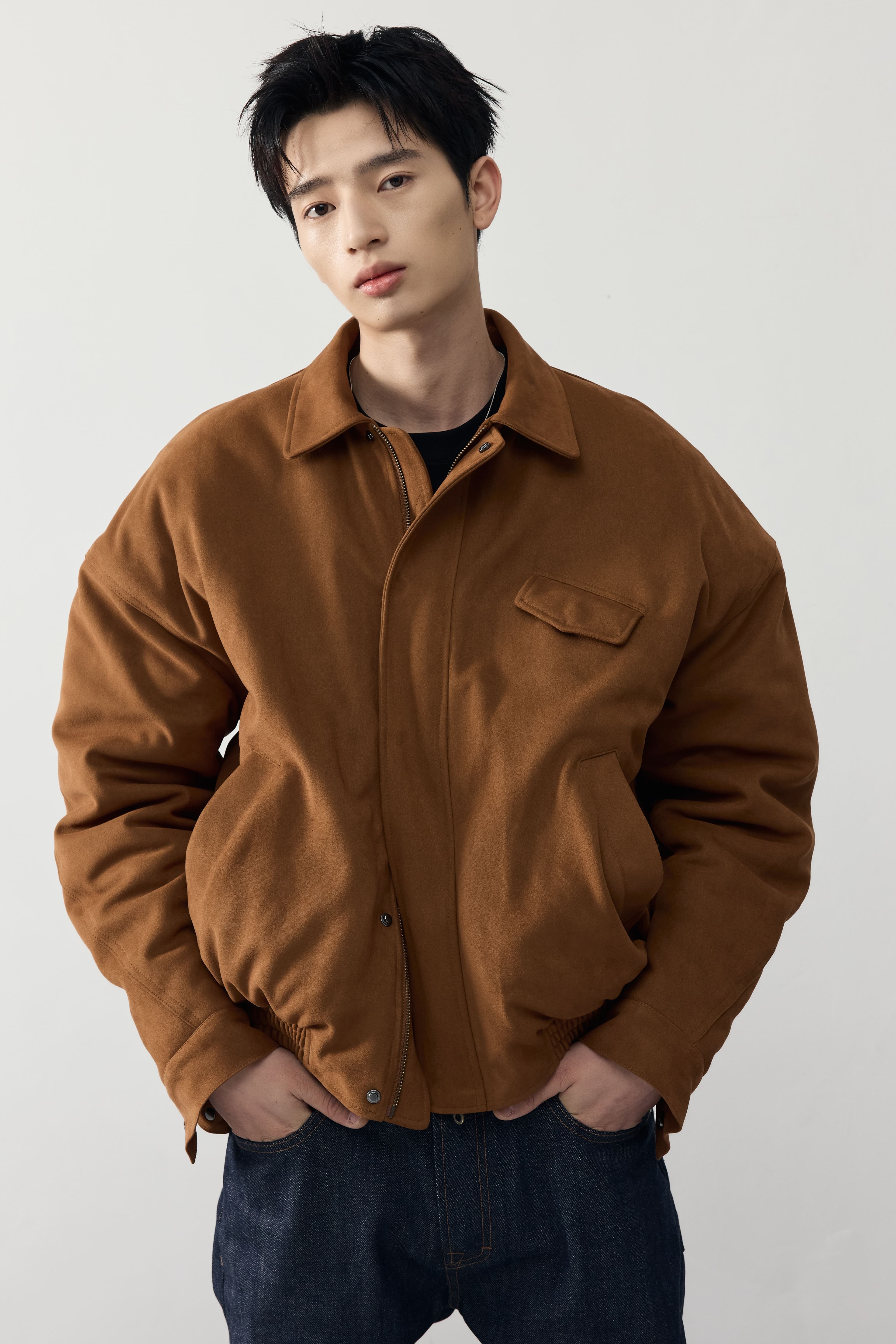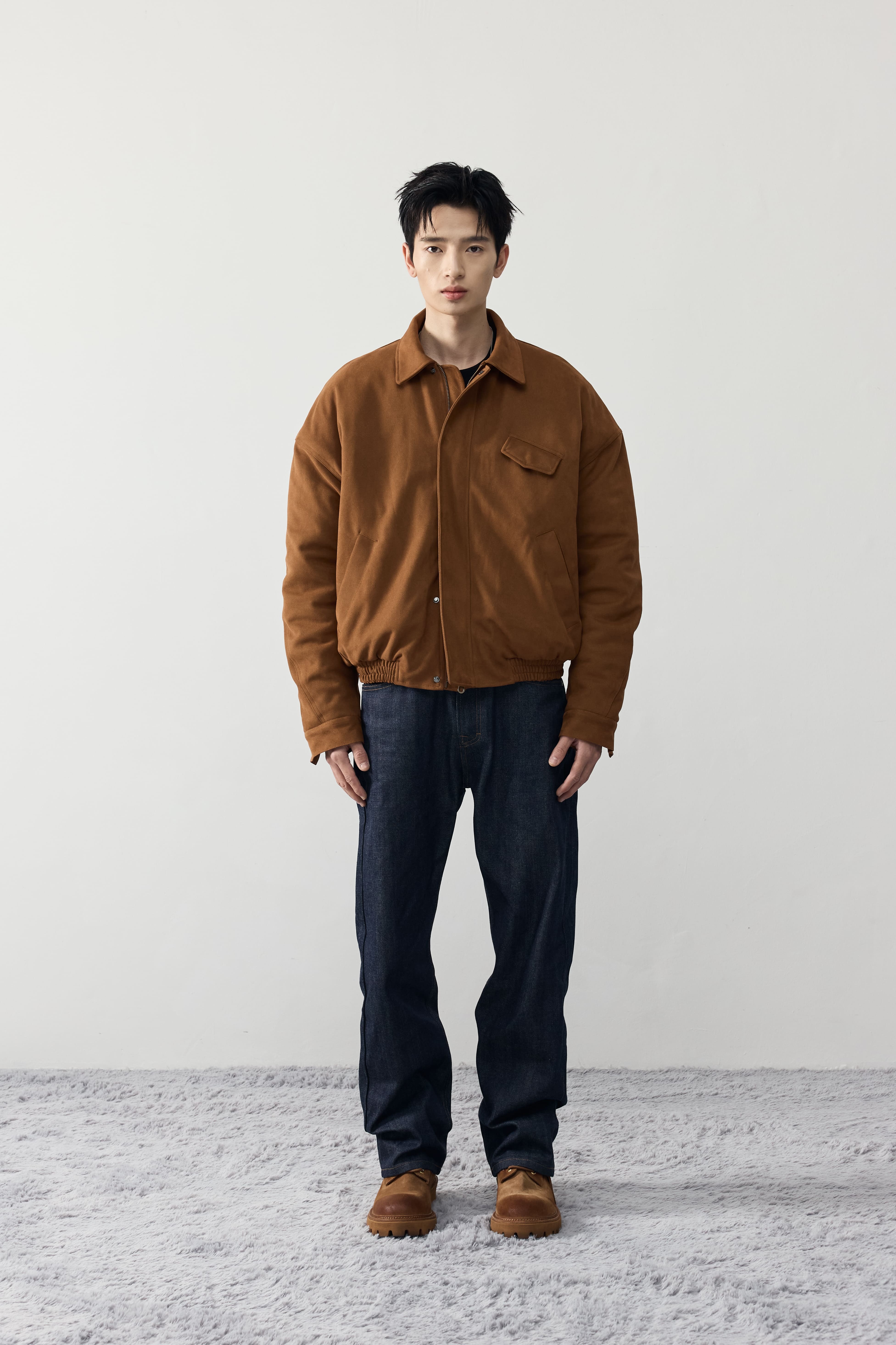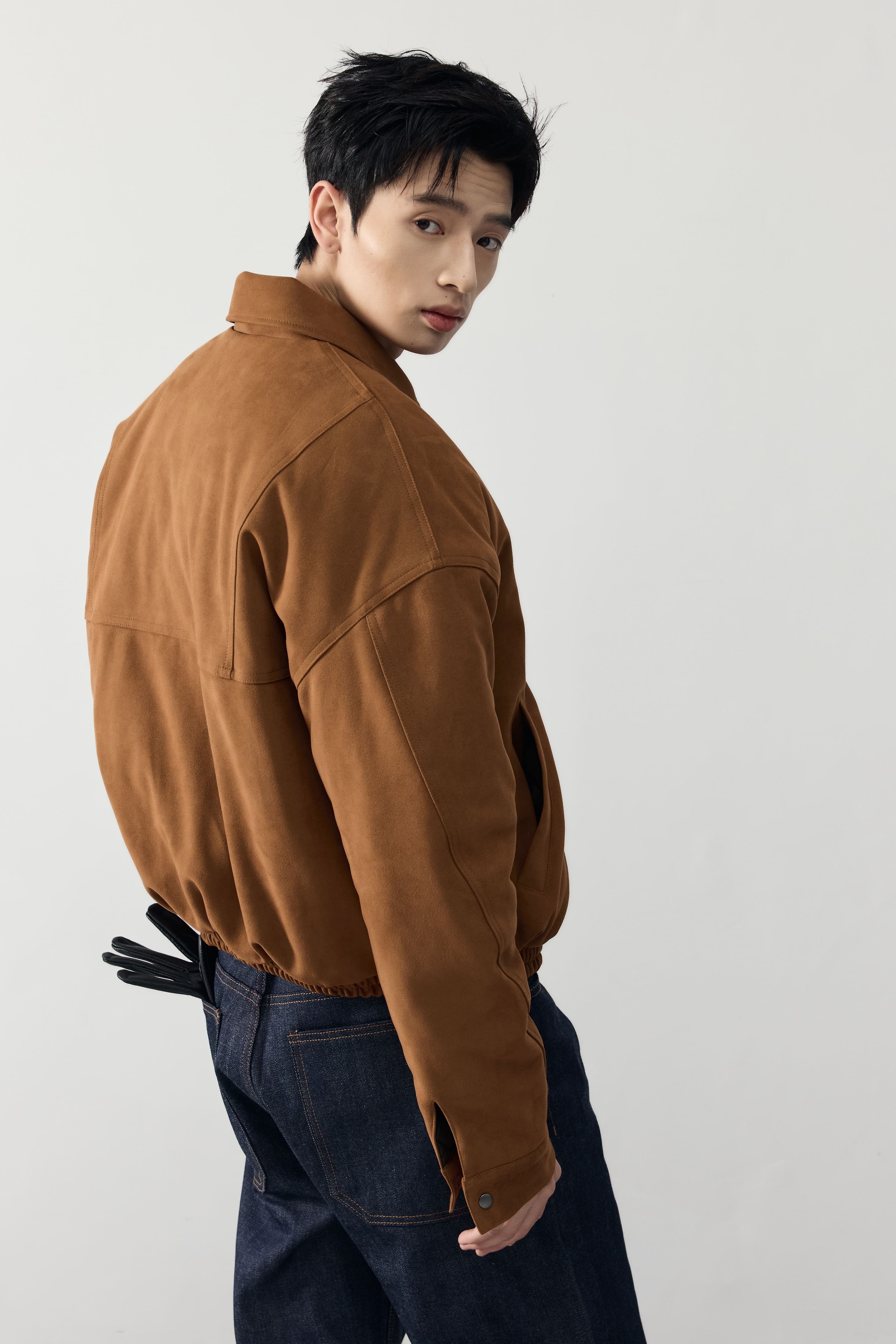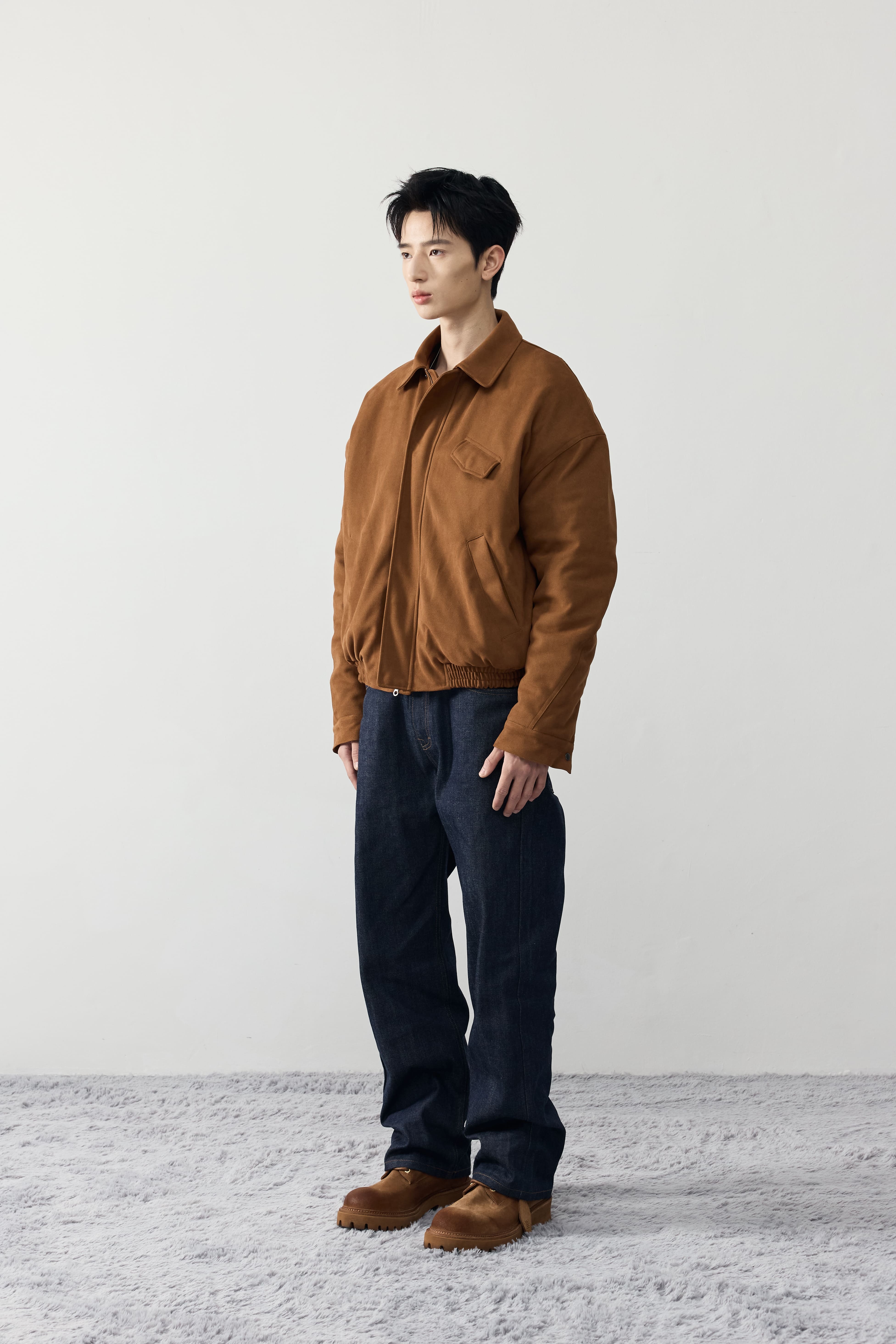 부드러운 비건 스웨이드 소재로 제작된 봄버 자켓입니다