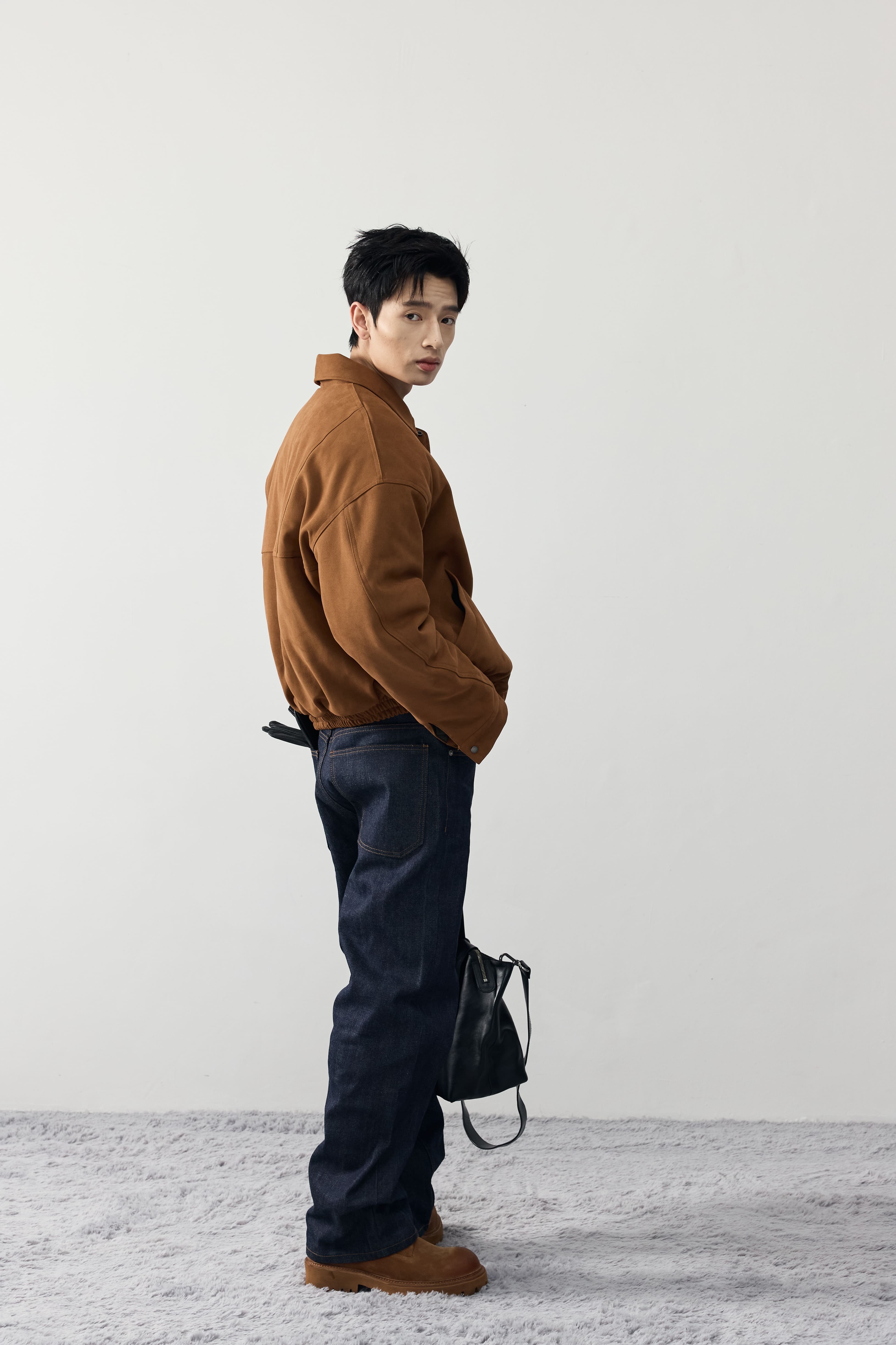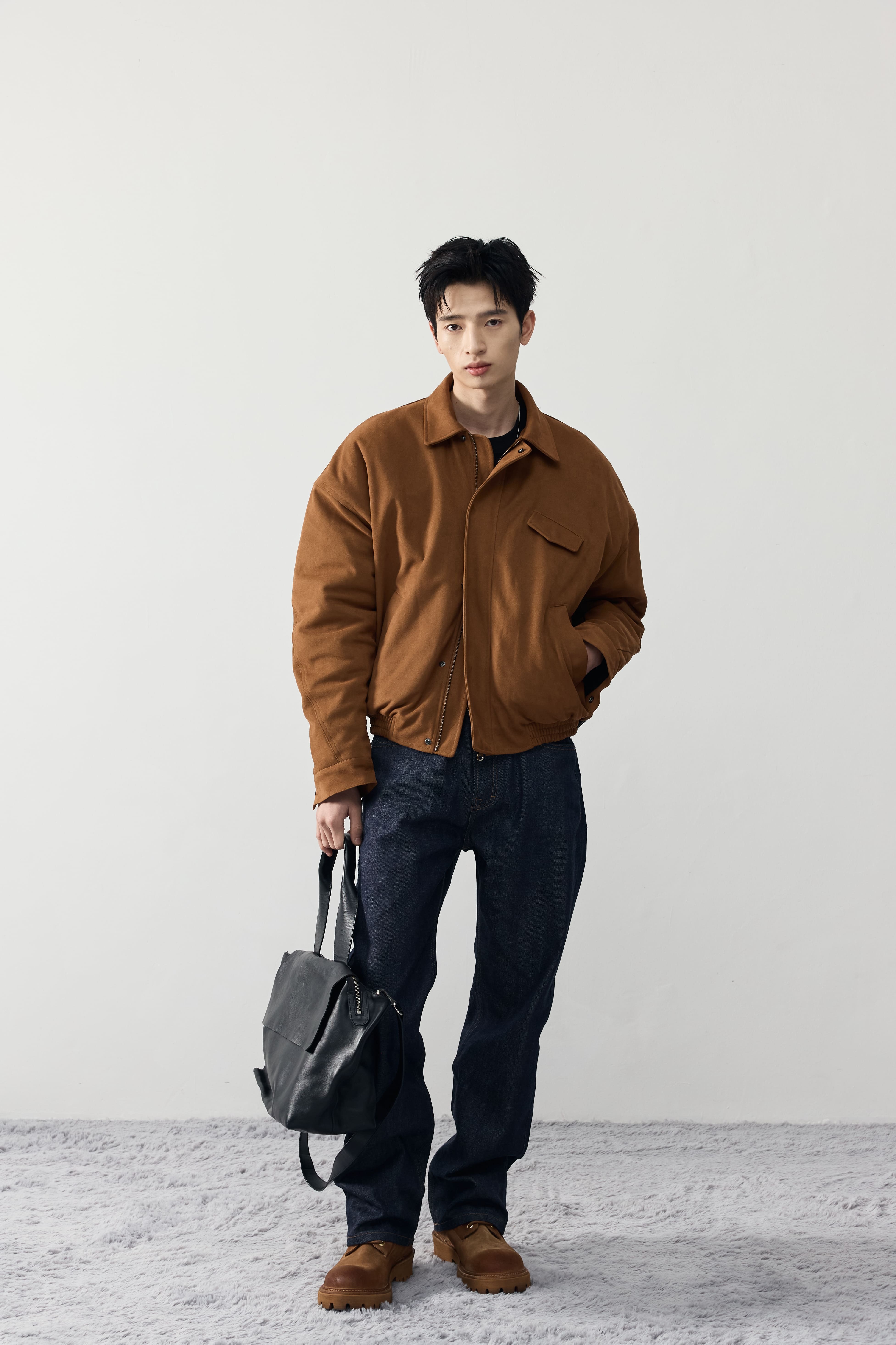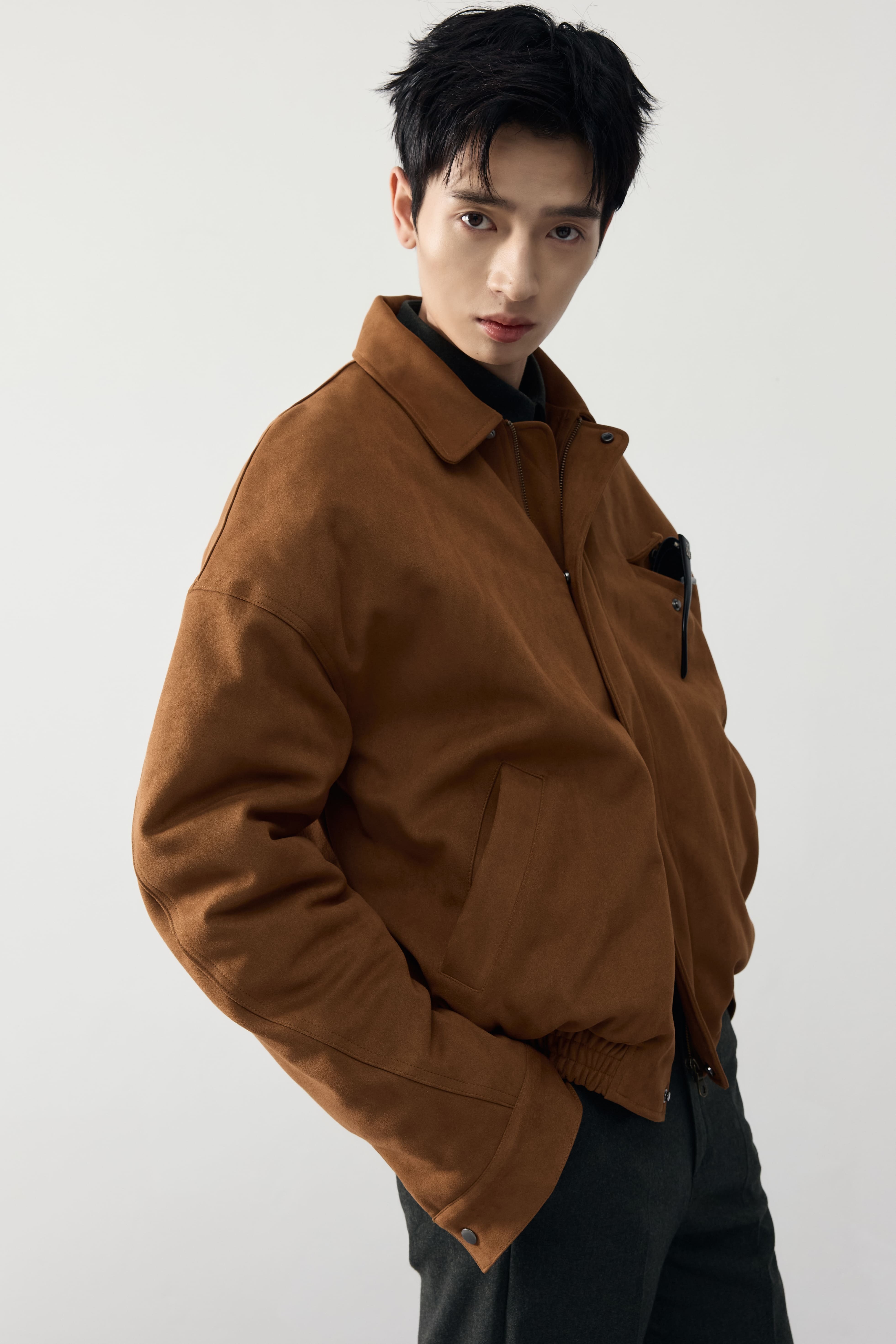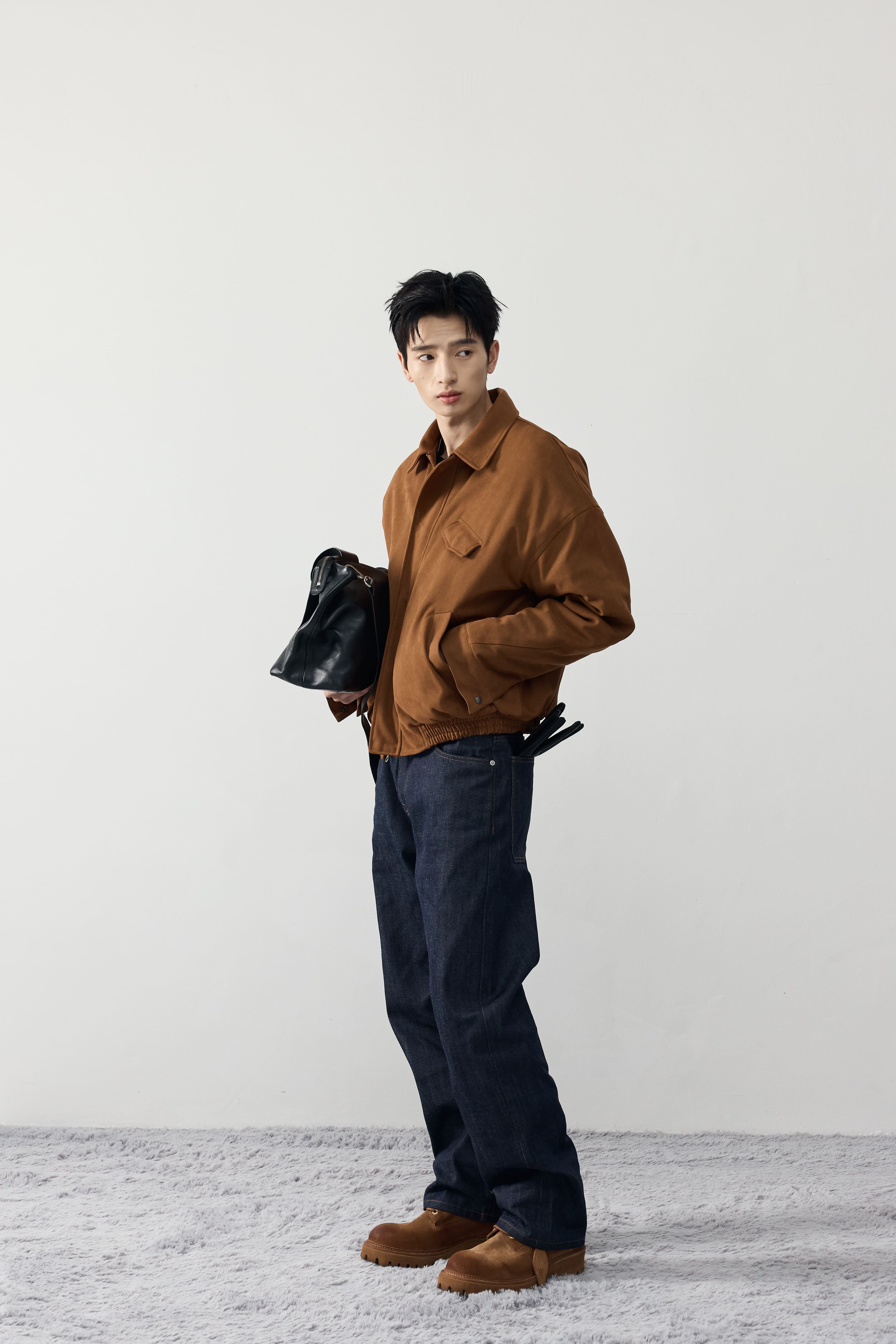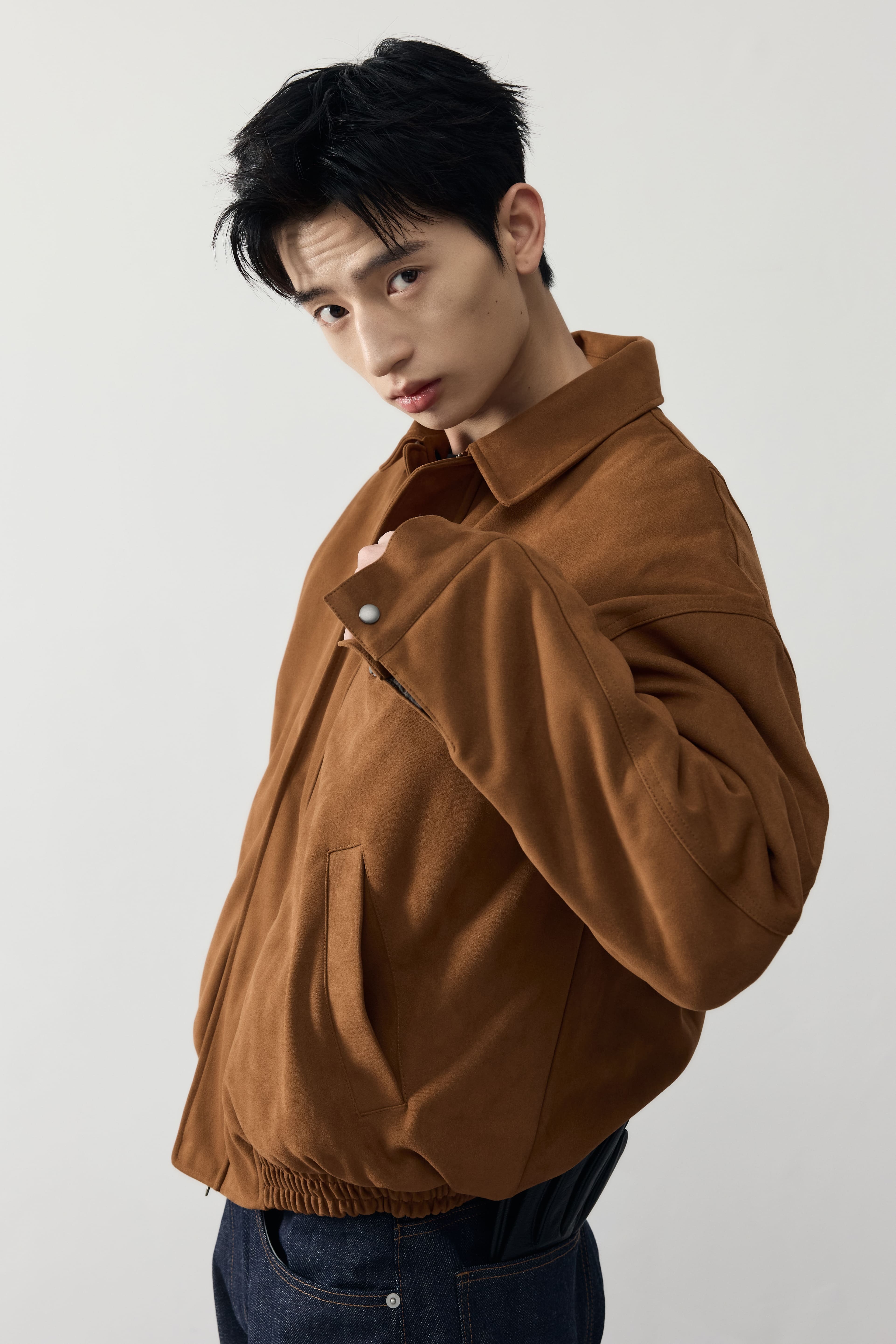 부드러운 비건 스웨이드 소재로 제작된 봄버 자켓입니다