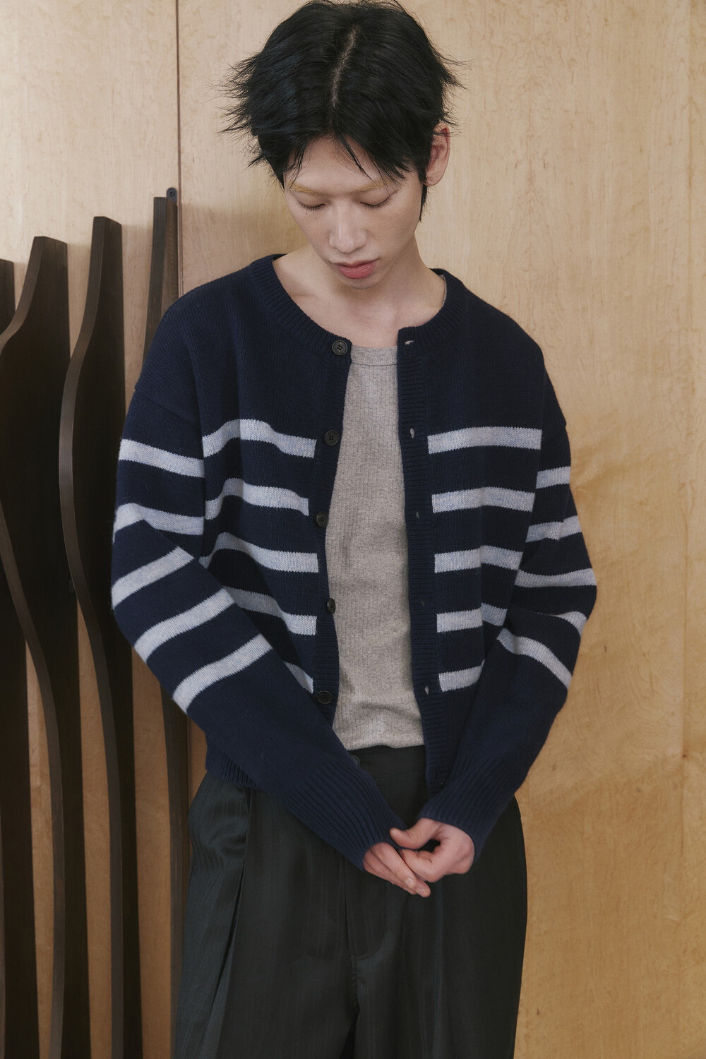 스트라이프 라운드넥 가디건 네이비 블루