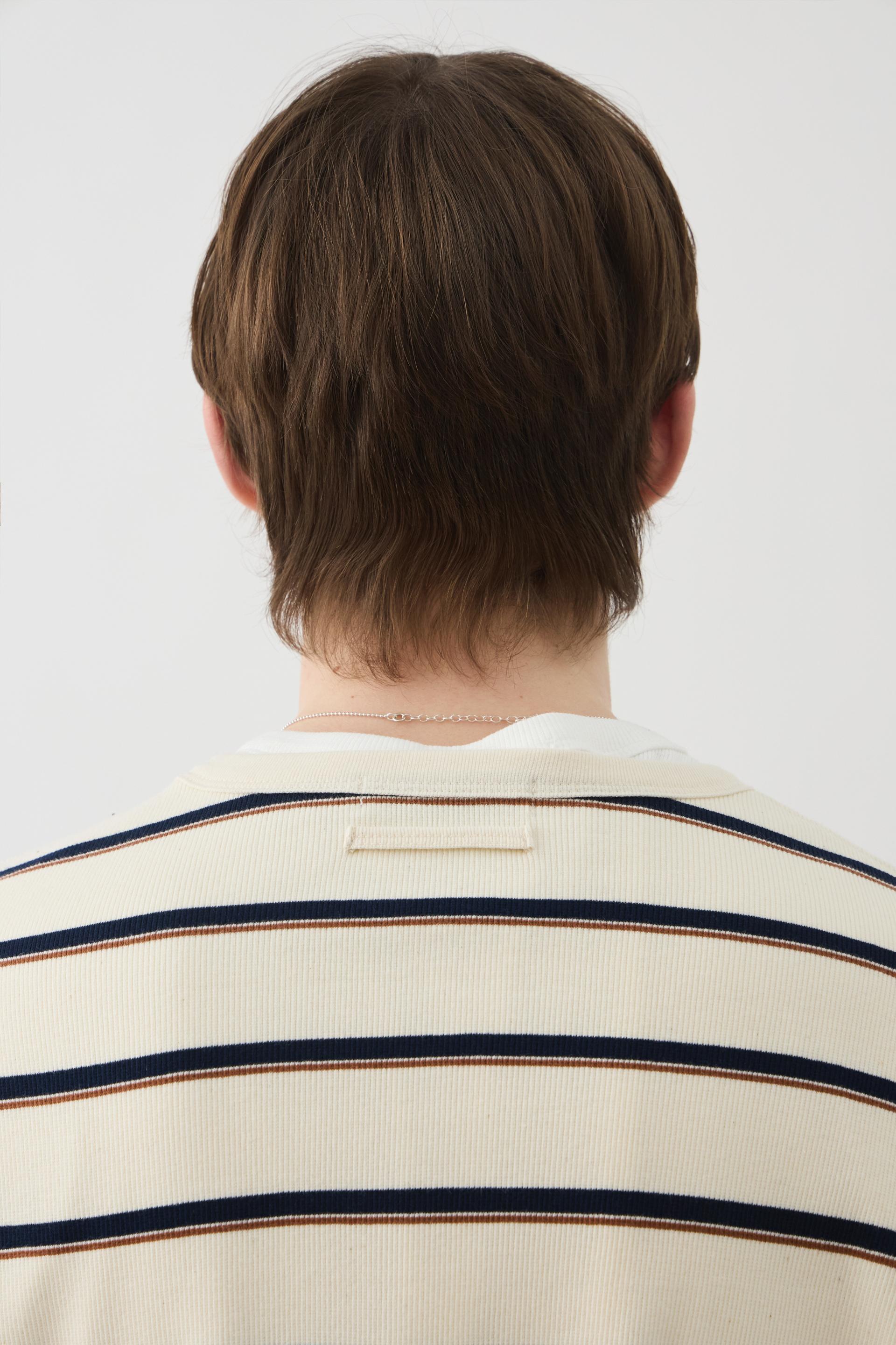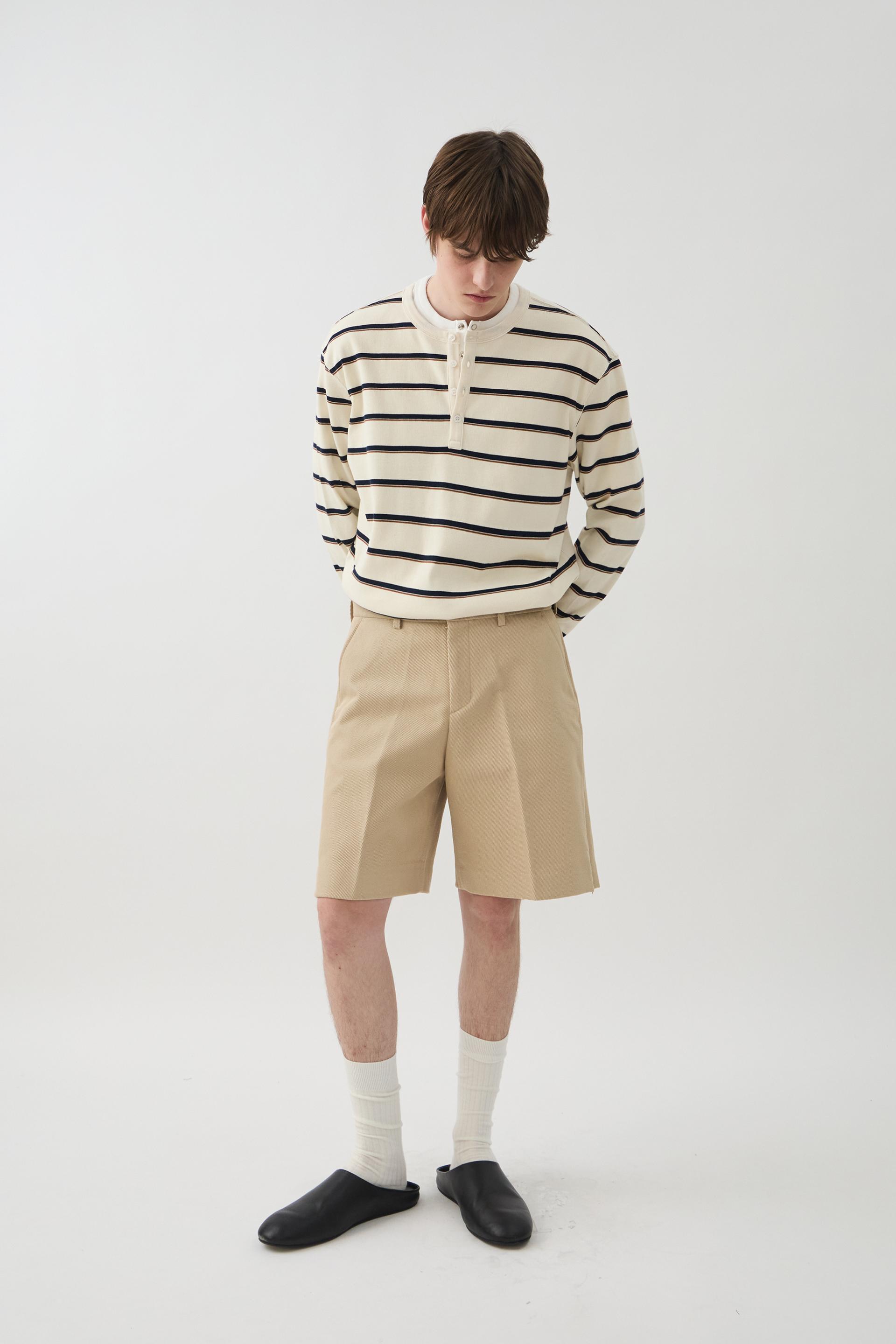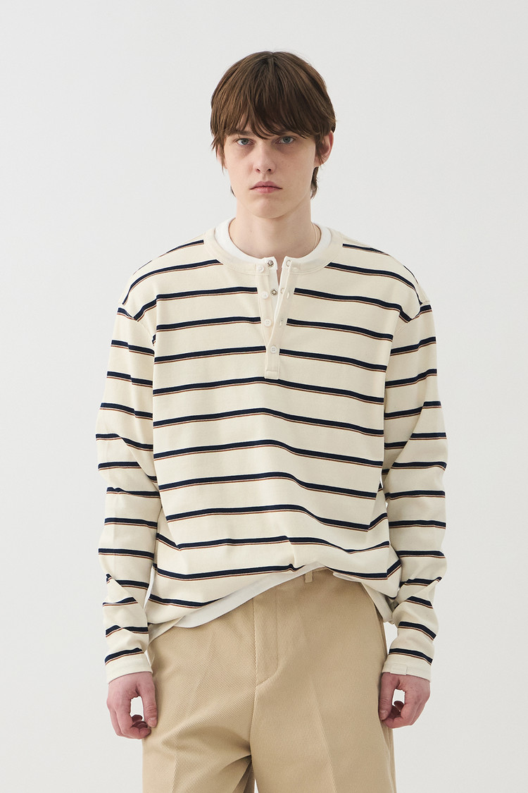 -안정감 있는 스트라이프 소재로 제작된 클래식 헨리넥 져지 탑