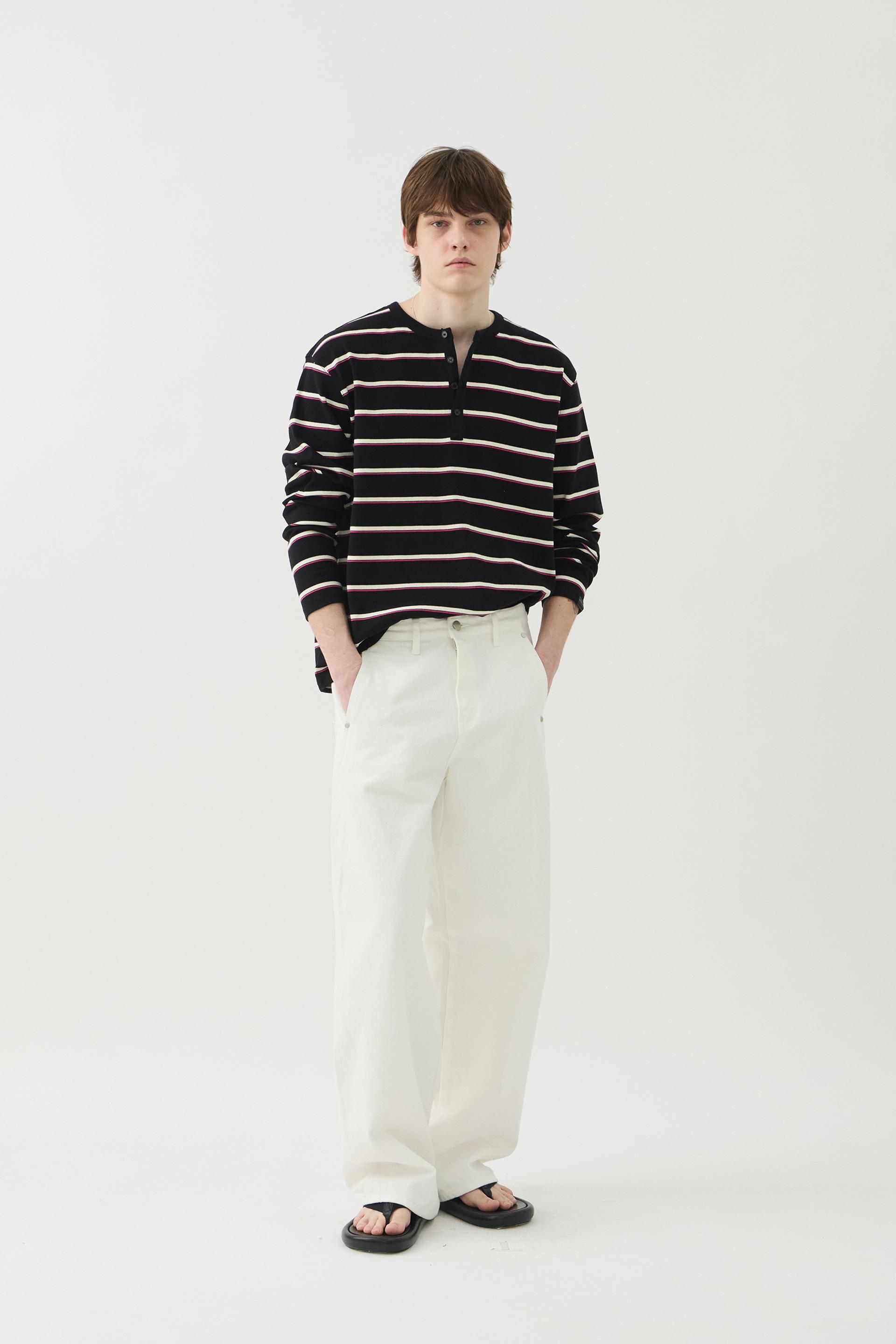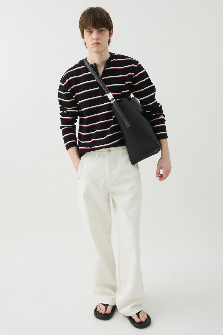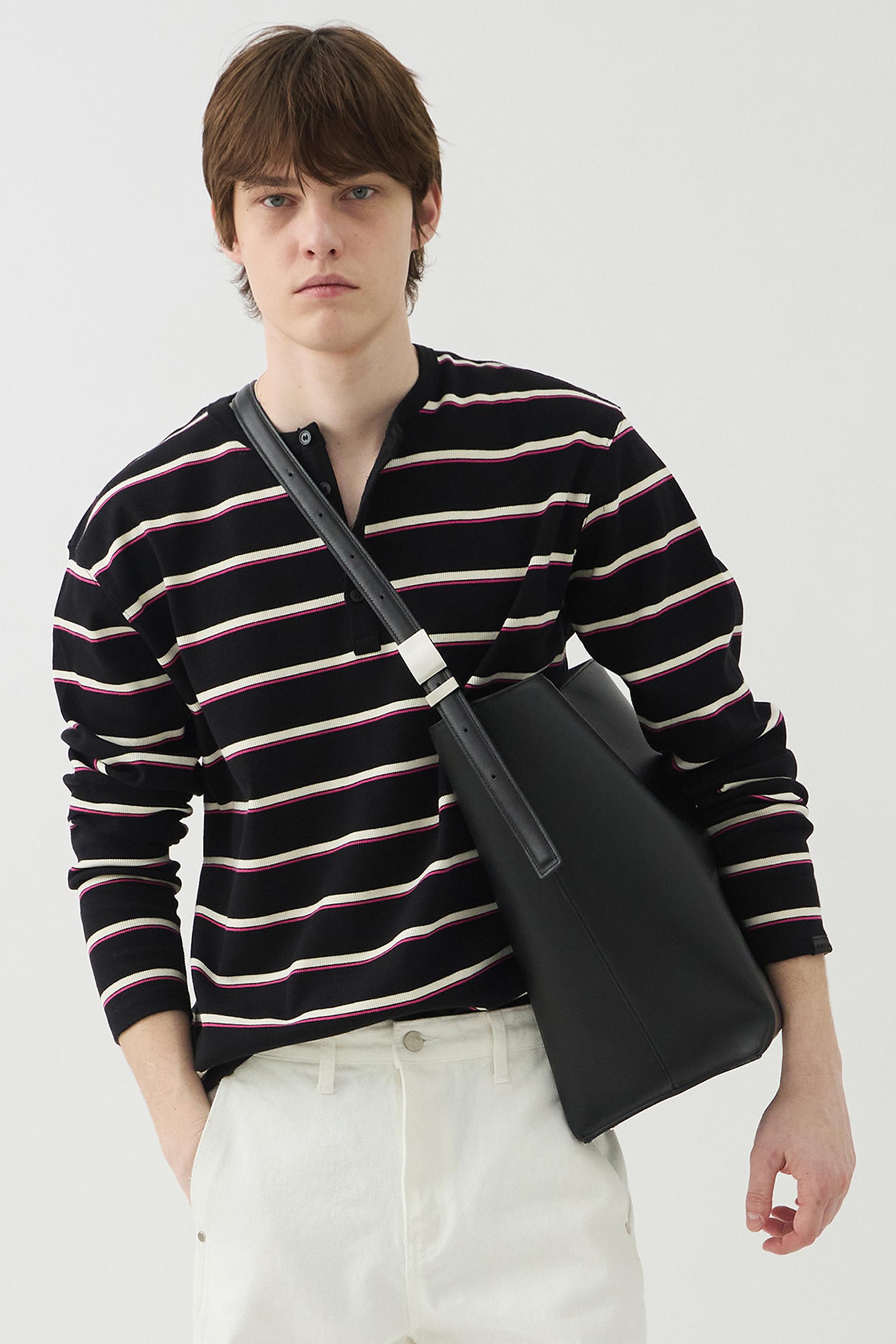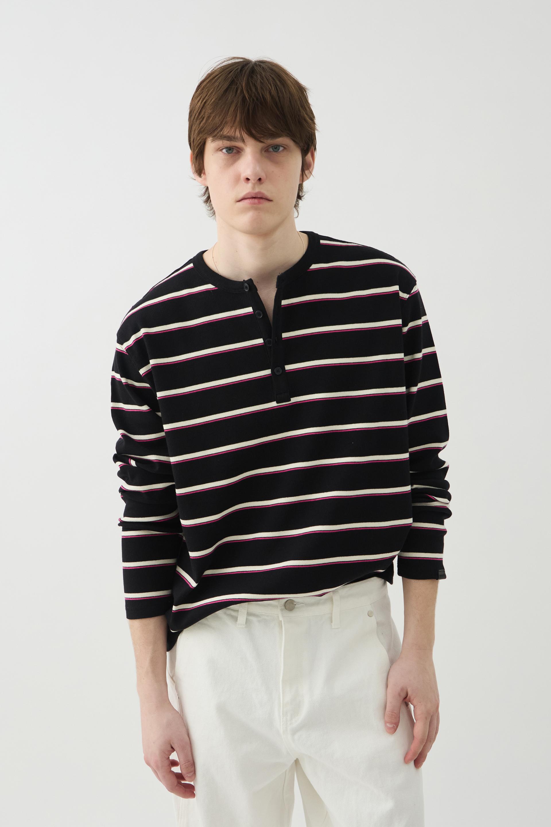 -안정감 있는 스트라이프 소재로 제작된 클래식 헨리넥 져지 탑