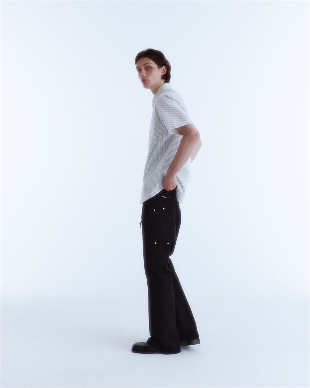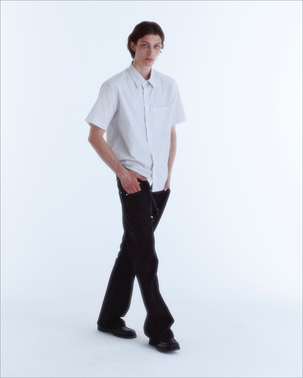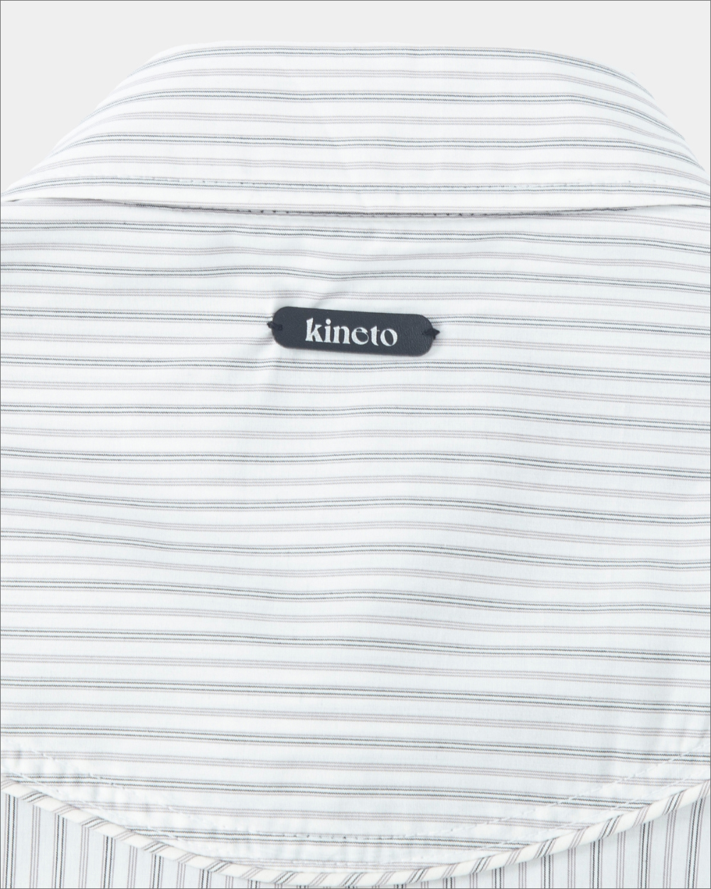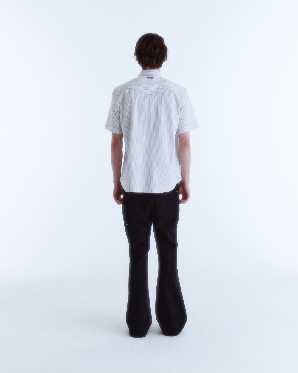 사선 형태로 컷오프된 포켓과 스트라이프 패턴이 조화를 이루며 데일 리한 환경속 세련된 무드를 더합니다. 키네토 로고가 음각 처리된 가죽 라벨이 장식되며, 후면부에 커브 형태의 요크 라인에 파이핑 디테일을 더하여 위트있게 표현하였습니다.