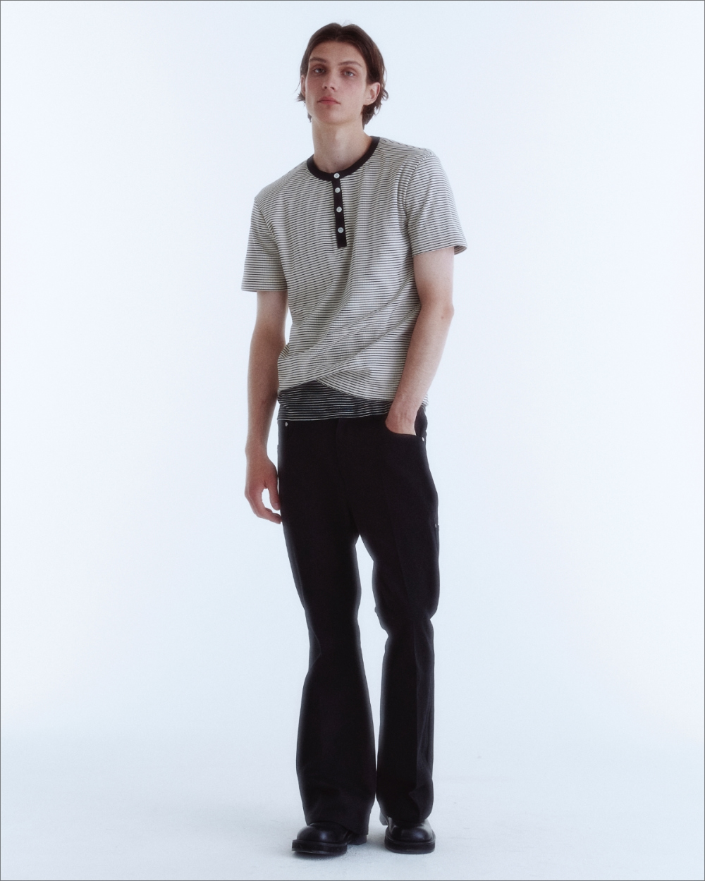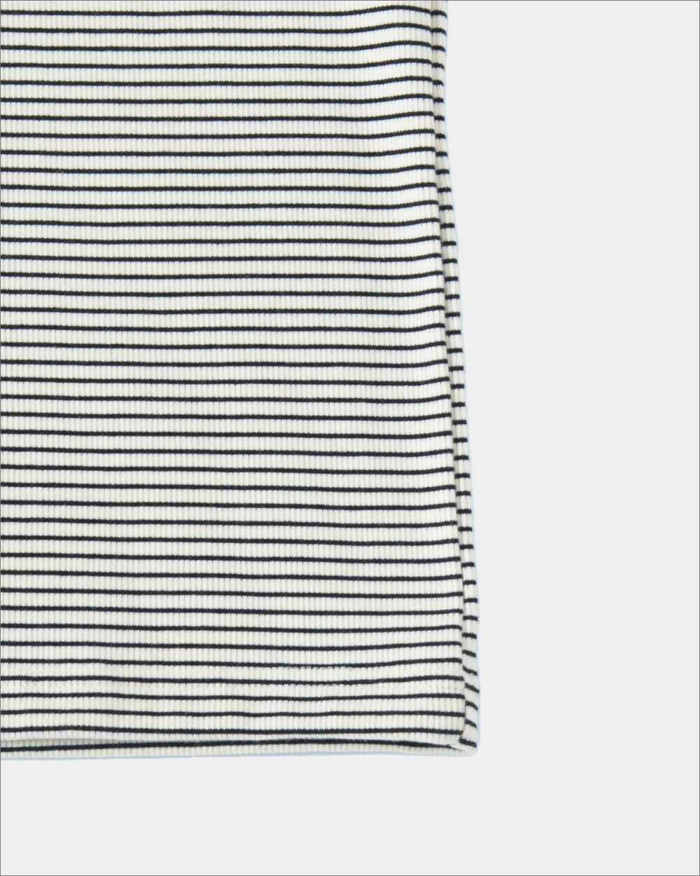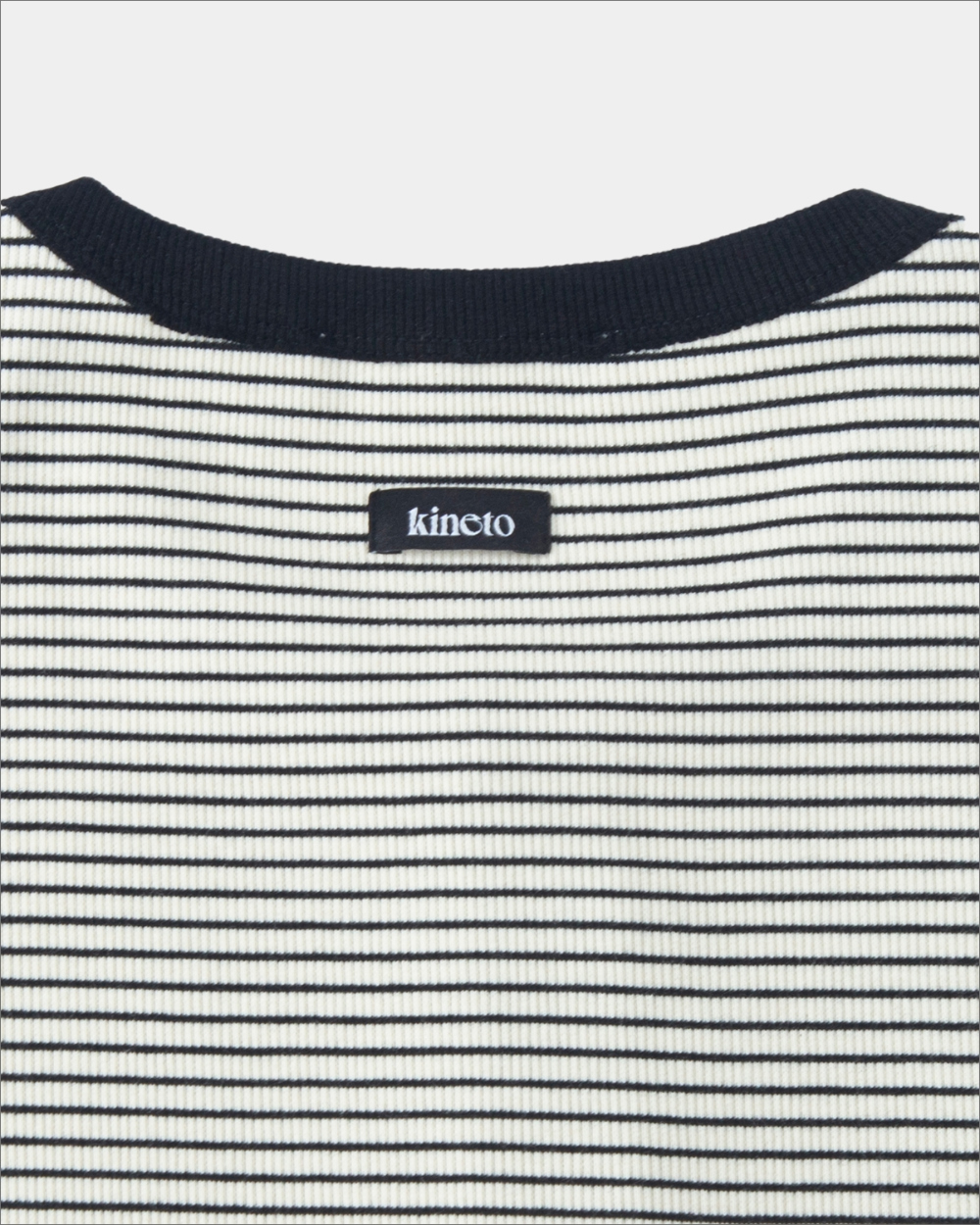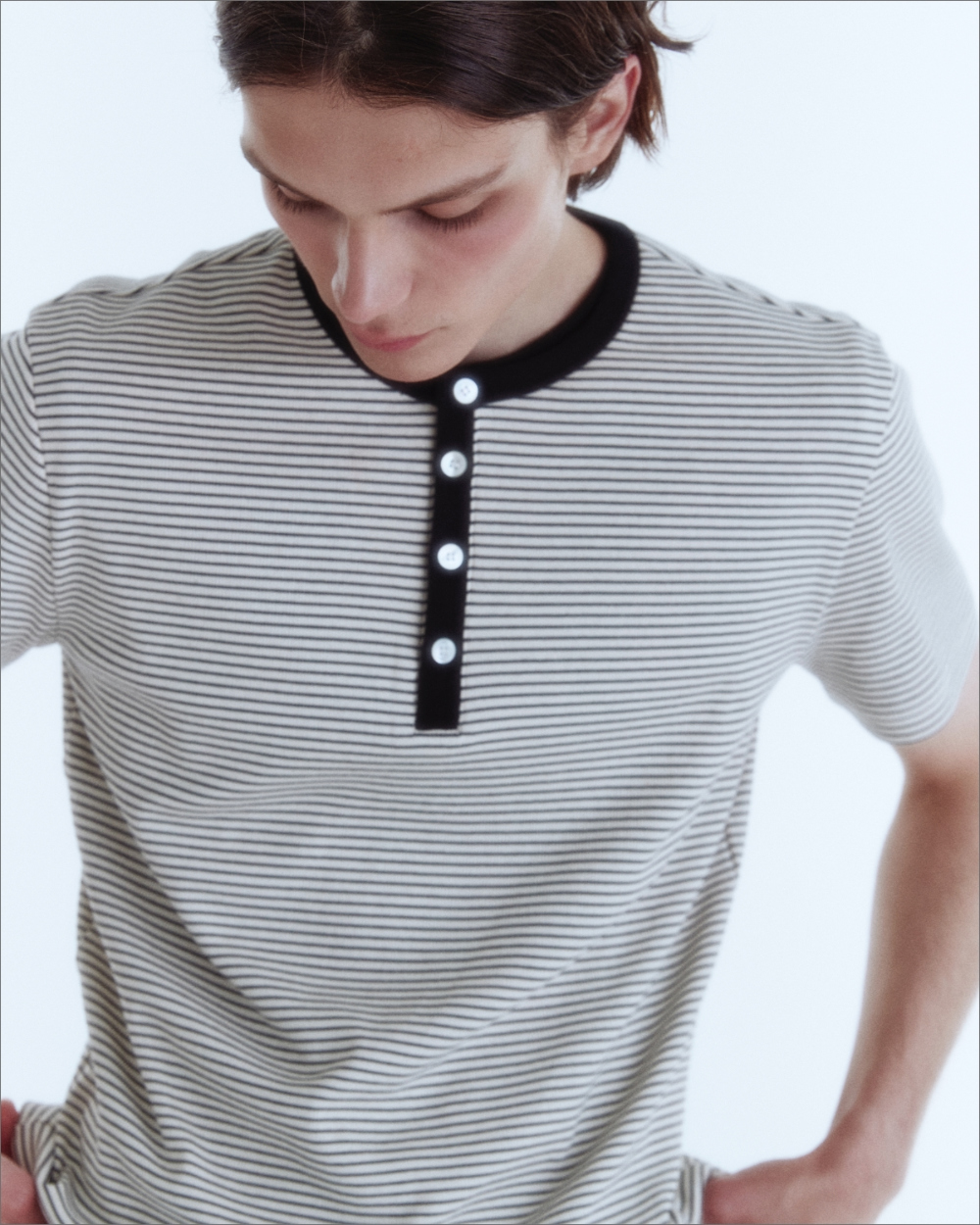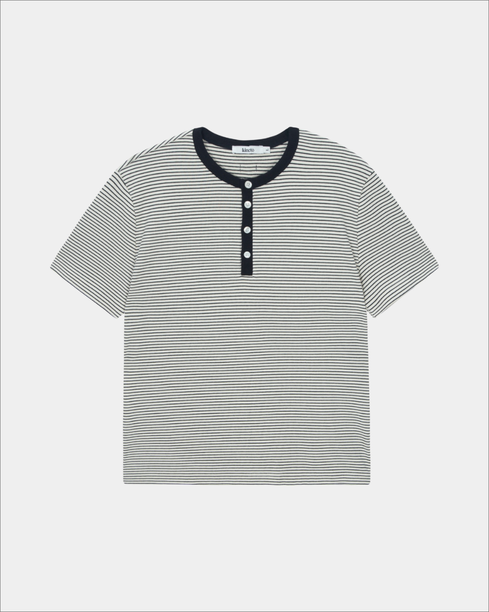 입체적인 립 조직감과 스트라이프가 매력적인 헨리넥 탑입니다.