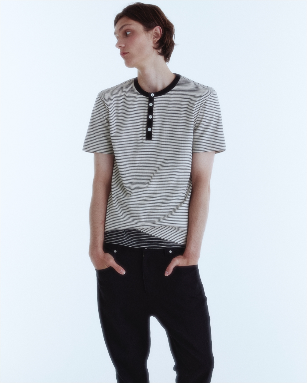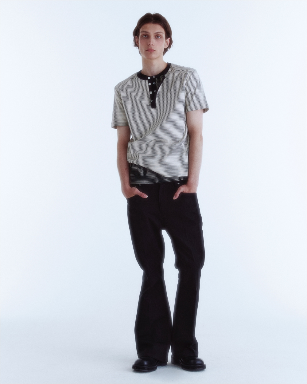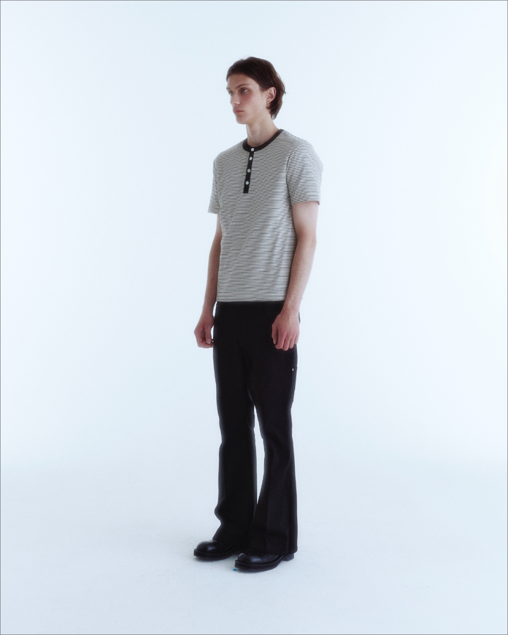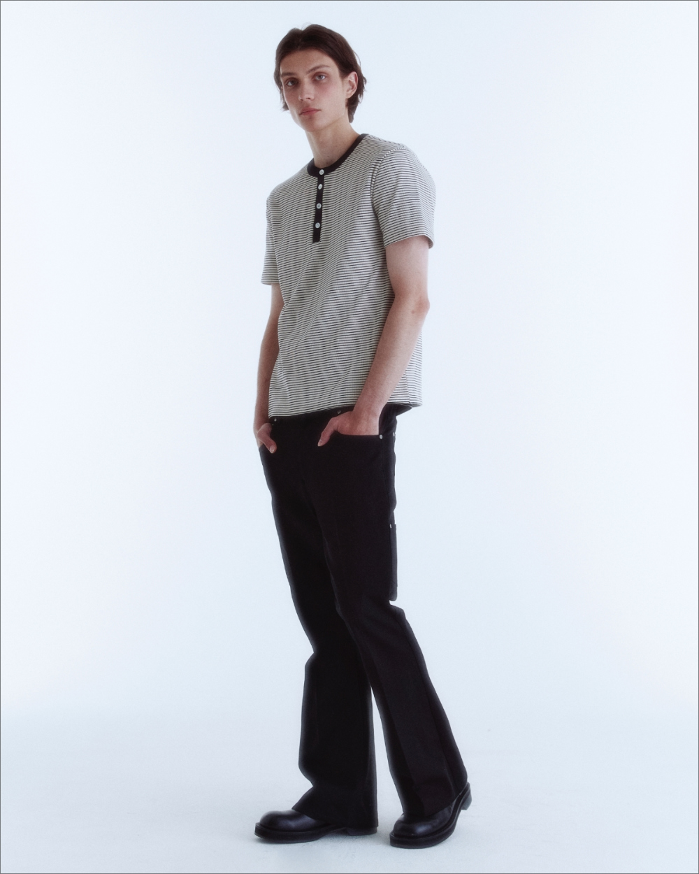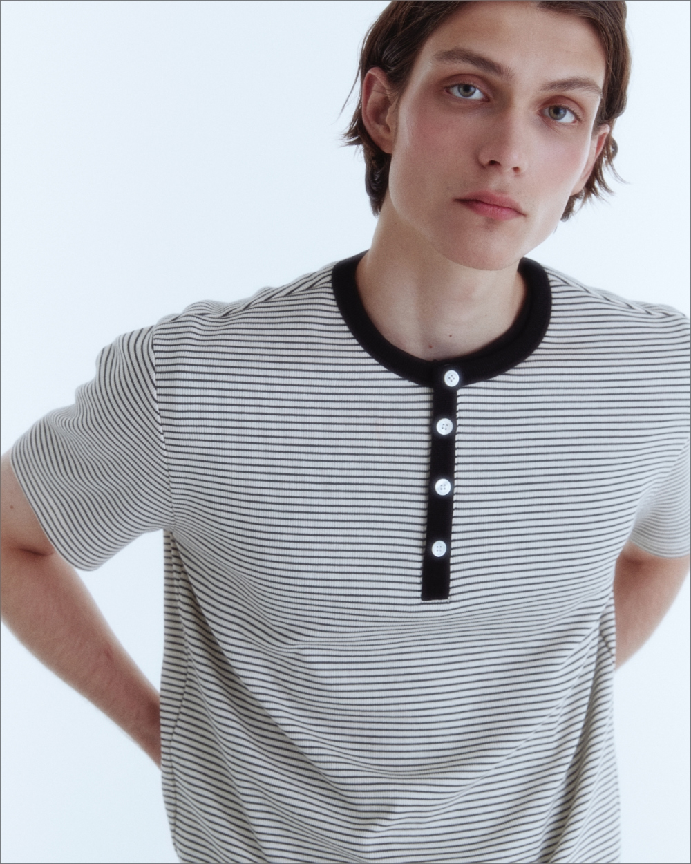 입체적인 립 조직감과 스트라이프가 매력적인 헨리넥 탑입니다.