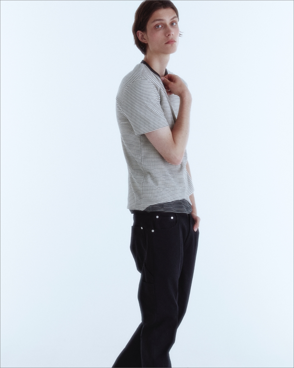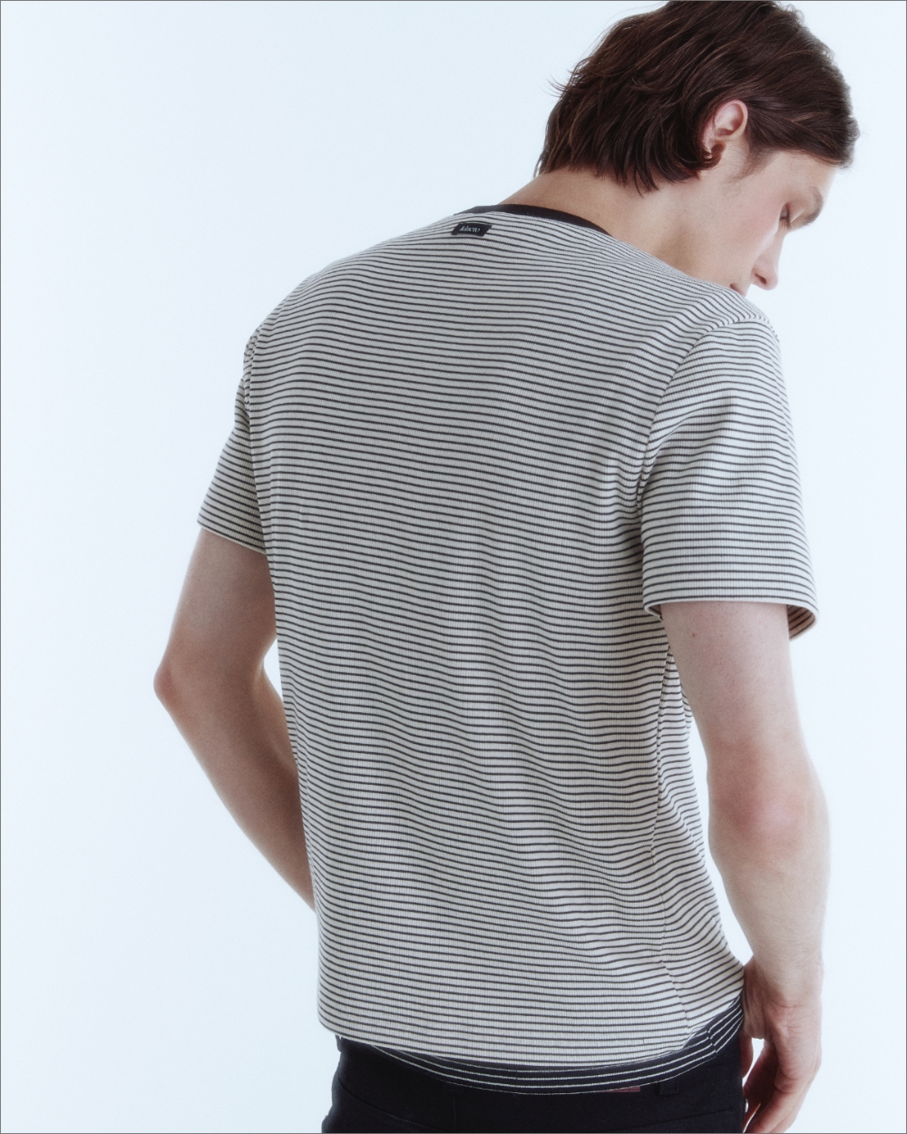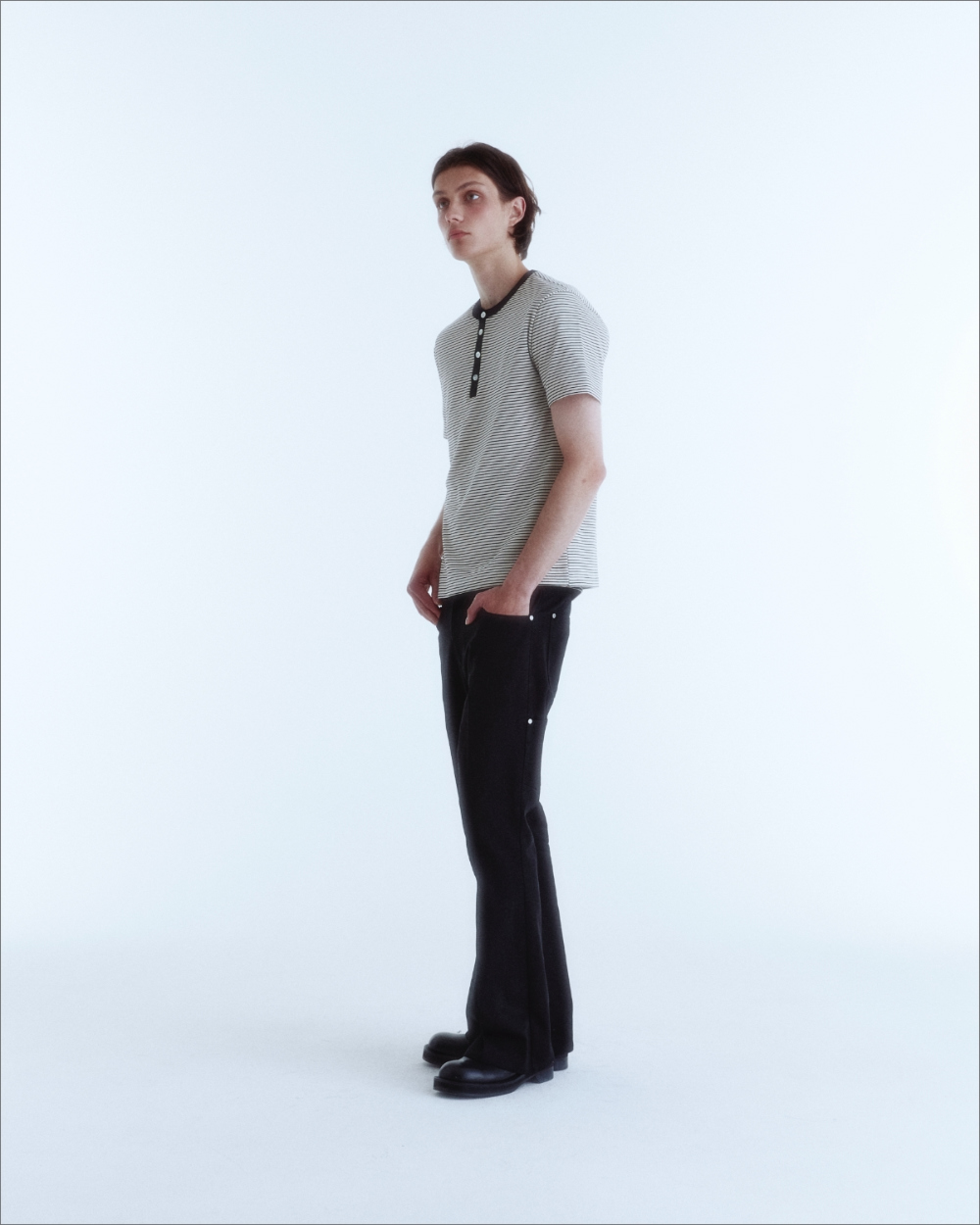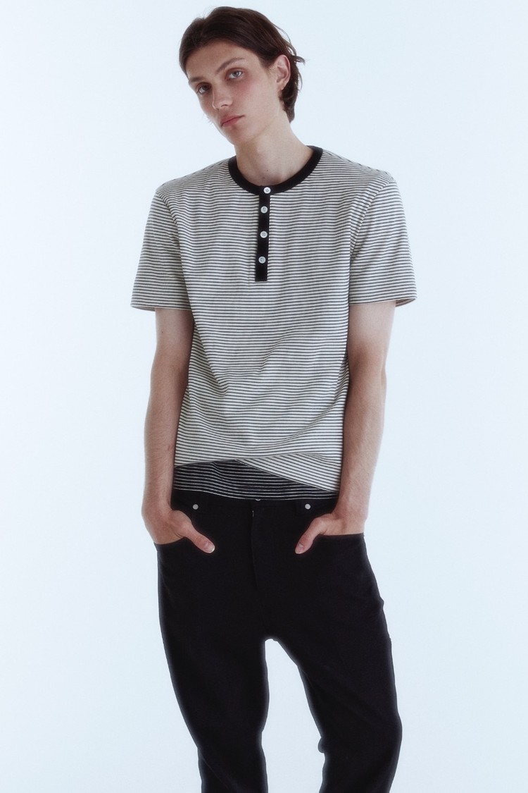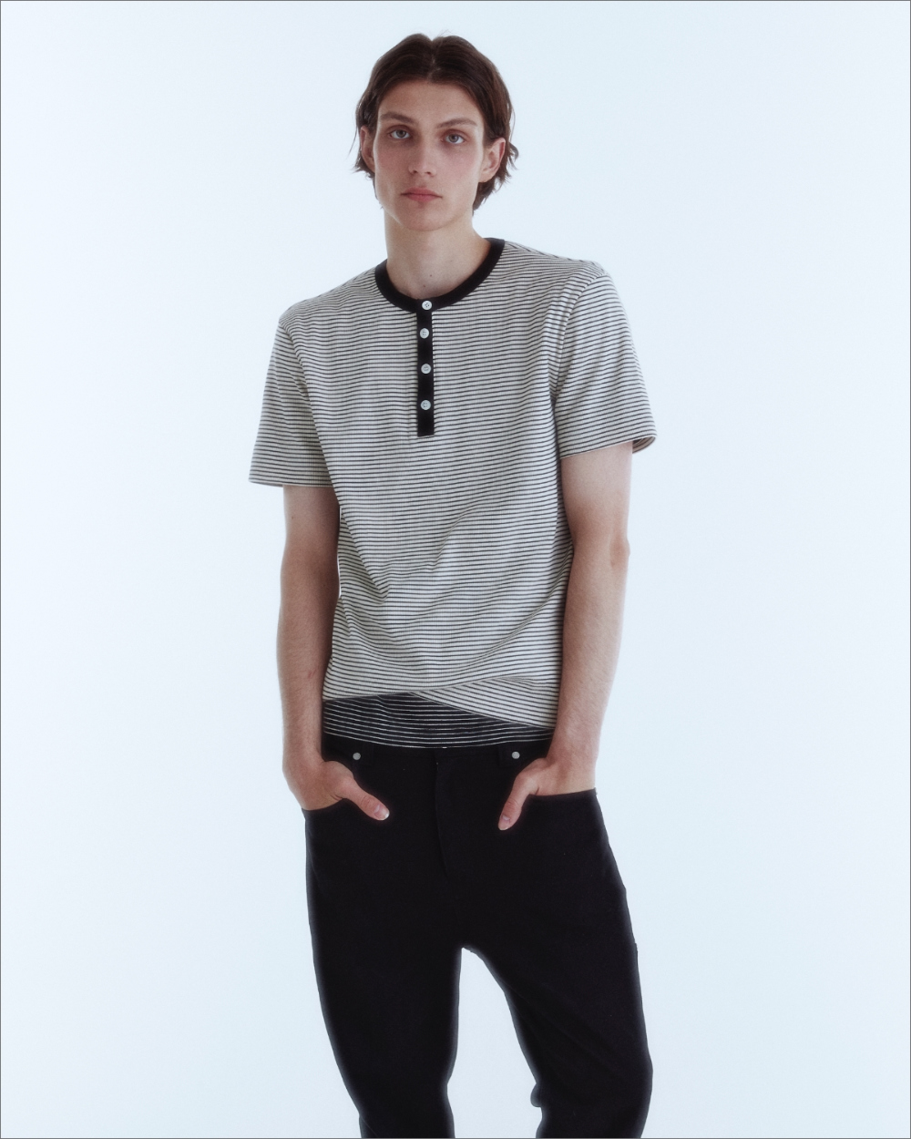 입체적인 립 조직감과 스트라이프가 매력적인 헨리넥 탑입니다.