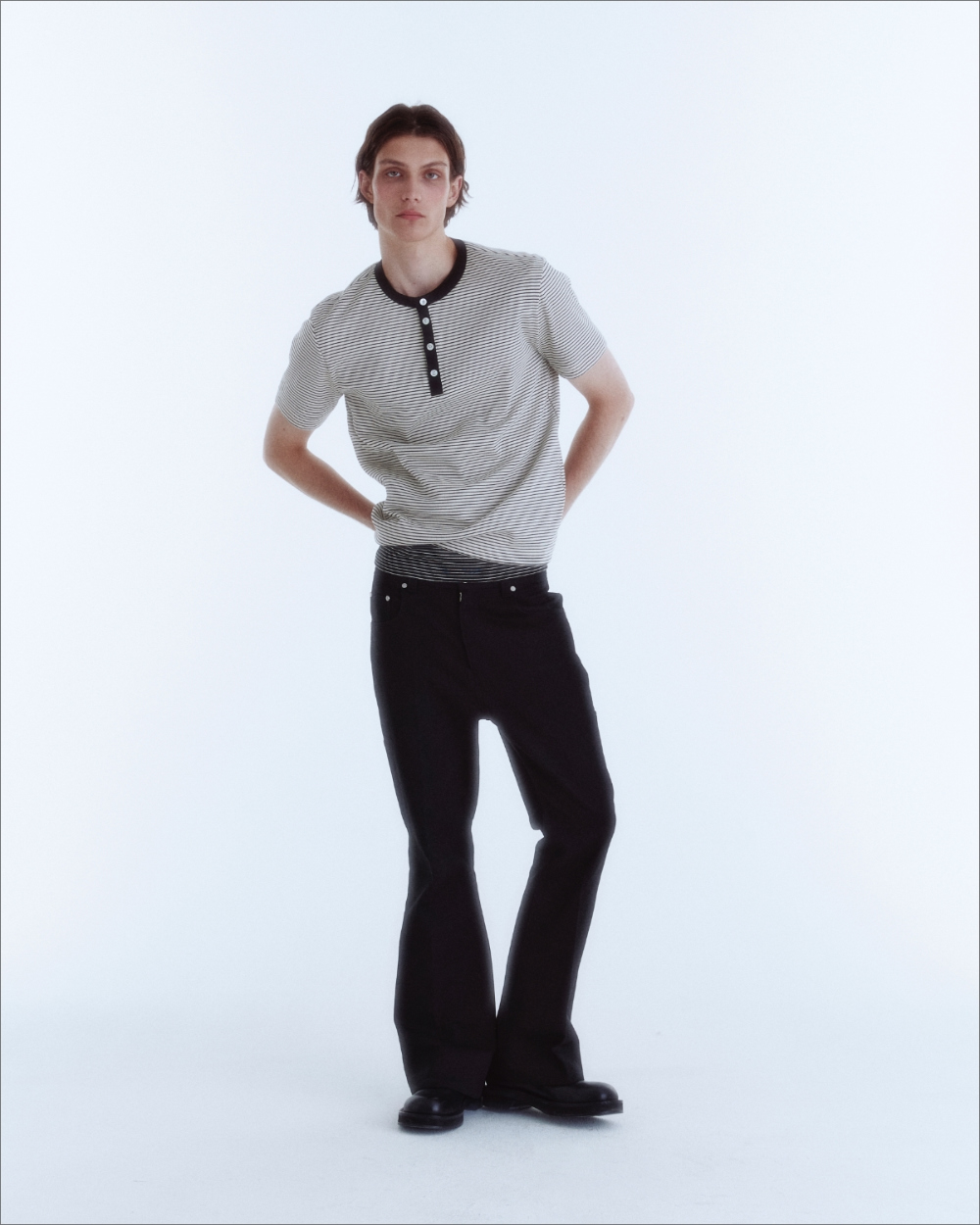 넥라인 과앞여밈에는 단색 립 조직으로 배색하여 캐주얼하면서도 위트 있게 착용이 가능 하며, 로고가 각인된 자개단추로 포인트를 더하였습니다.