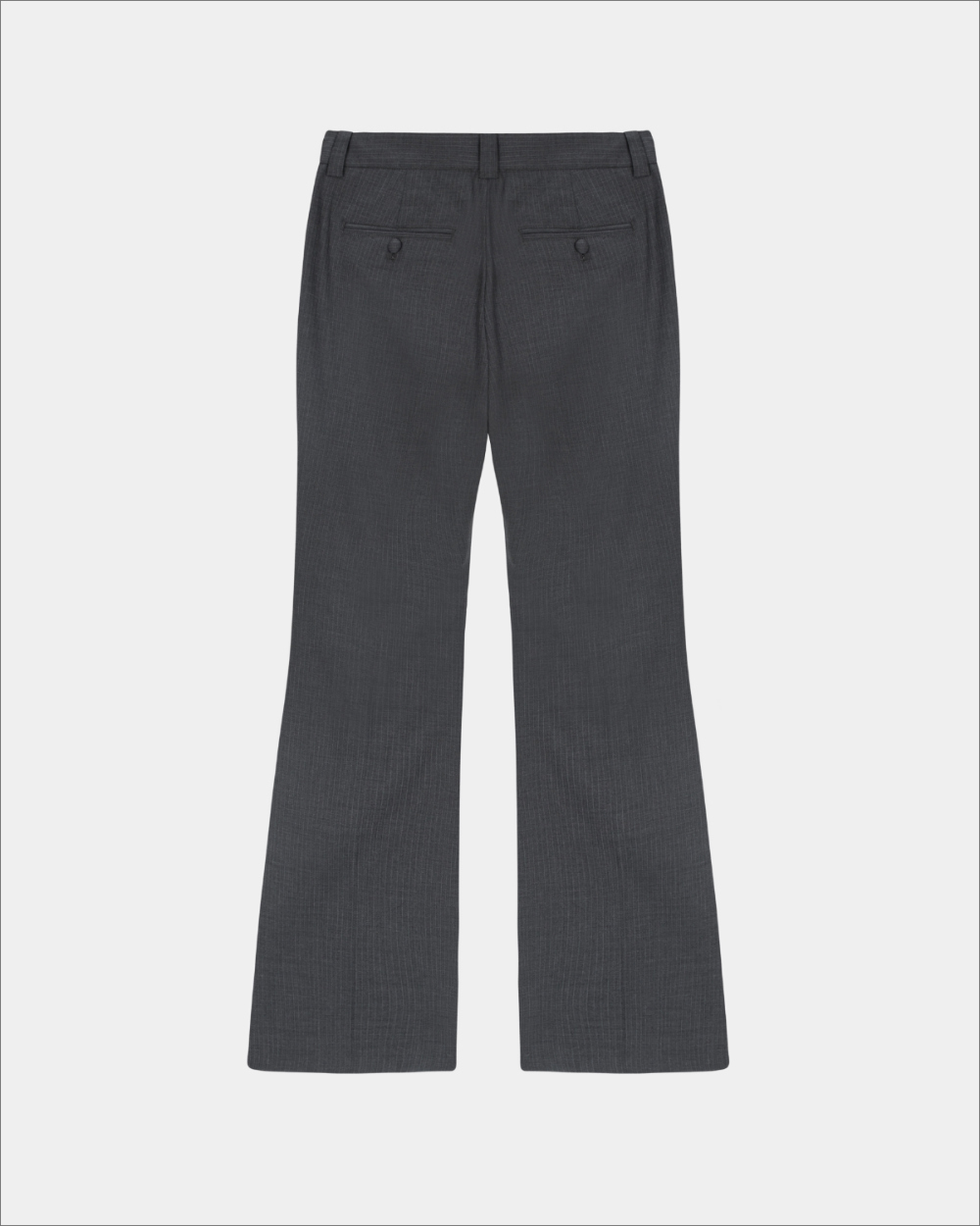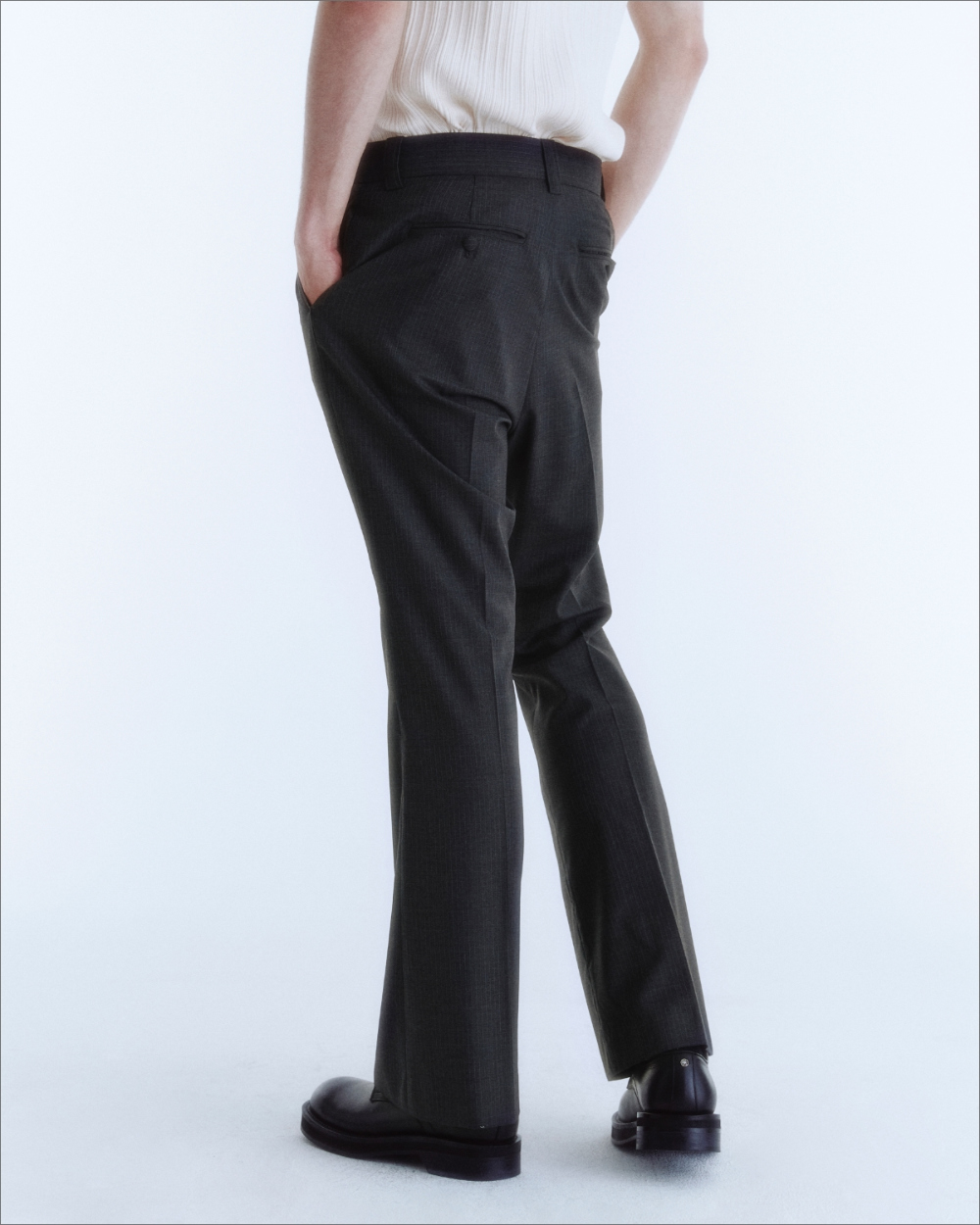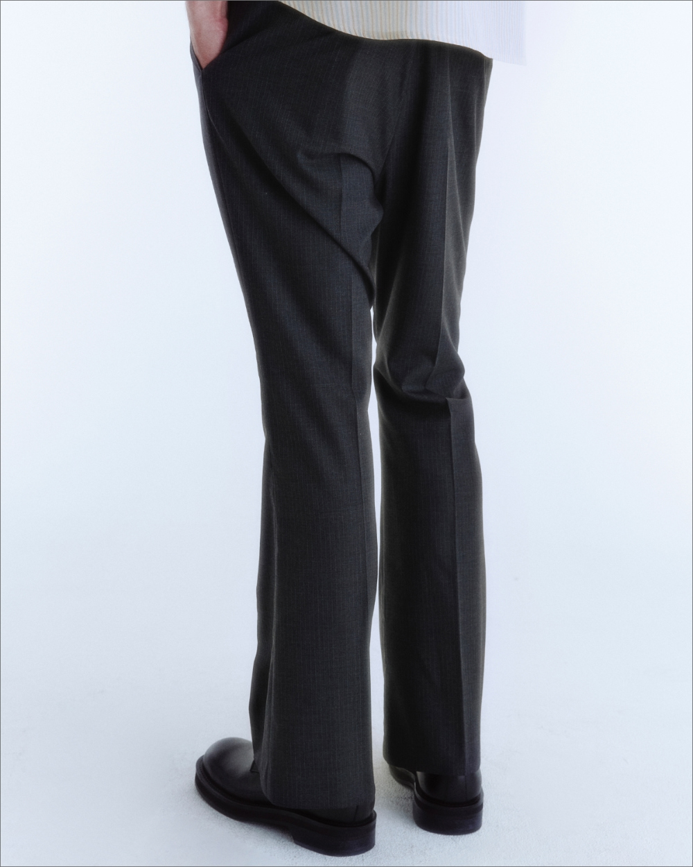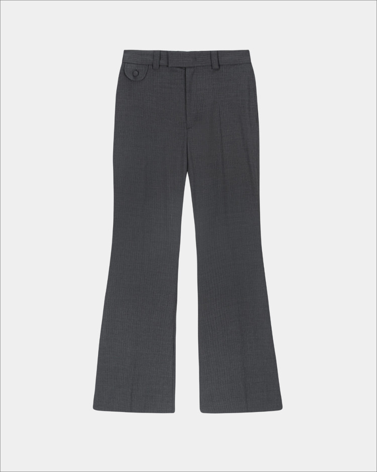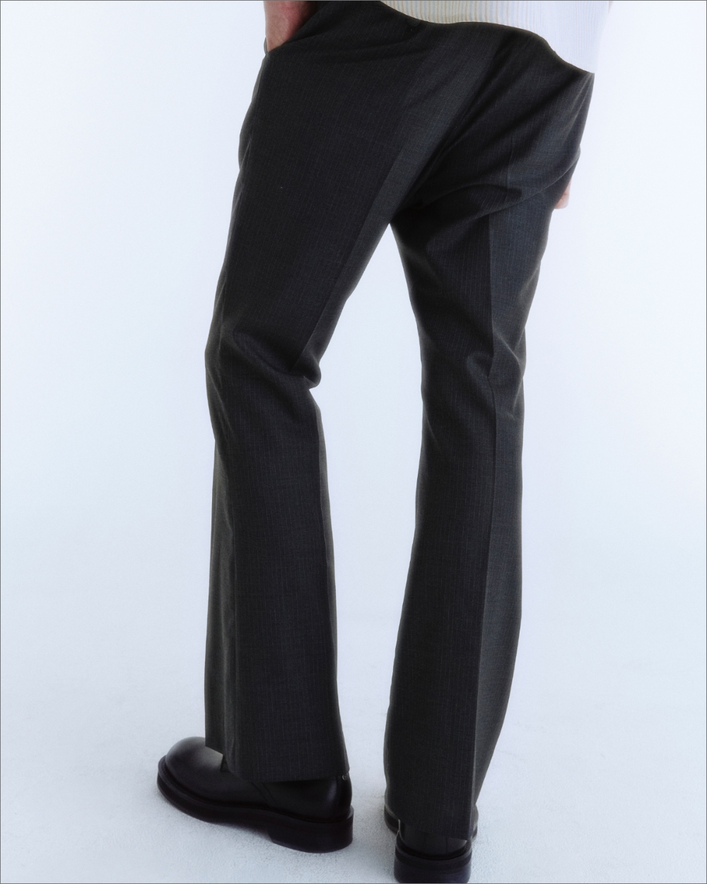 울과 캐시미어 혼방의 유연한 소재감이 우아한 핀 스트라이프 패턴의 플레어 팬츠입니다.