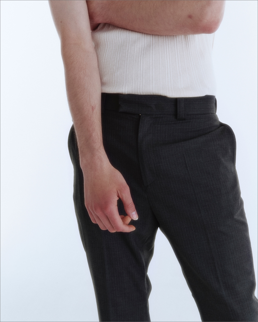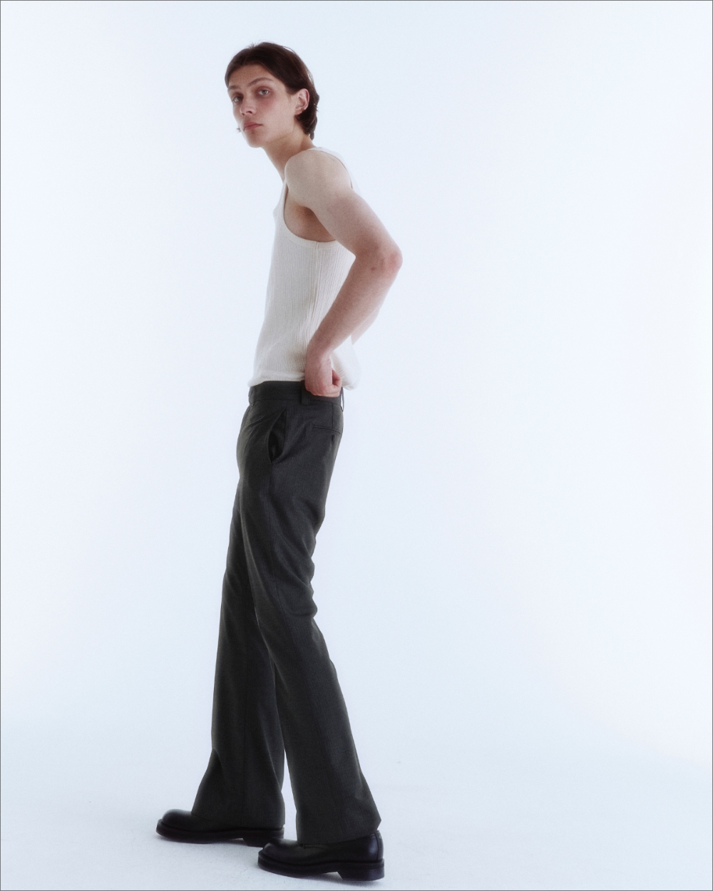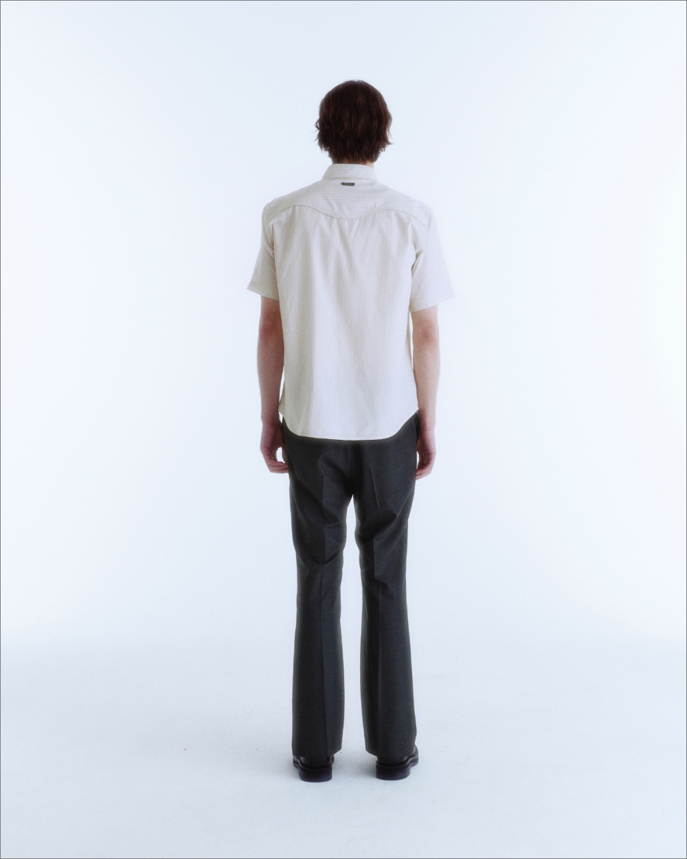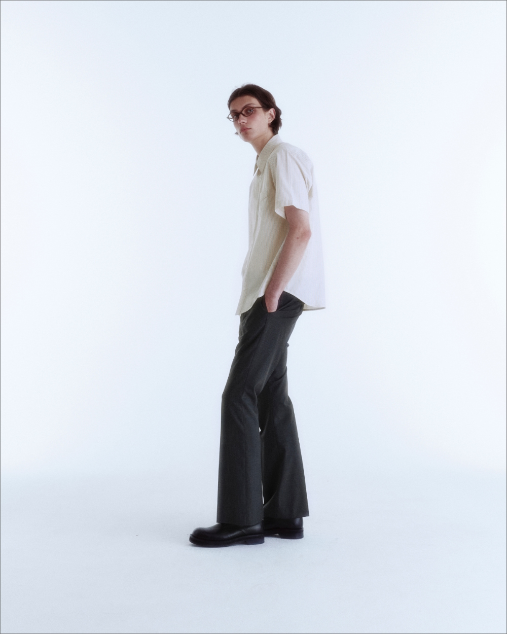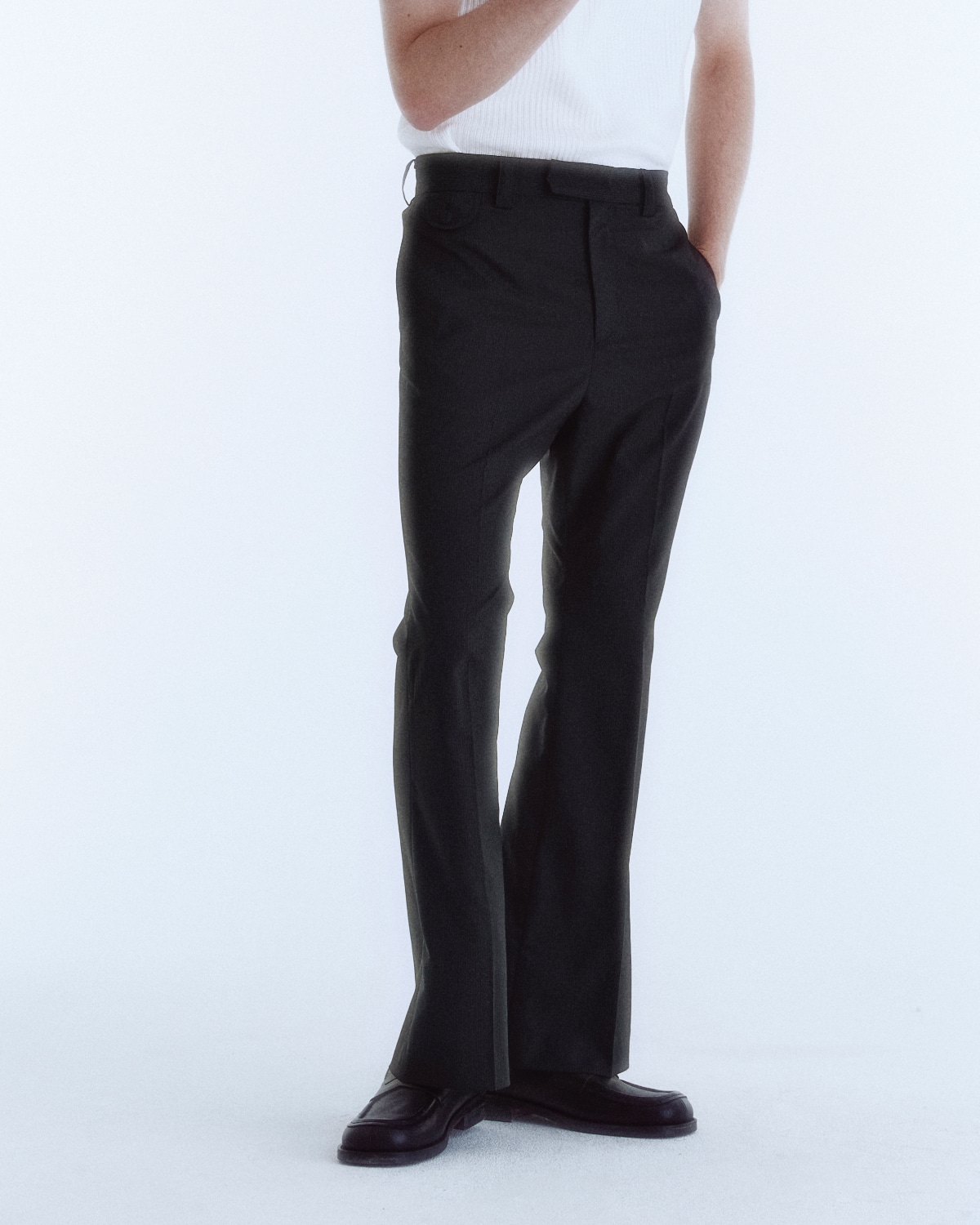 울과 캐시미어 혼방의 유연한 소재감이 우아한 핀 스트라이프 패턴의 플레어 팬츠입니다.