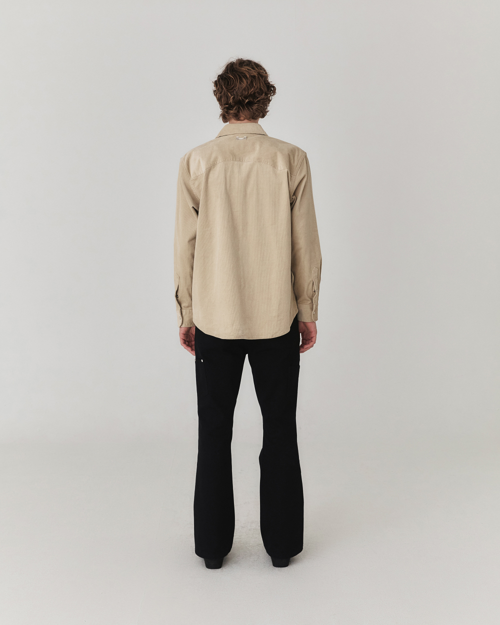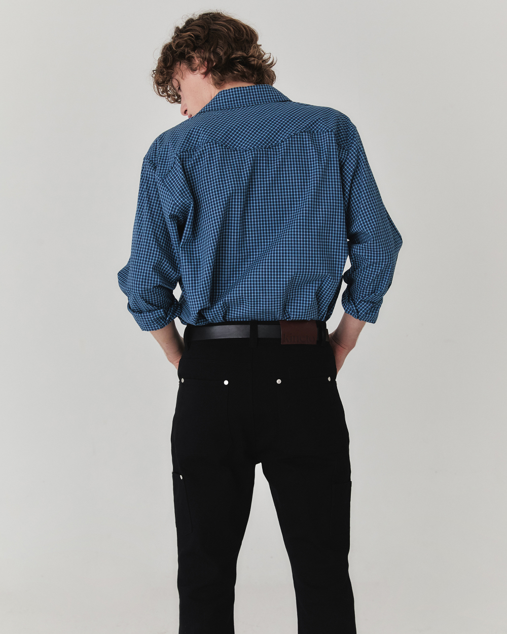 후면부에 워크웨어 팬츠에서 사 용되는 카펜터 포켓 디테일을 차용하여 와일드한 무드와 함께 위트있게 표현 하였습니다.