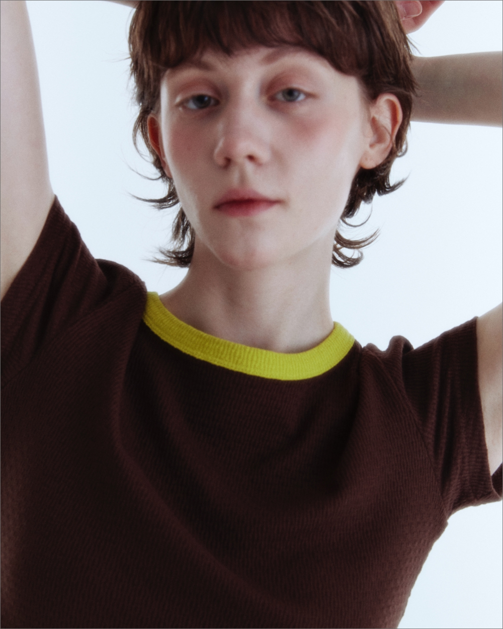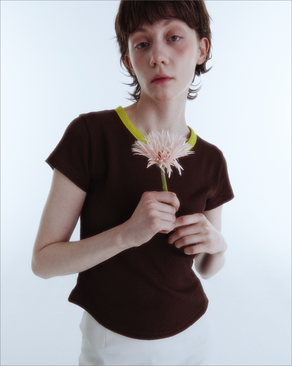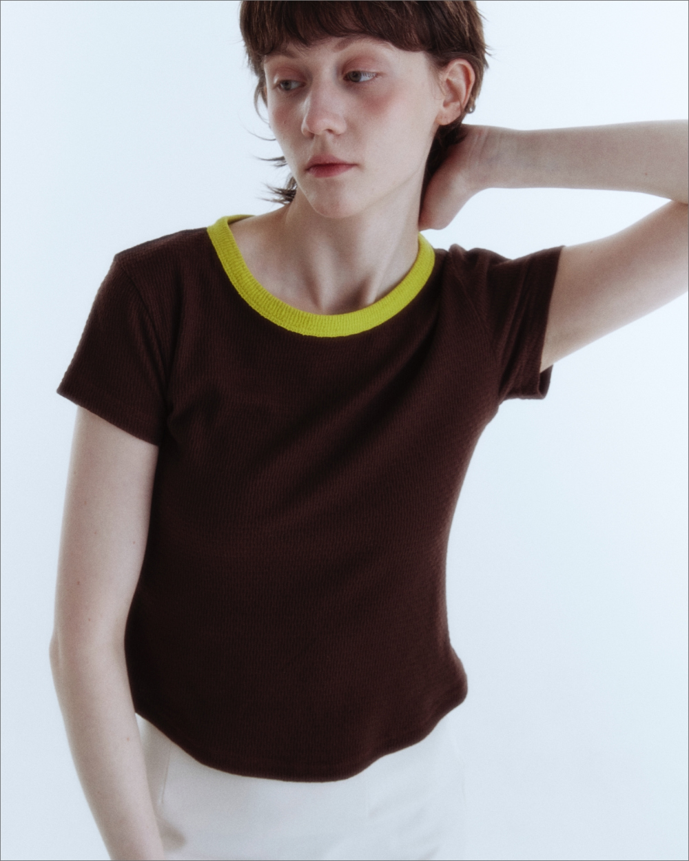 입체감 있는 립 조직감의 소프트한 터치감이 감각적인 크롭 티셔츠 입니다.