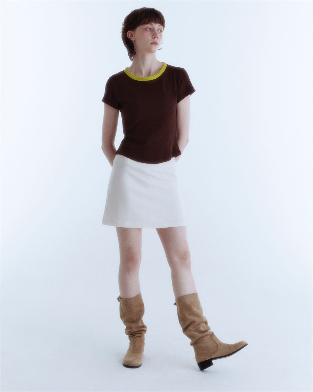 슬림한 실루엣의 크롭한 기장감의 제품으로 밑단의 곡선 형태의 라인은 보다 여성스러운 무드를 표현합니다.