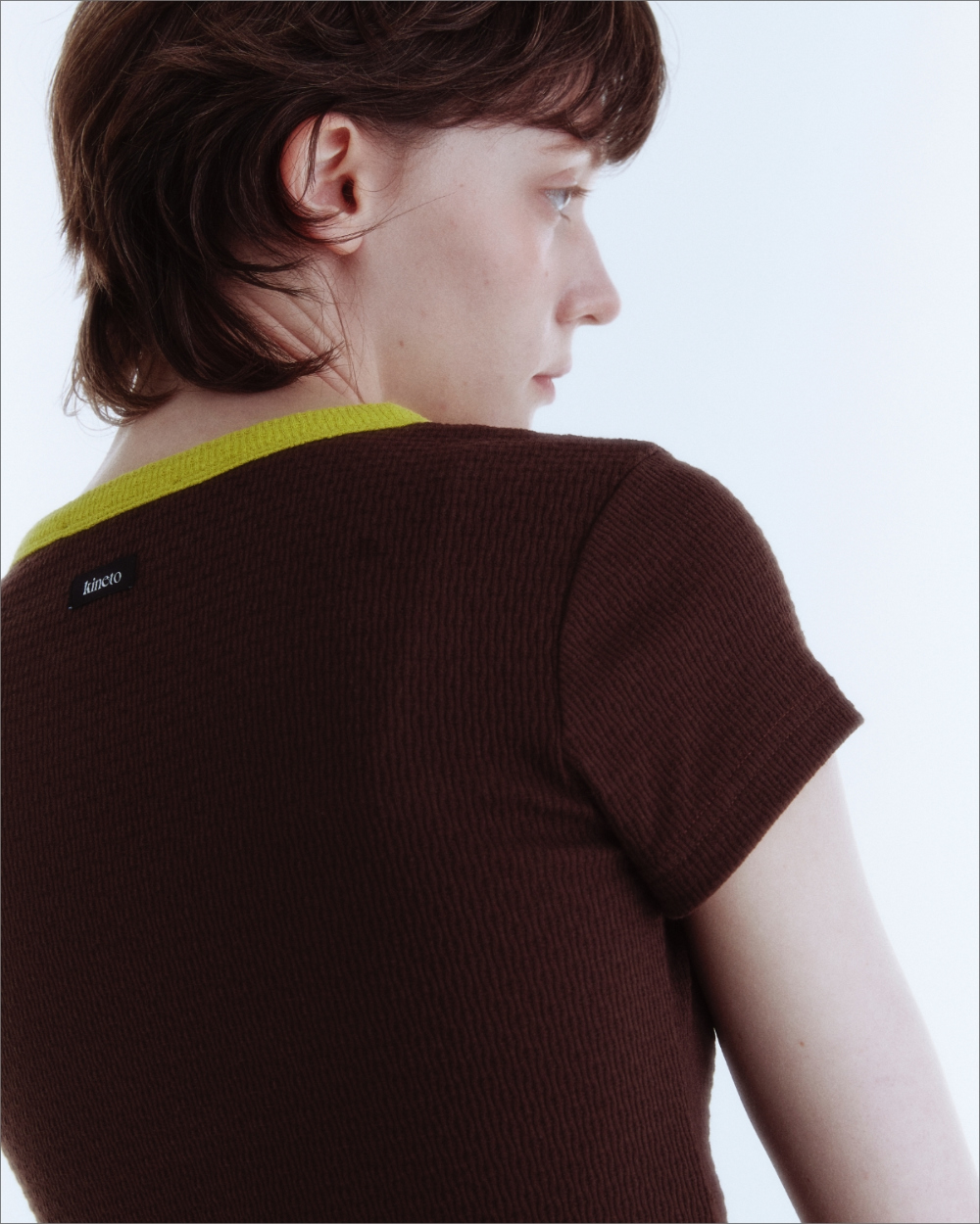 네크라인에는 컬러 배색과 바인딩 처리하여 늘어남을 방지하며 캐주얼하면서도 매력적인 무드를 나타냅니다.