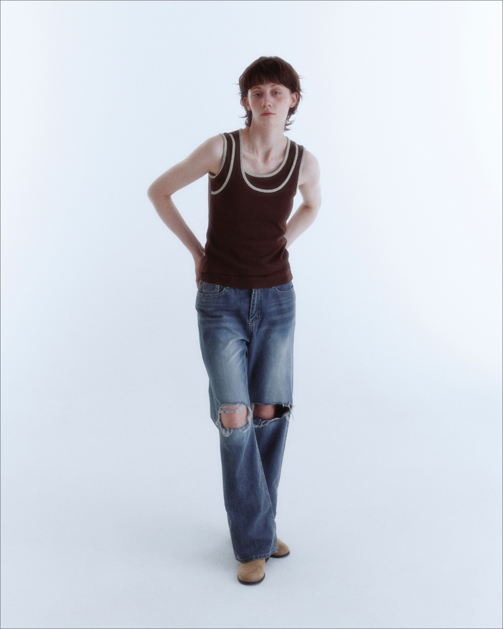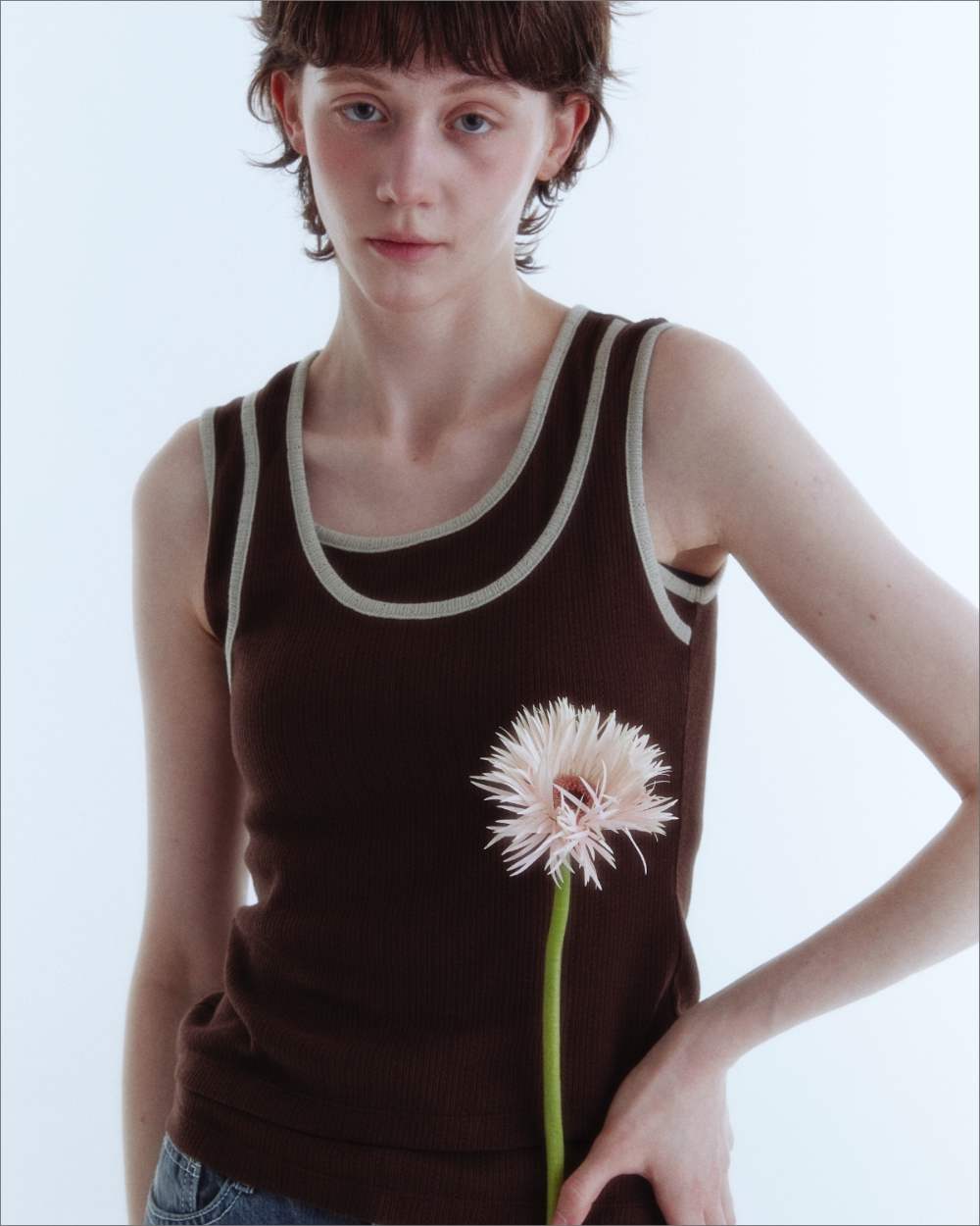 입체감 있는 립 조직감의 소프트한 터치감이 감각적인 슬리브리스 탑입니다.