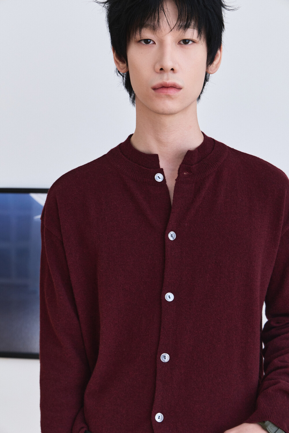 [WAVINESS] Double Frame Round Neck Cardigan Burgundy