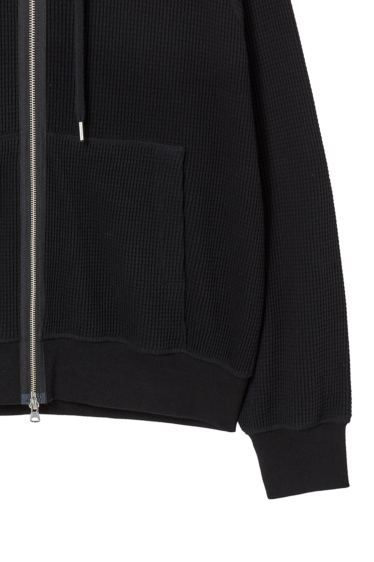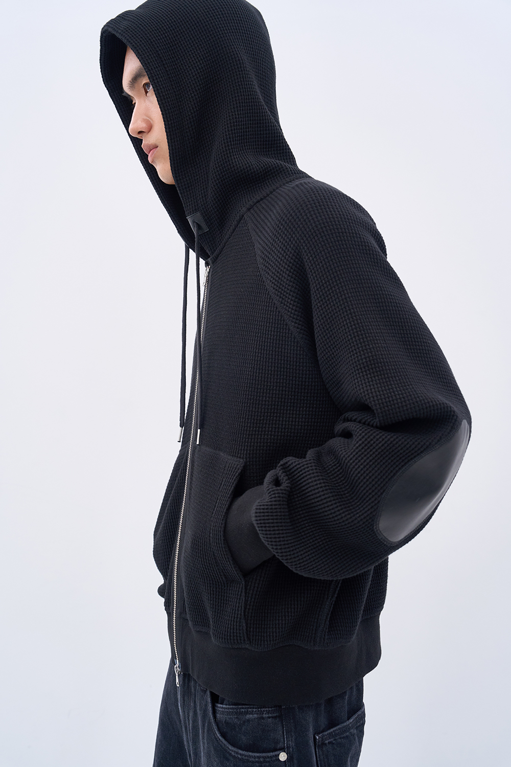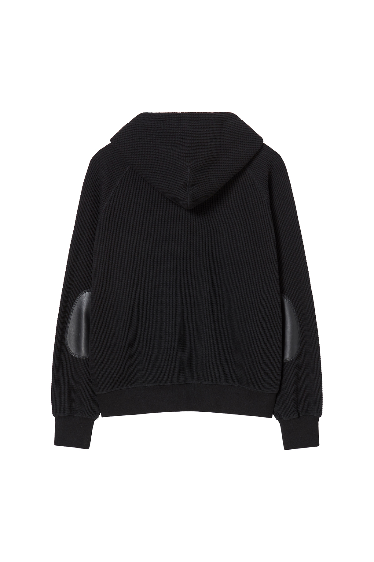 레더 패널 와플 집업 후디 블랙