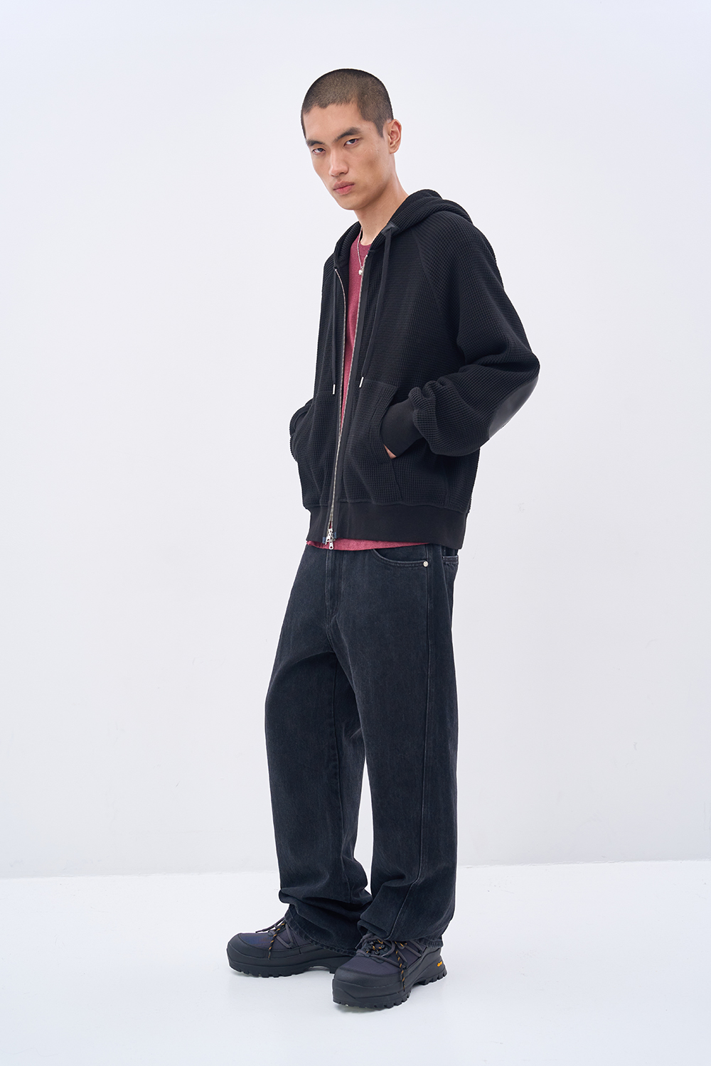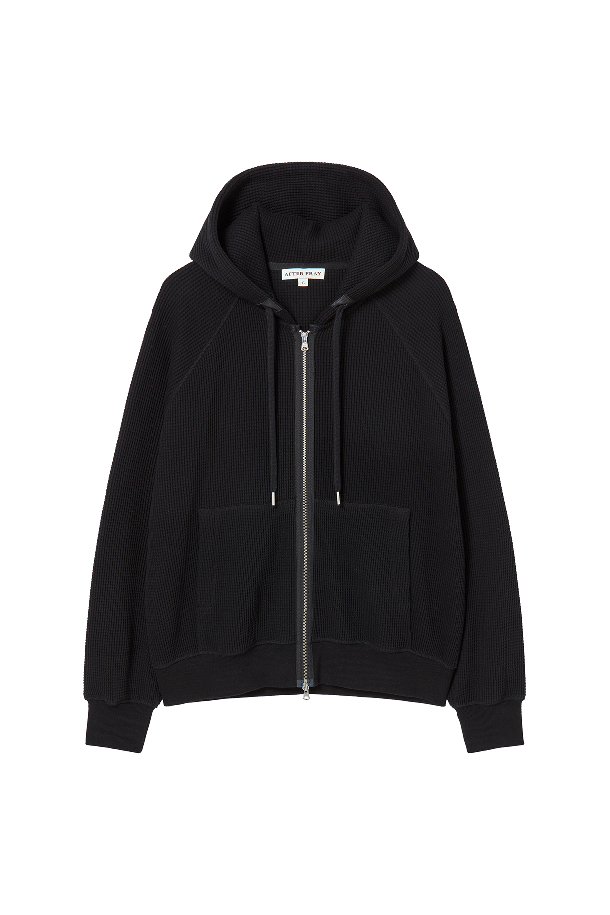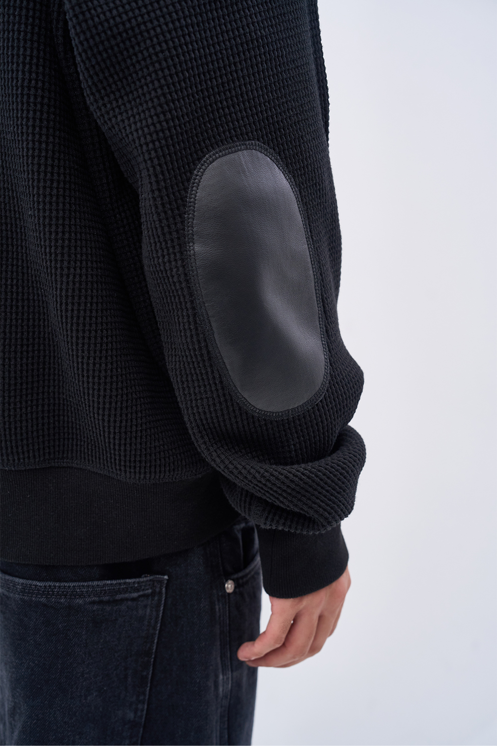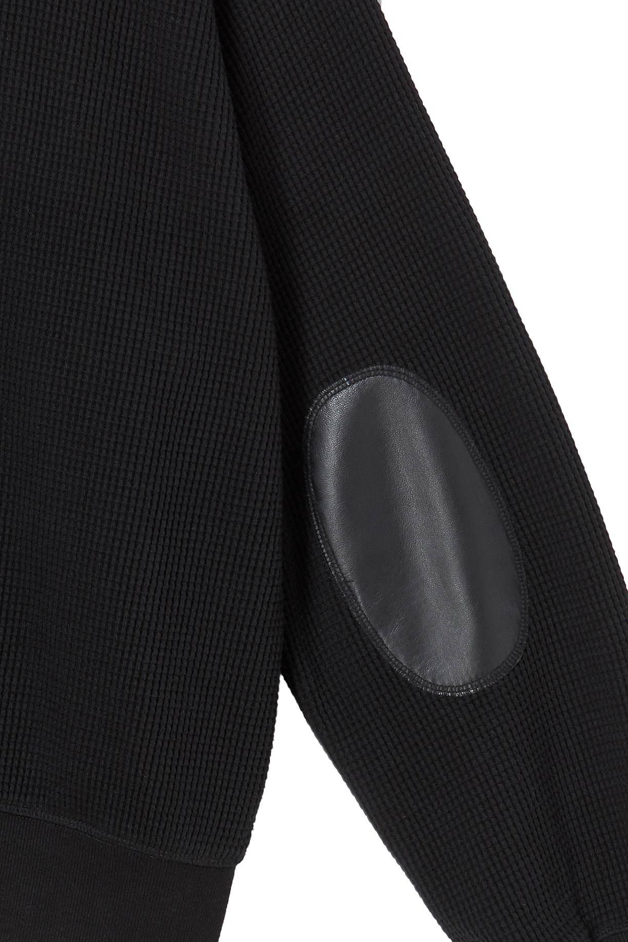 레더 패널 와플 집업 후디 블랙