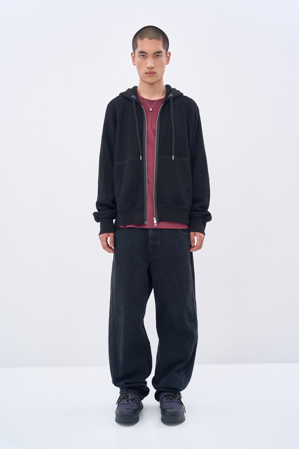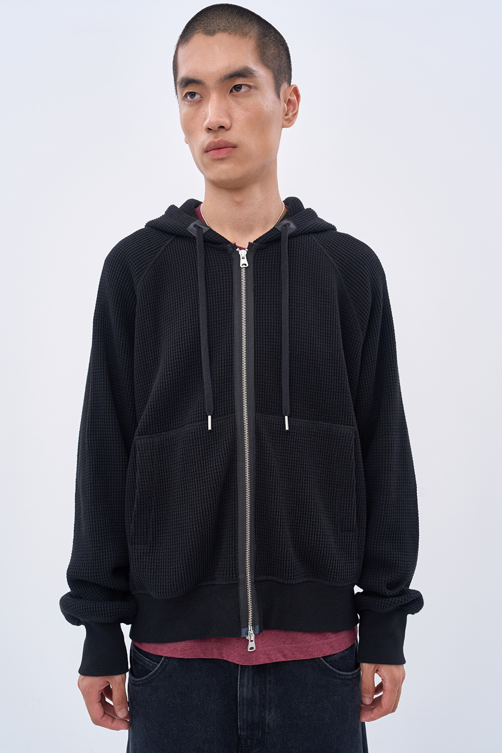 시즌을 거듭하며 디벨롭해온 캐리오버 아이템으로 완성한 와플 집업 후디. 더블 위브 조직으로 구현된 중량감 있는 와플 텍스처 코튼. 램스킨 엘보우 패치와 스트링 끝단의 가죽 트리밍으로 더한 절제된 포인트. 시그니처 캥거루 포켓과 2-Way YKK 지퍼가 전하는 실용성과 디테일의 균형. 세미 오버핏 실루엣으로 일상 속 자연스럽게 스며드는 캐주얼 무드.