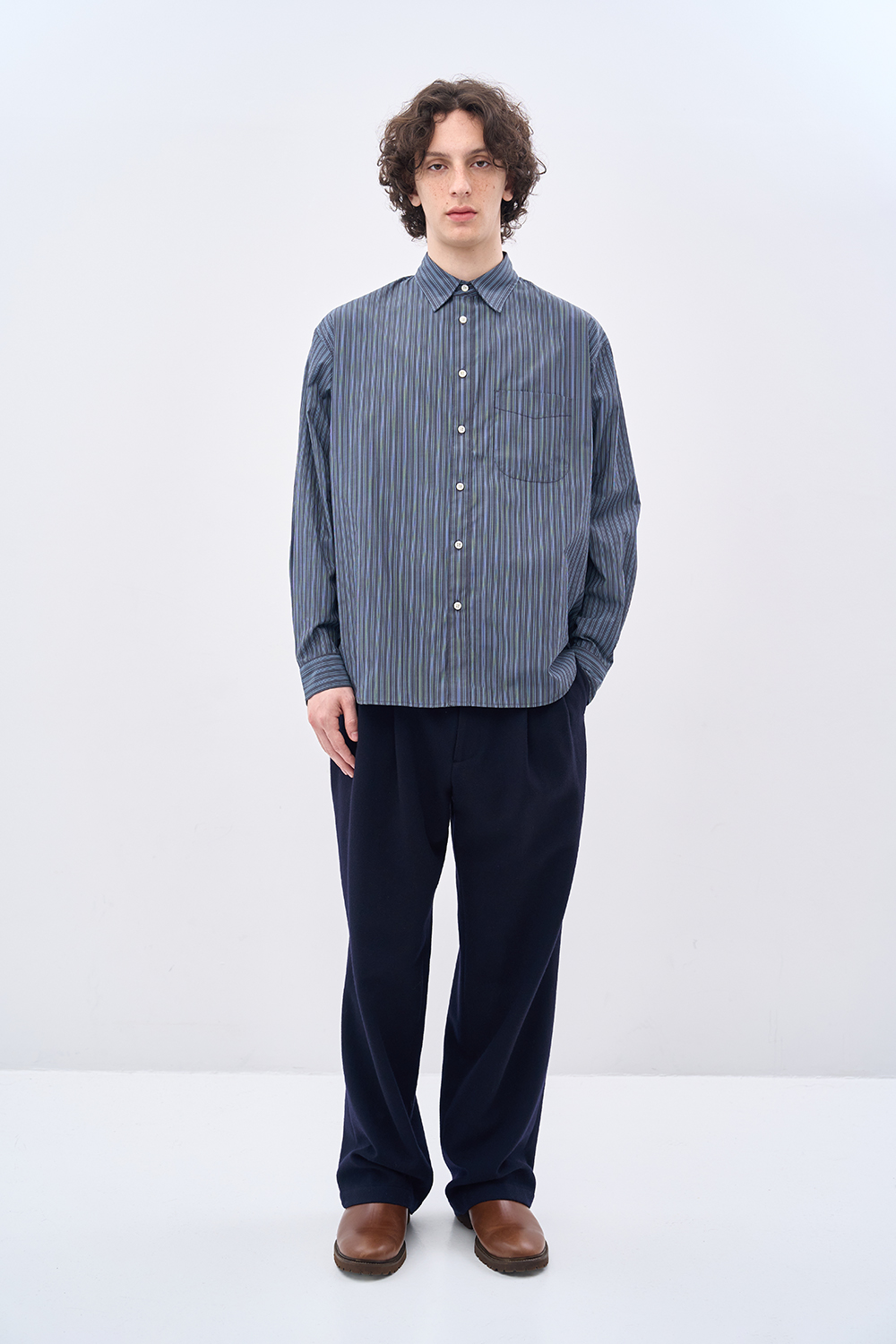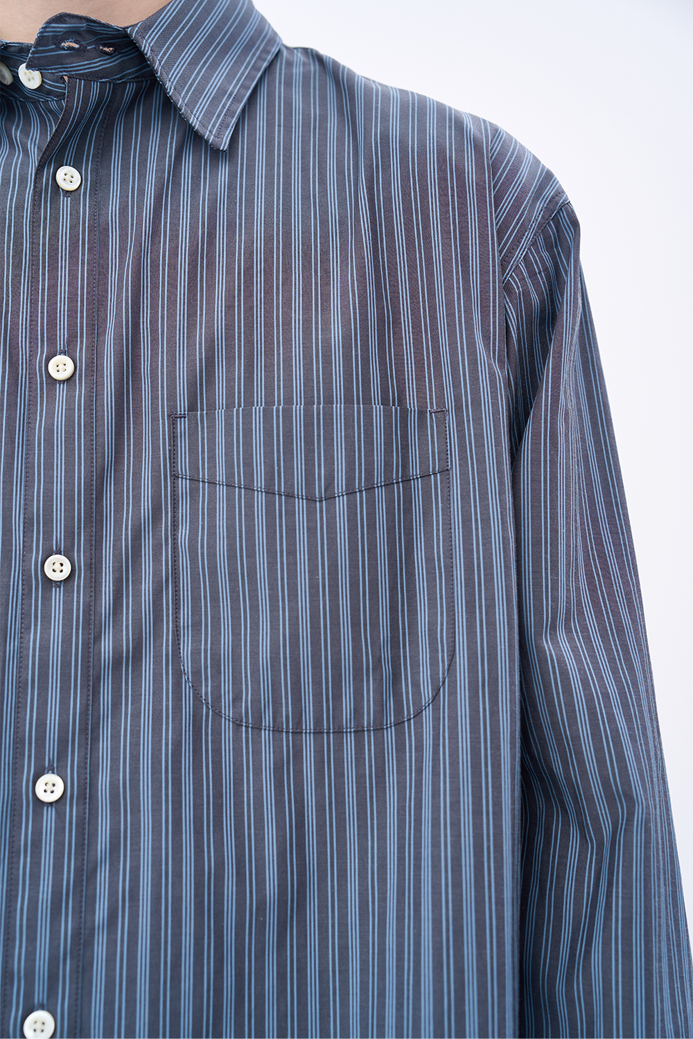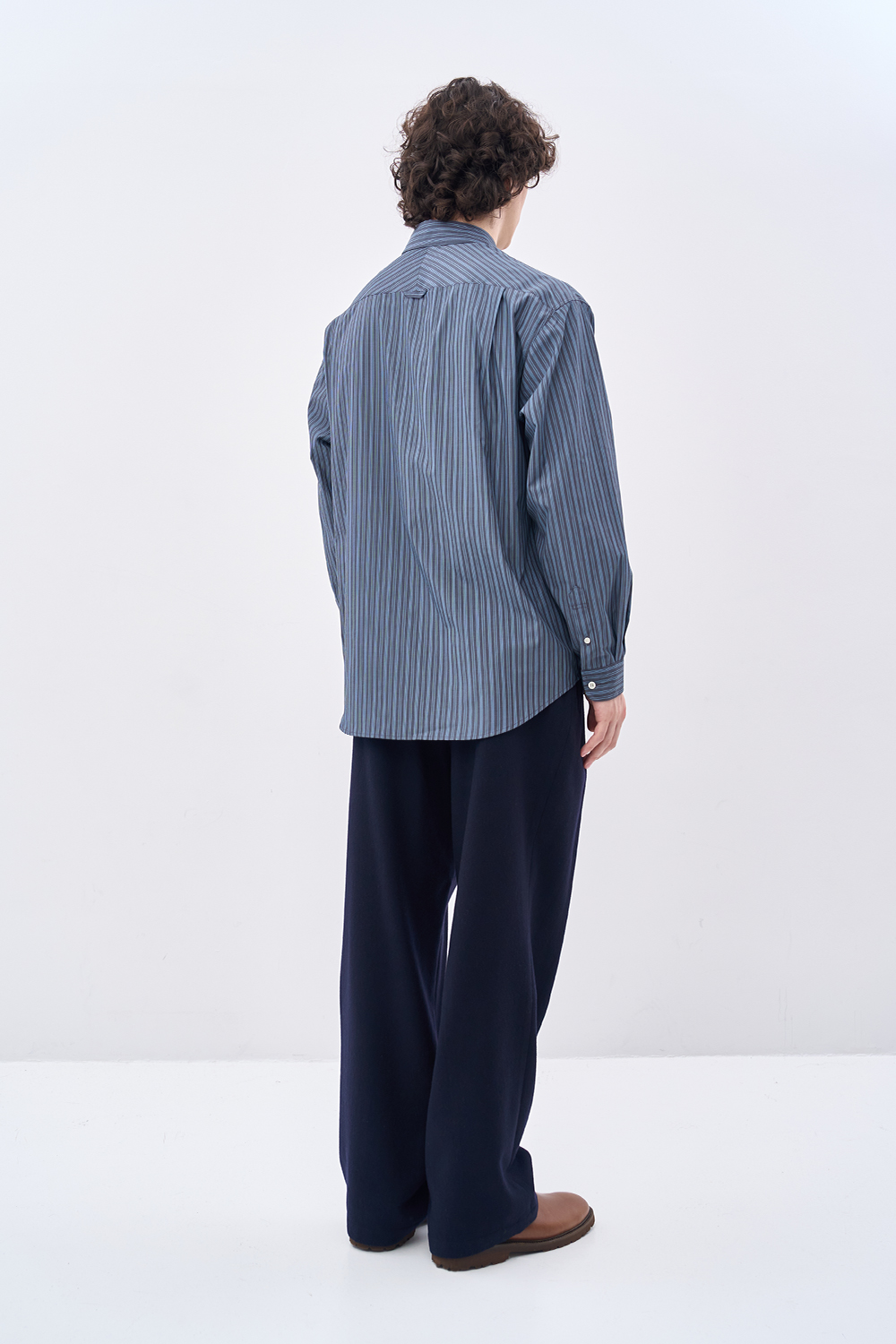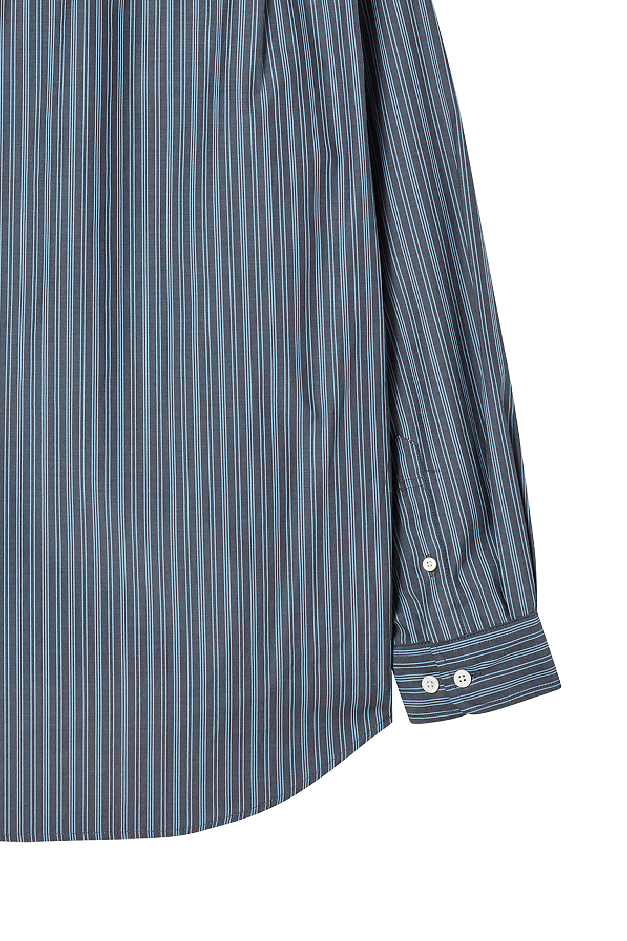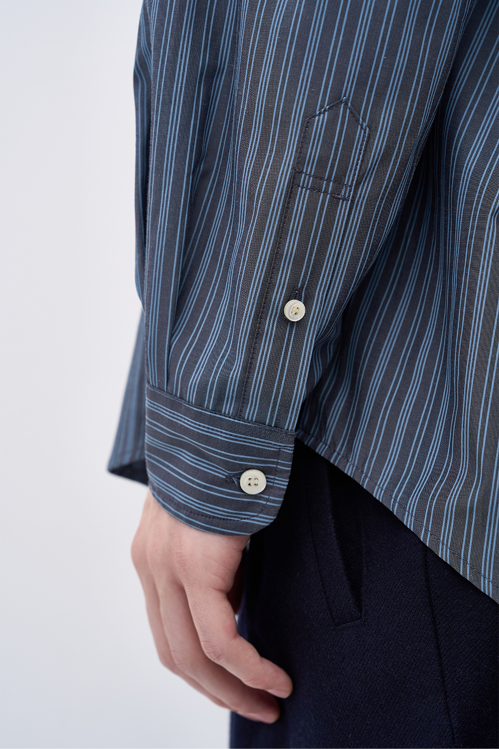 드레스 셔츠의 단정함에 위트를 더한 캐주얼한 디자인. 세 가지 컬러 원사가 직조된 스트라이프 코튼 특유의 은은한 깊이와 입체적인 질감. 워크웨어 무드를 반영한 카라 밴드 디테일. 절제된 구성 속에서 드러나는 담백한 디자인. 사계절 내내 다양한 스타일에 녹아드는 높은 활용도 높은 아이템.