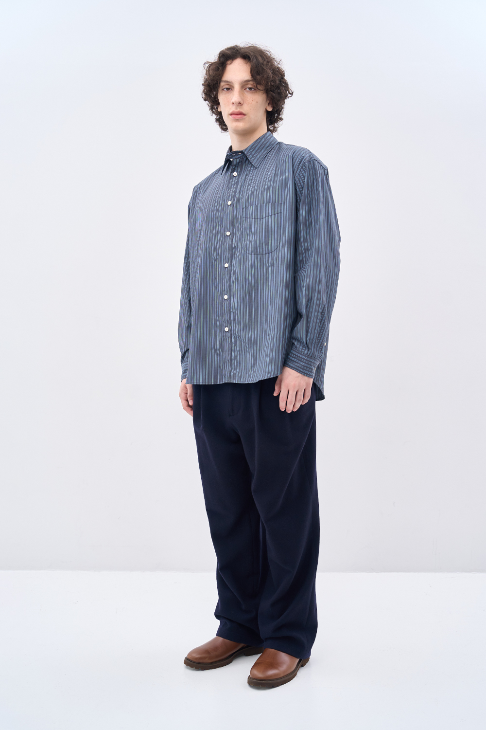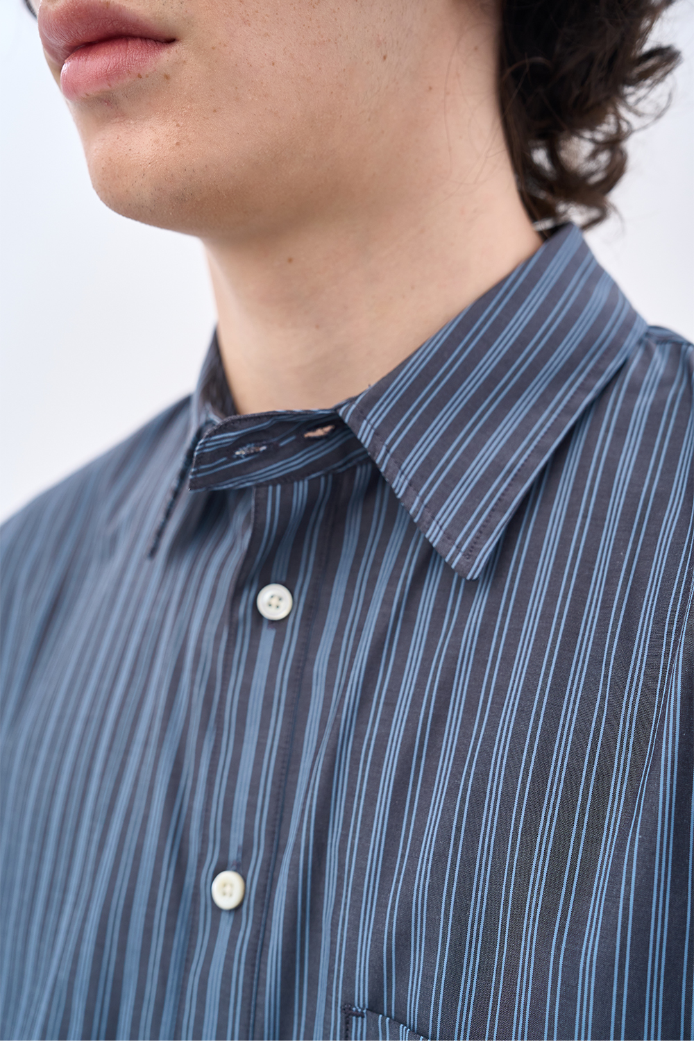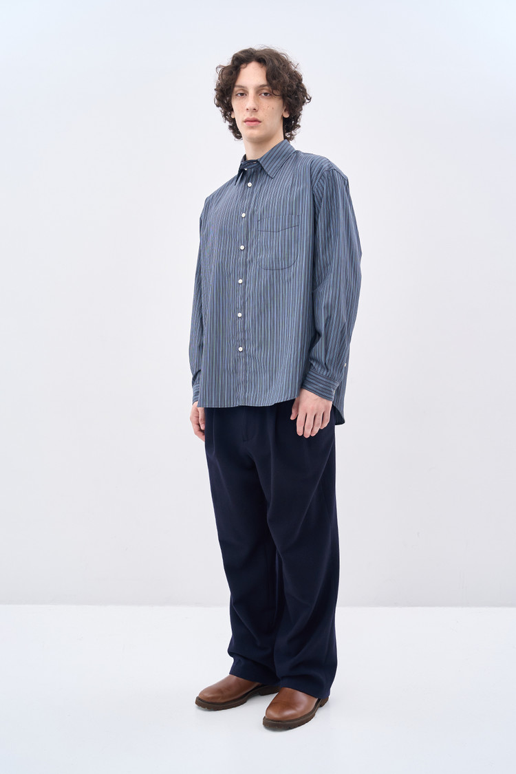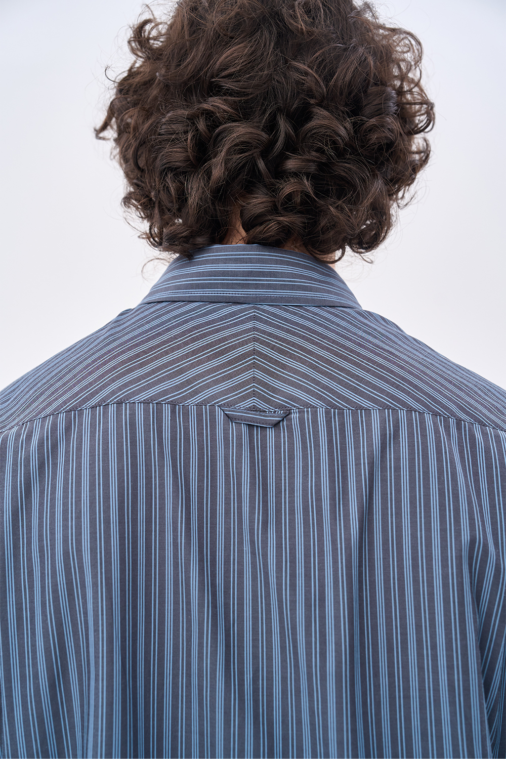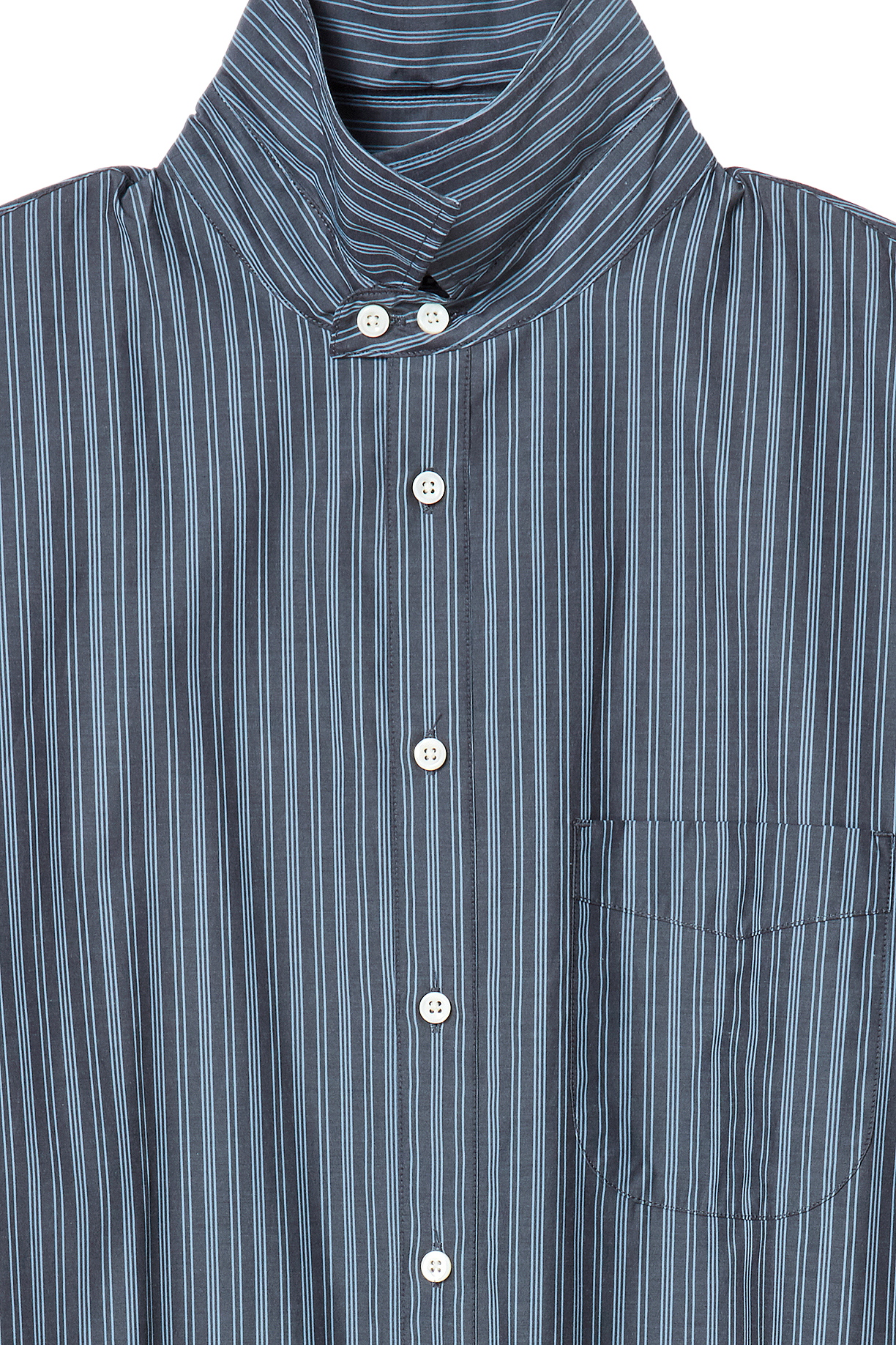 드레스 셔츠의 단정함에 위트를 더한 캐주얼한 디자인. 세 가지 컬러 원사가 직조된 스트라이프 코튼 특유의 은은한 깊이와 입체적인 질감. 워크웨어 무드를 반영한 카라 밴드 디테일. 절제된 구성 속에서 드러나는 담백한 디자인. 사계절 내내 다양한 스타일에 녹아드는 높은 활용도 높은 아이템.