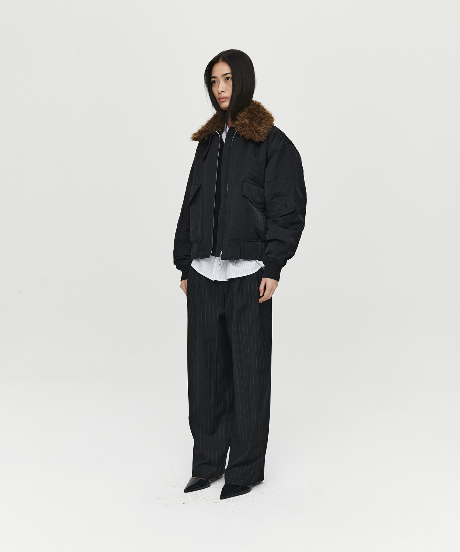 - 탈부착 가능한 퍼 칼라 포인트 밀리터리 봄버 재킷