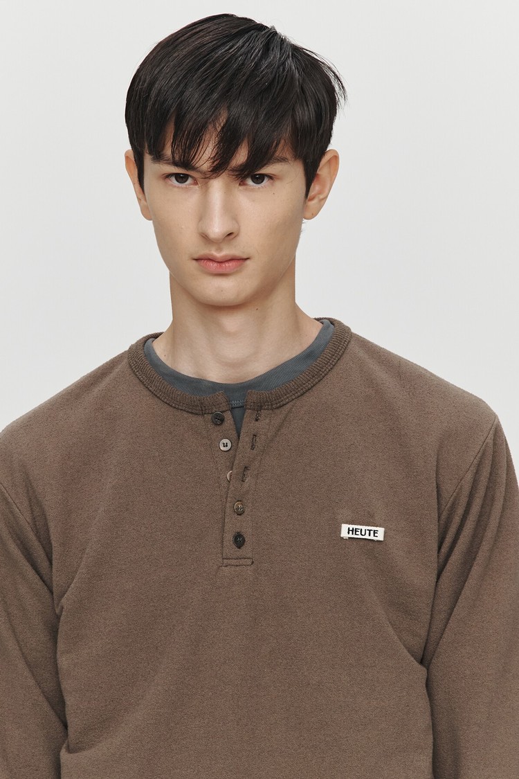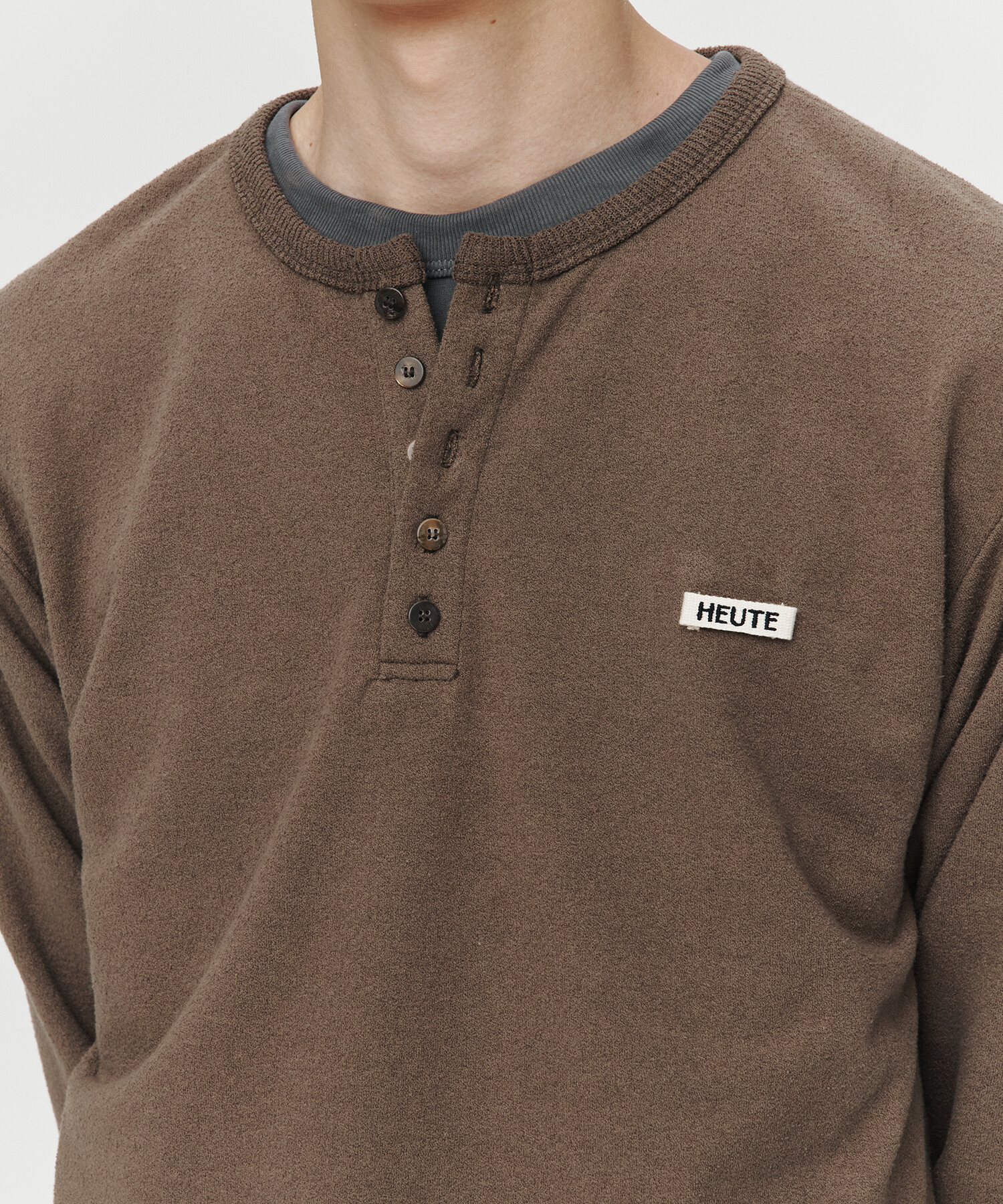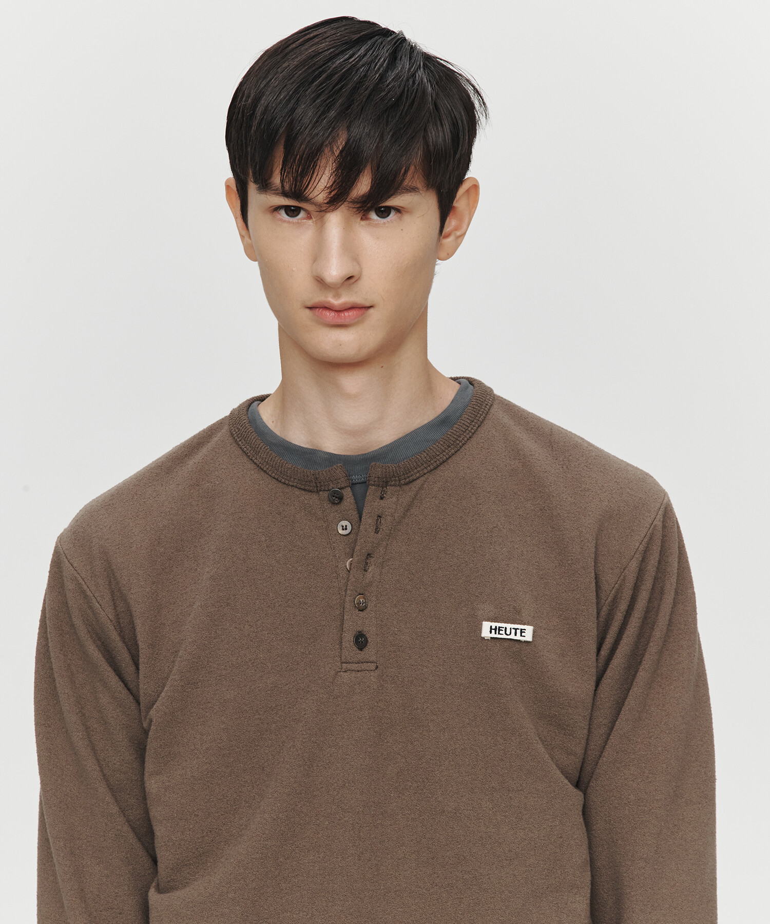 - 고밀도 부클 코튼 혼방 소재의 헨리 넥 티셔츠