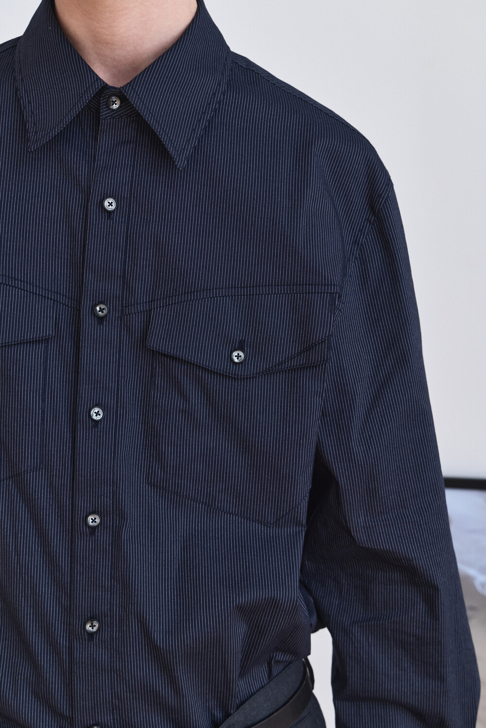 - 전면부 커브드한 디자인의 투포켓 셔츠