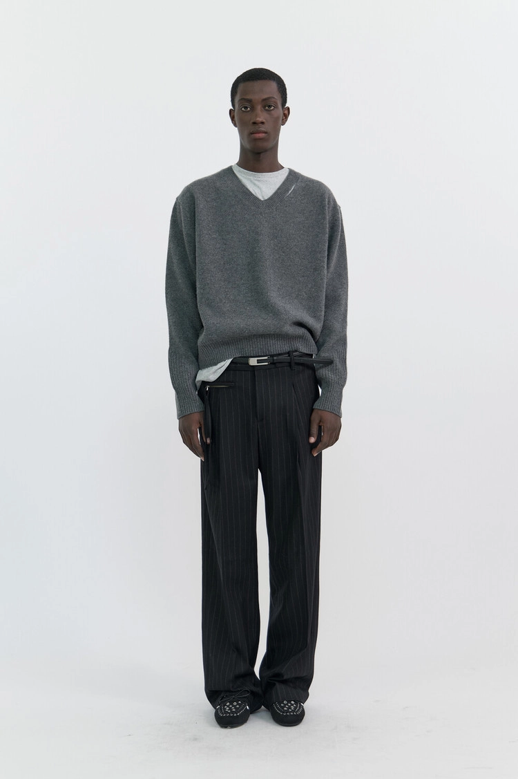 -재원단 지퍼고리가 특징인 원턱 스트라이프 울 트라우져