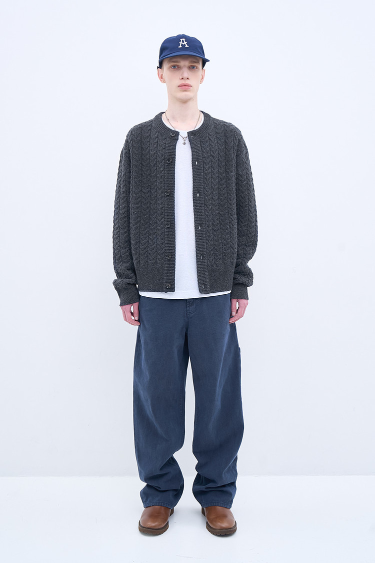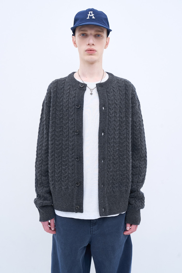 시즌을 거듭하며 디벨롭해온 캐리오버 아이템, 완성도를 갖춘 케이블 니트 카디건. 슈퍼파인 메리노 울 블렌디드 원사, 벌키하면서 은은한 광택이 감도는 질감. 보풀 방지를 위해 도목을 최대로 높인 7게이지 편직, 견고한 내구성과 부드러운 착용감. 밑단과 고무단의 폭을 넓힌 세련된 실루엣. 일본산 모노혼 친환경 단추(Eco Urea®)로 마무리한 디테일.