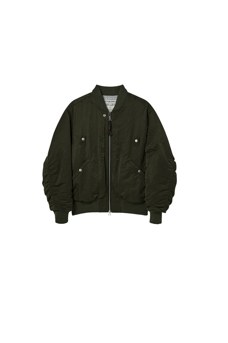 워싱 가공을 더한 링클 나일론 소재로 표현된 MA-1 봄버 재킷. 은은한 광택과 자연스러운 주름감이 어우러진 표면 위로, 윈도페인 체크 안감이 클래식한 무드를 현대적으로 전환. 6oz 신슐레이트 솜을 합포하여 완성된 가벼운 보온감으로, 겨울까지도 유연하게 착용 가능한 시즌리스 아우터.
