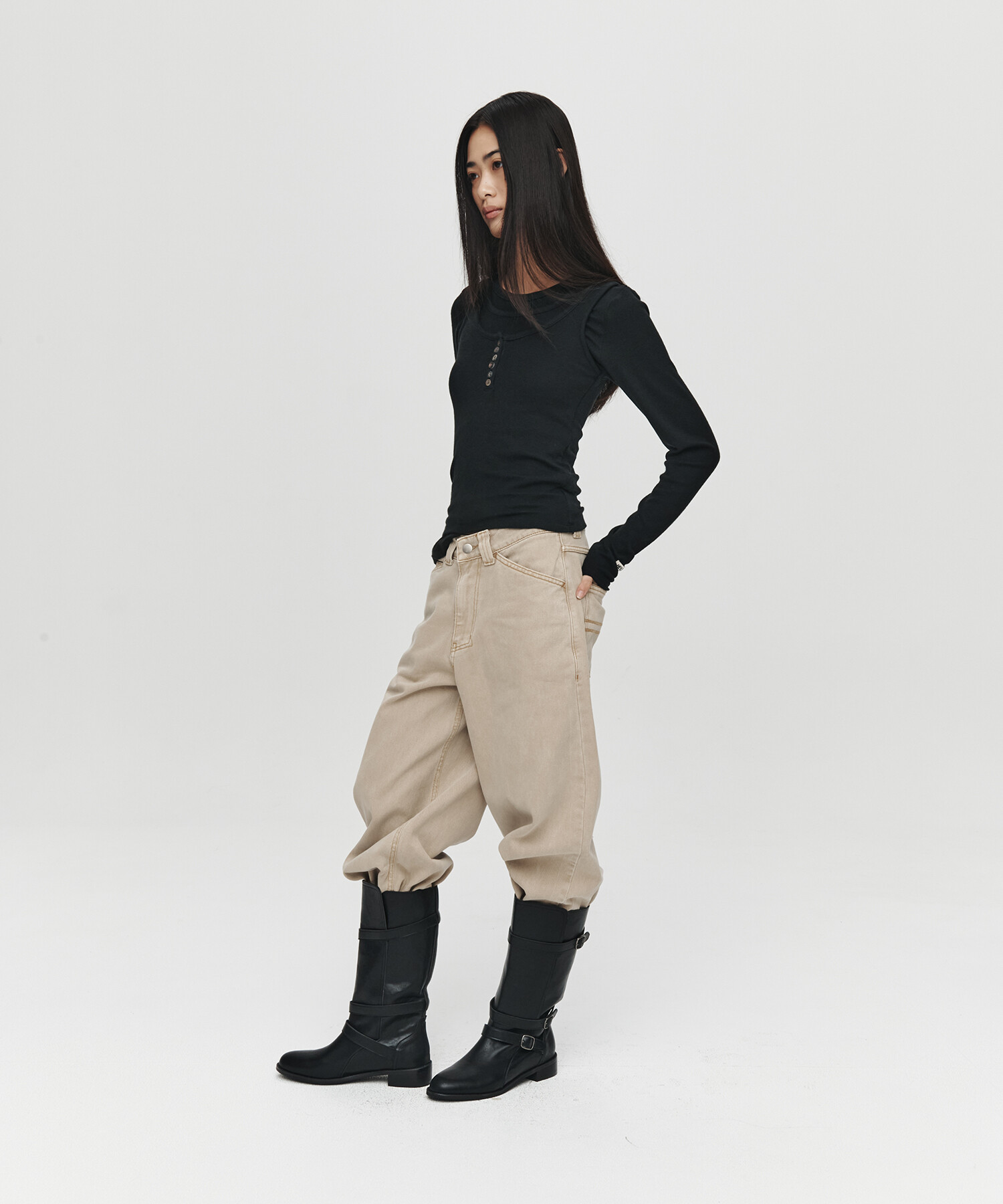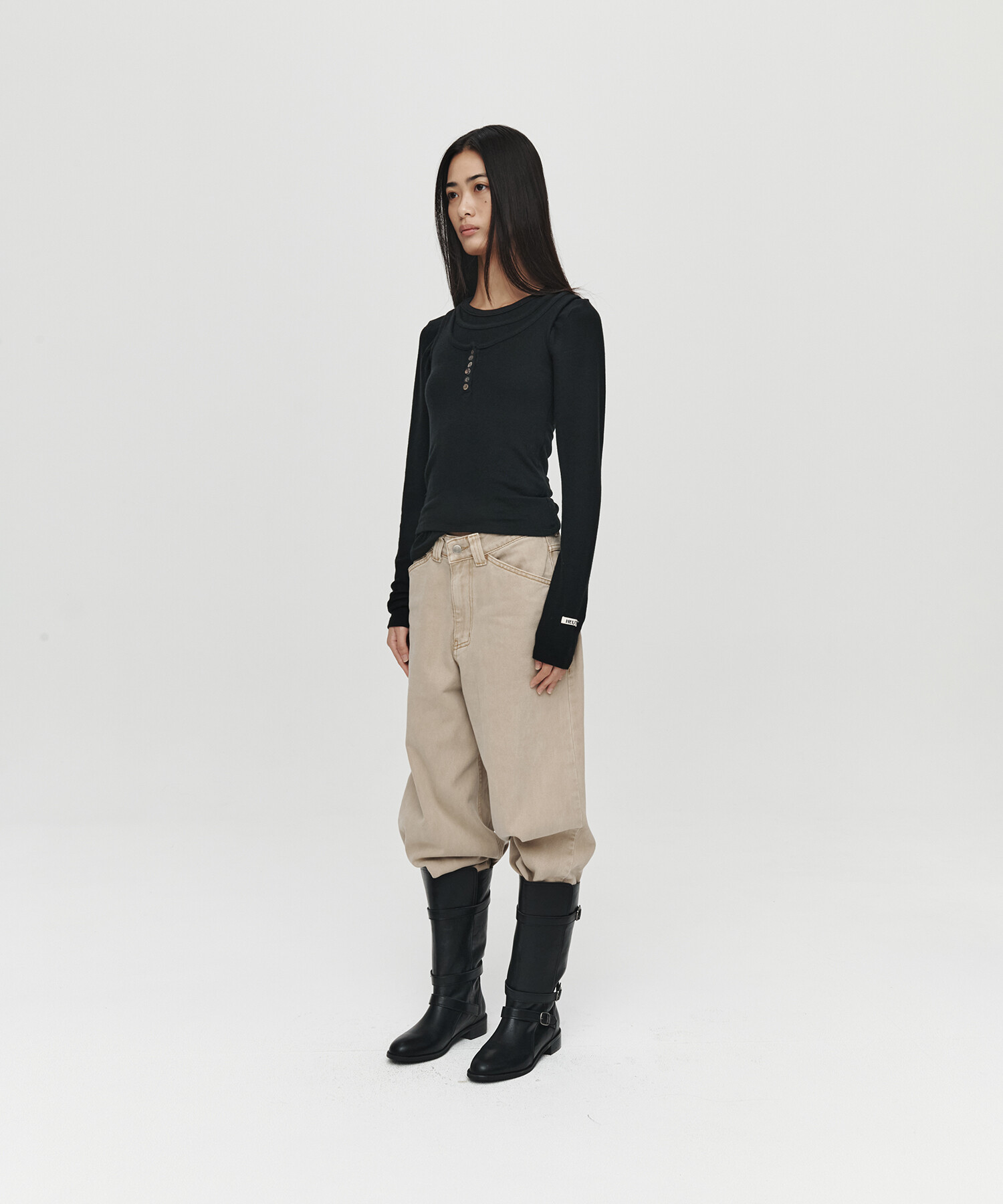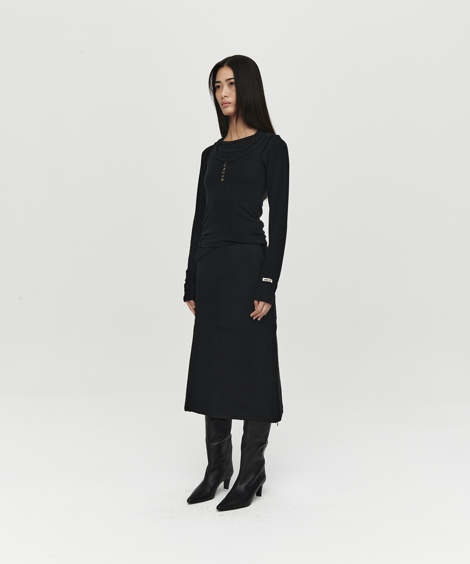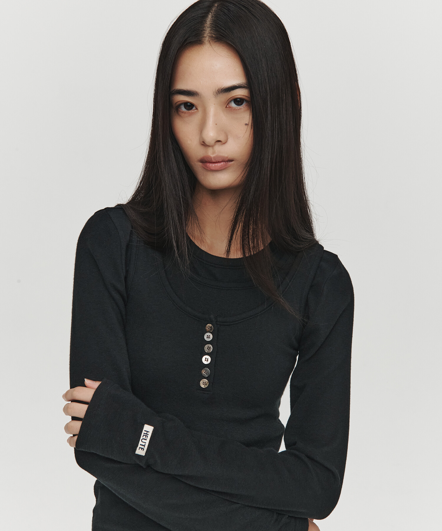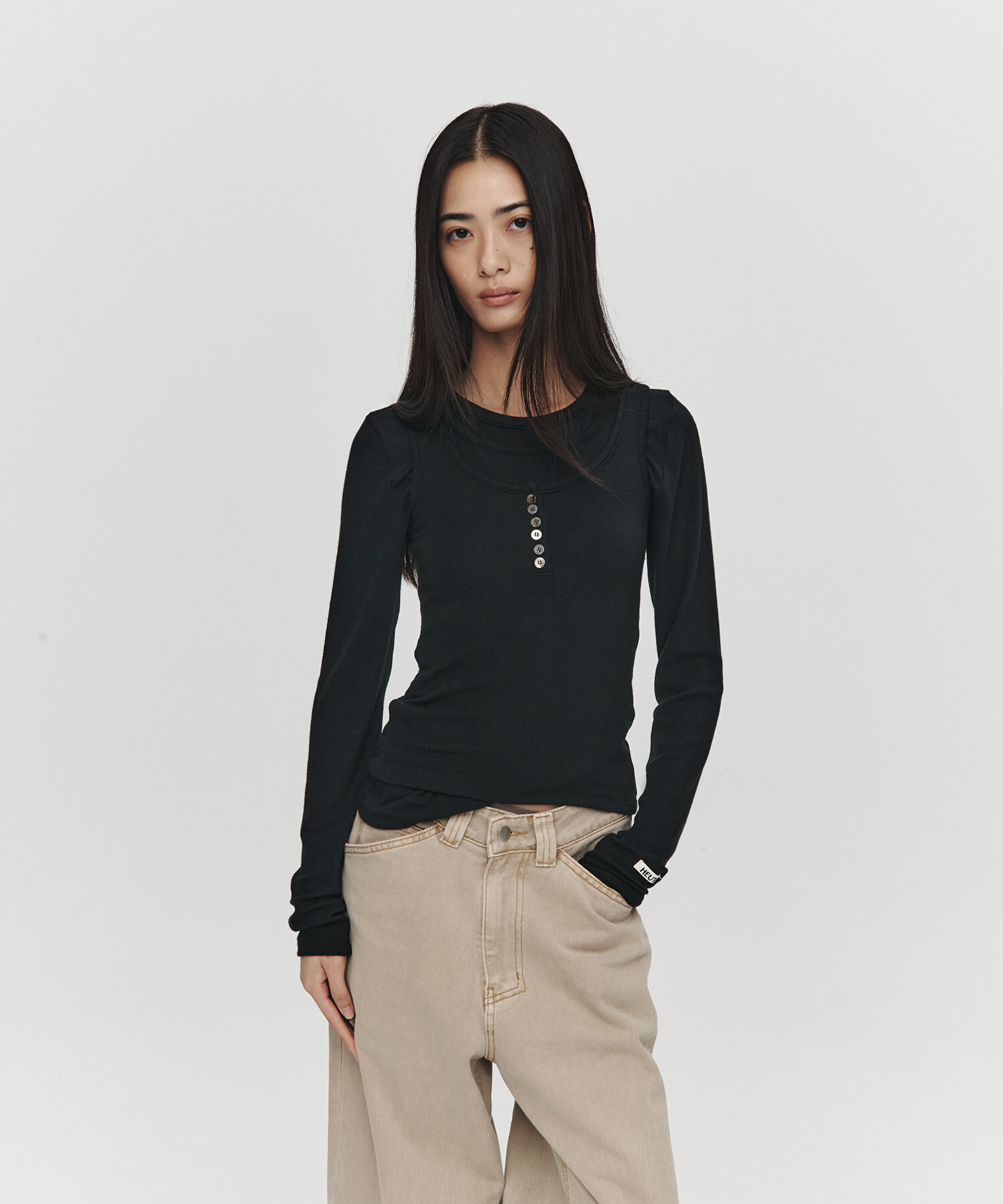 LAYERED LONG HENLEY NECK TOP (BLACK)