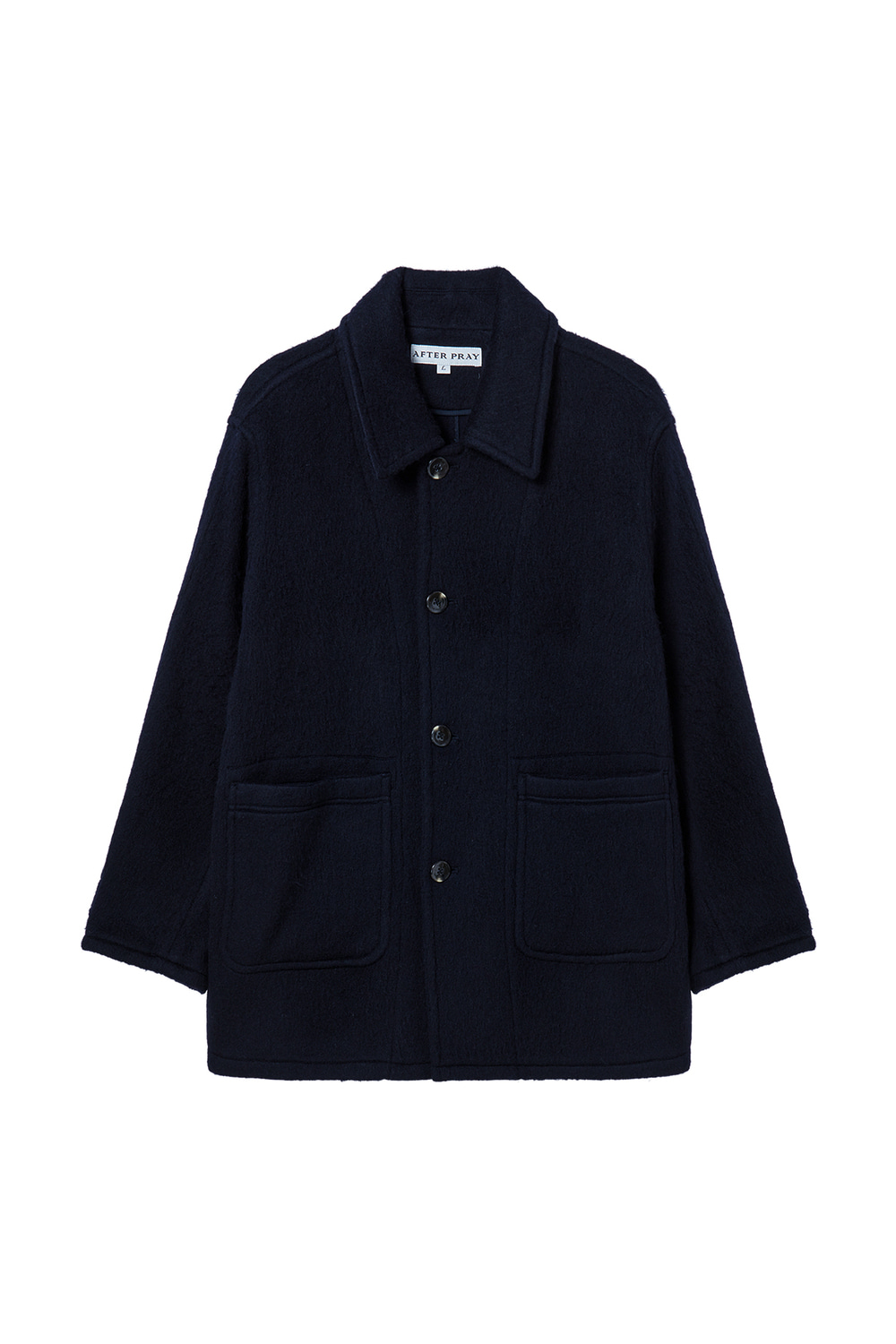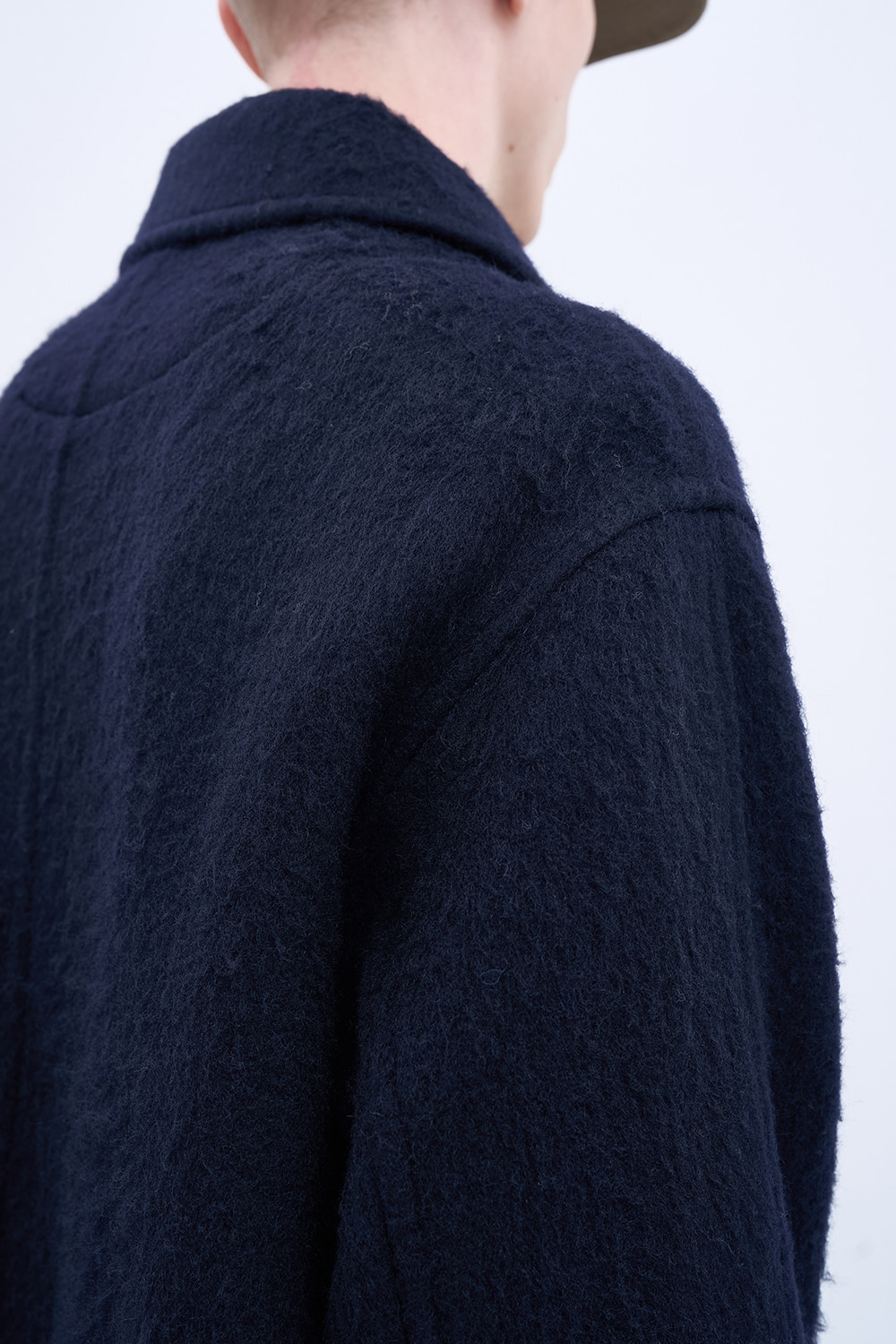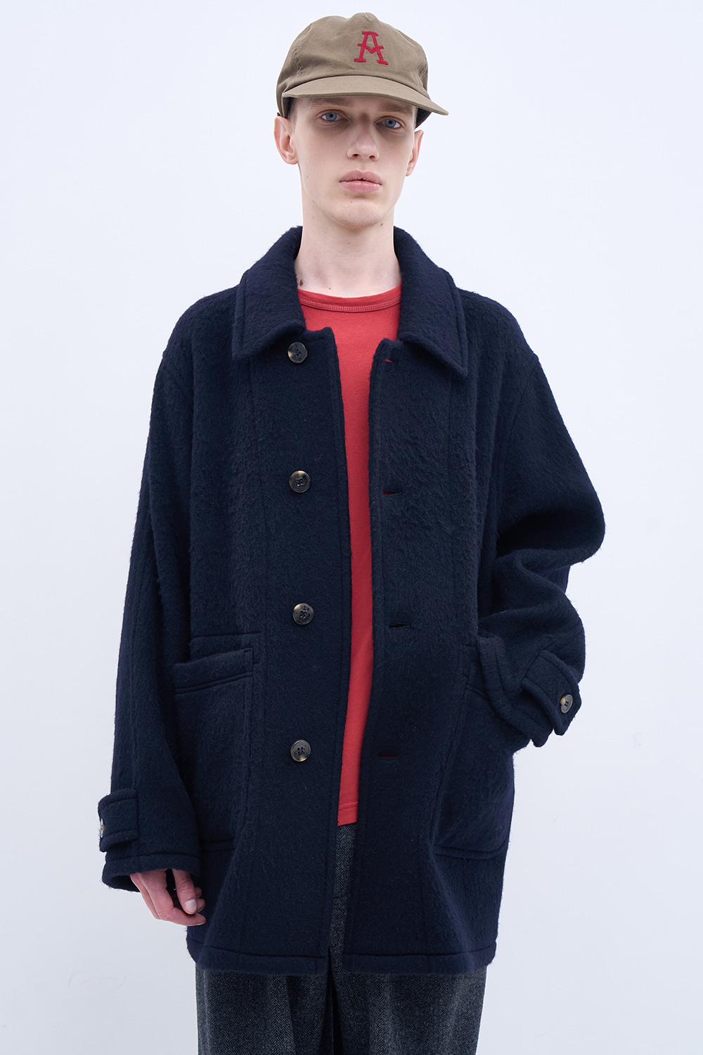 헤어리한 알파카 블렌드 원단으로 완성한 미드 기장 코트. 워크 자켓에서 영감을 받은 디자인, 안감 없는 미까시 마감과 테이프 덧댐 스티치가 드러나는 구조. 독특한 멋과 실용성을 동시에 담은 디테일. 큼직한 비조와 광택감 있는 에폭시 단추, 클래식과 현대적 감각이 공존하는 아이템.