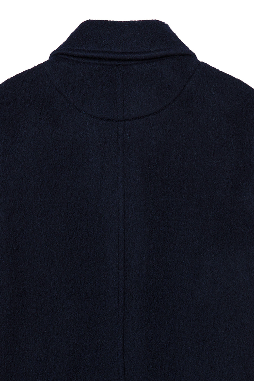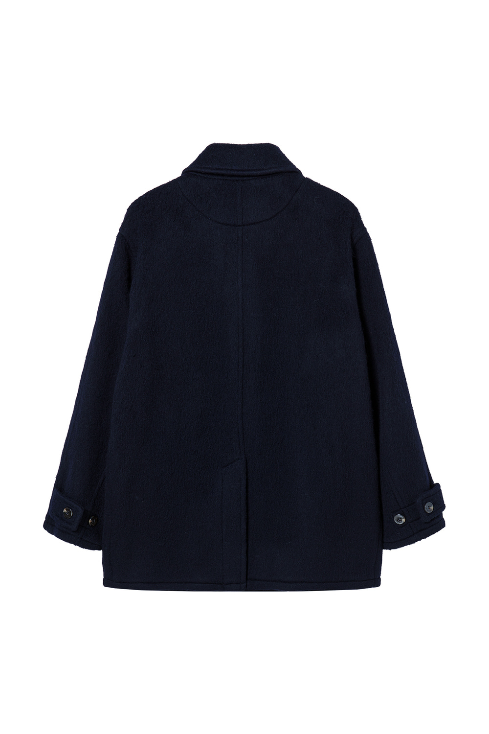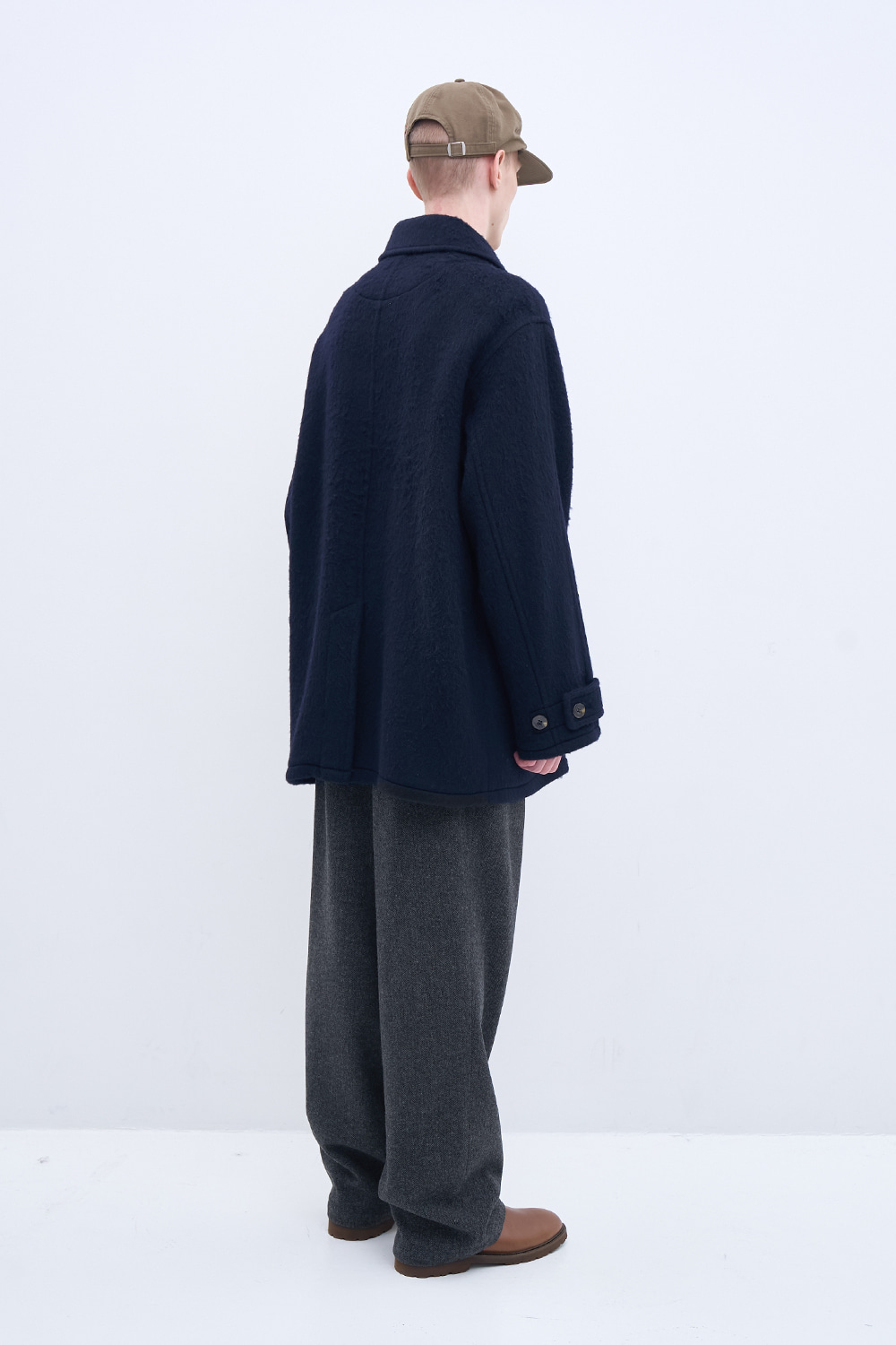 헤어리한 알파카 블렌드 원단으로 완성한 미드 기장 코트. 워크 자켓에서 영감을 받은 디자인, 안감 없는 미까시 마감과 테이프 덧댐 스티치가 드러나는 구조. 독특한 멋과 실용성을 동시에 담은 디테일. 큼직한 비조와 광택감 있는 에폭시 단추, 클래식과 현대적 감각이 공존하는 아이템.