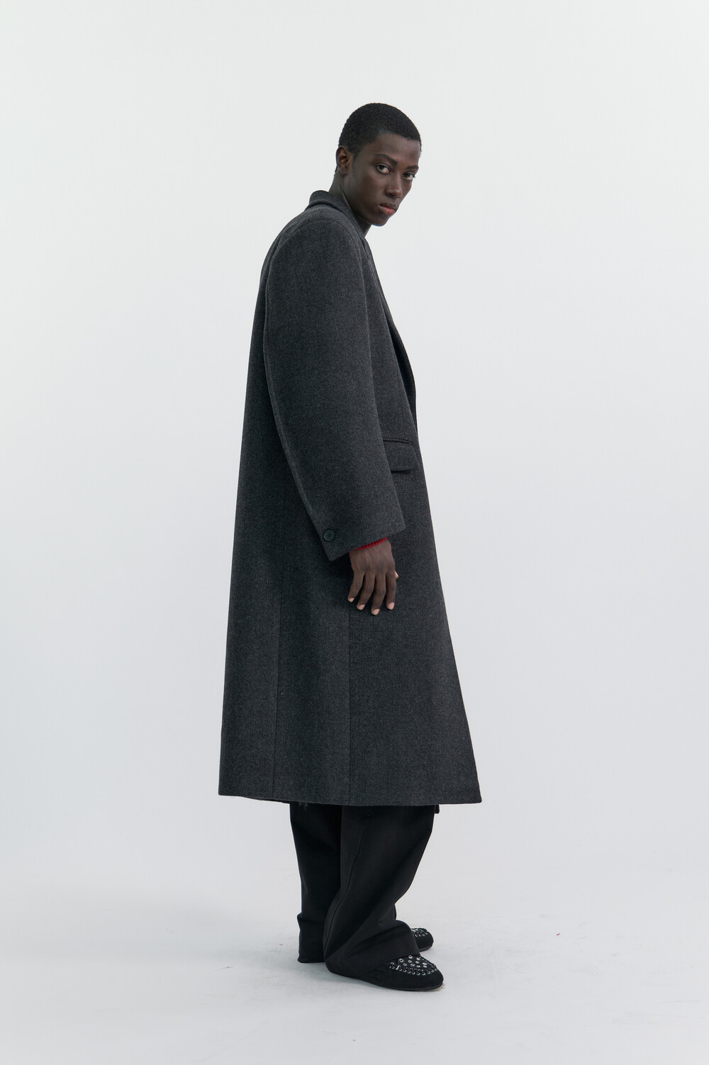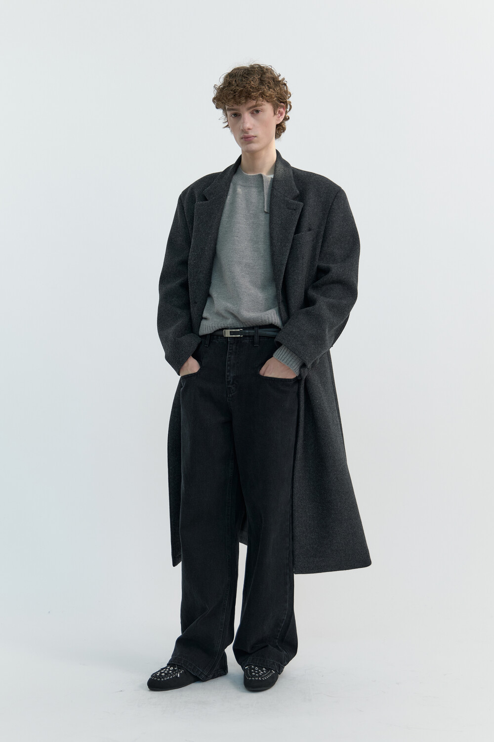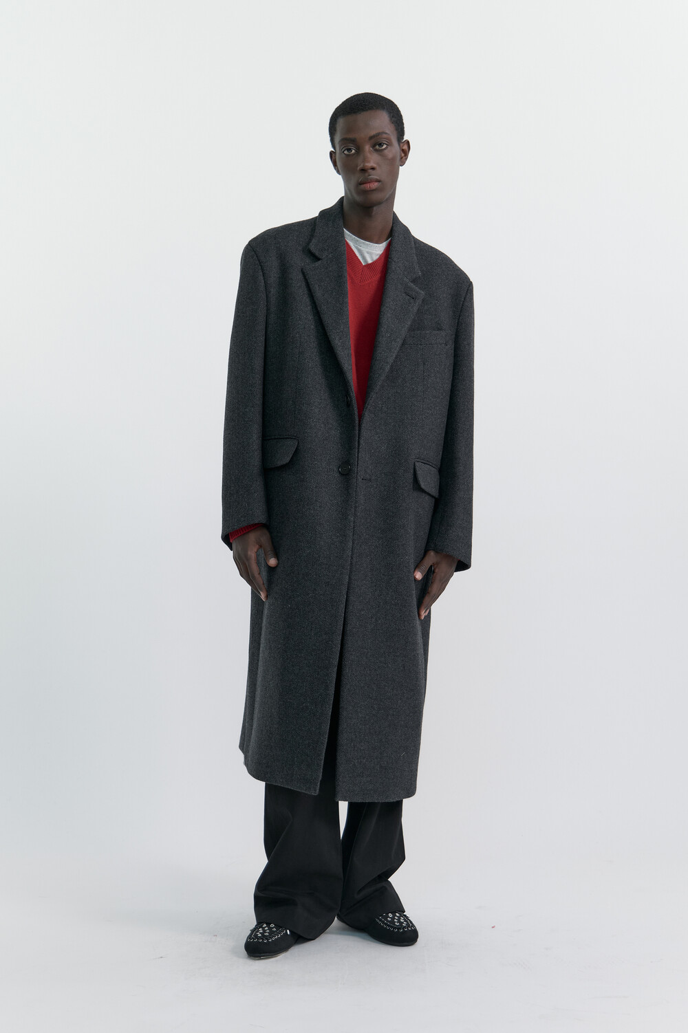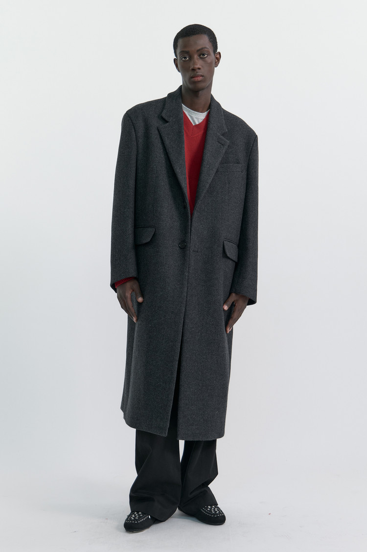 -중량감있는 방모울 소재와 세미오버사이즈 실루엣이 돋보이는 클래식 싱글 브레스티드 코트