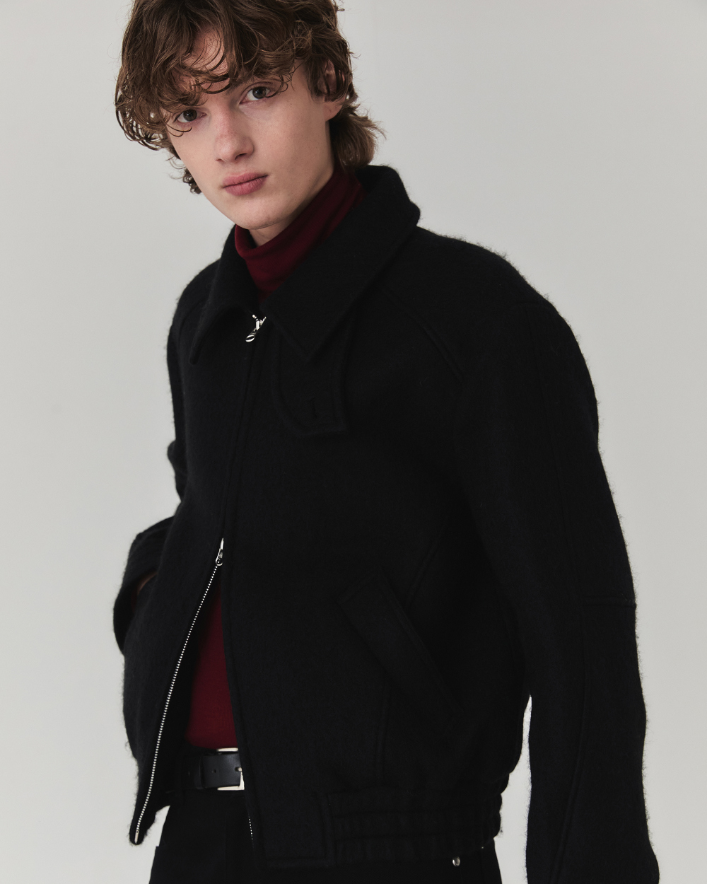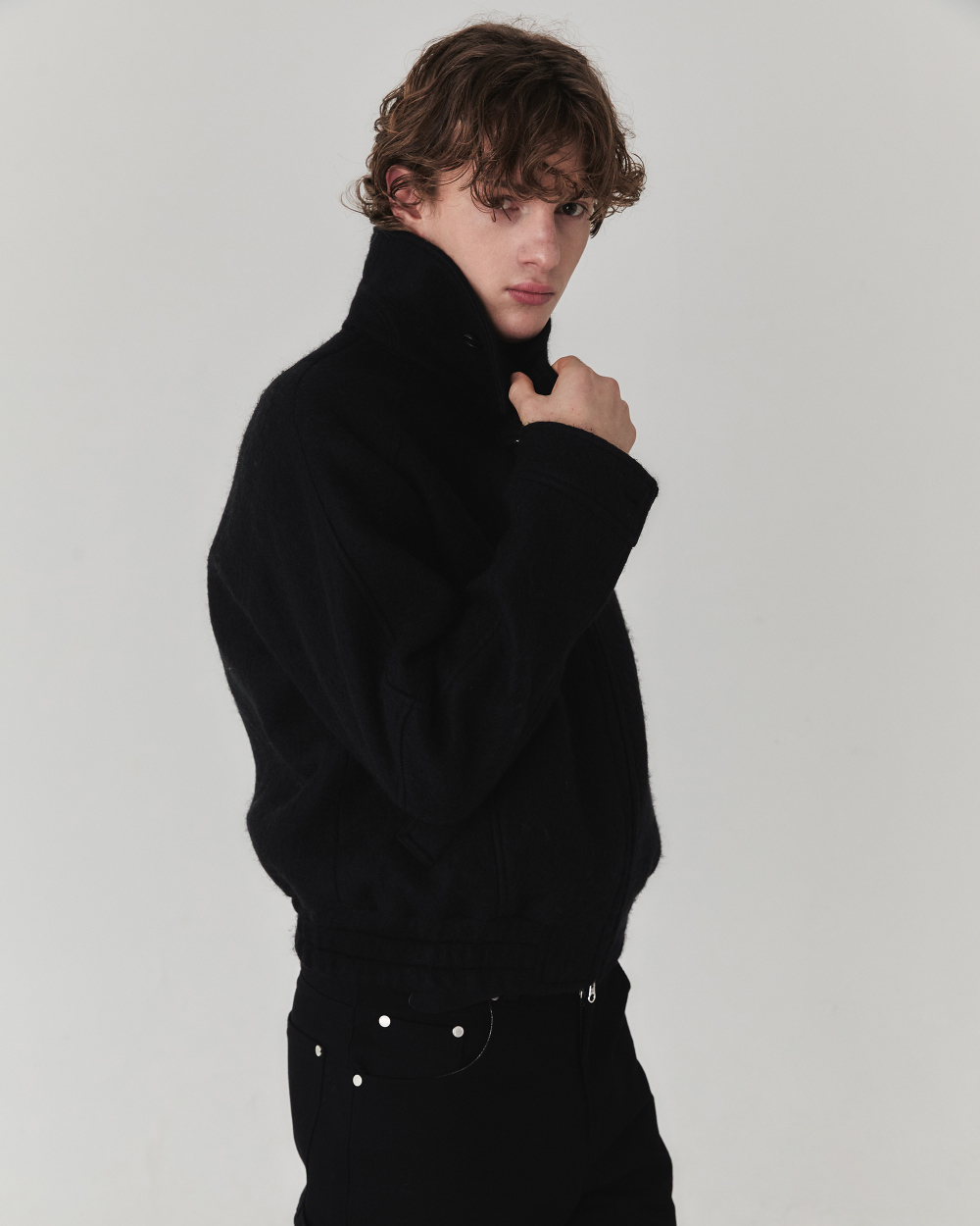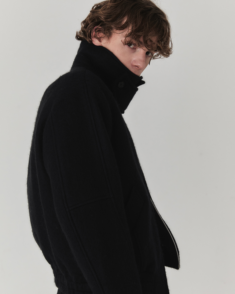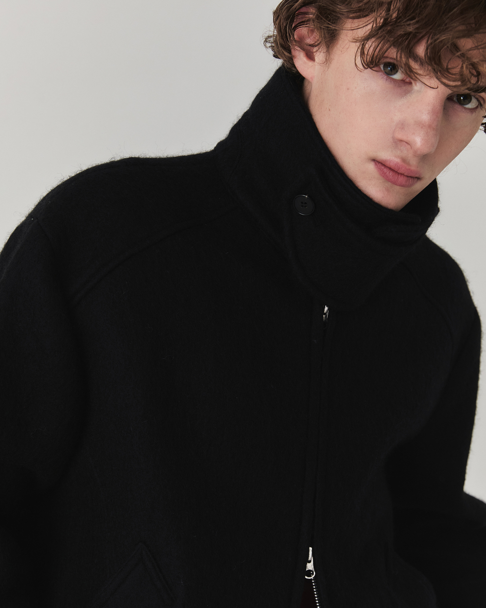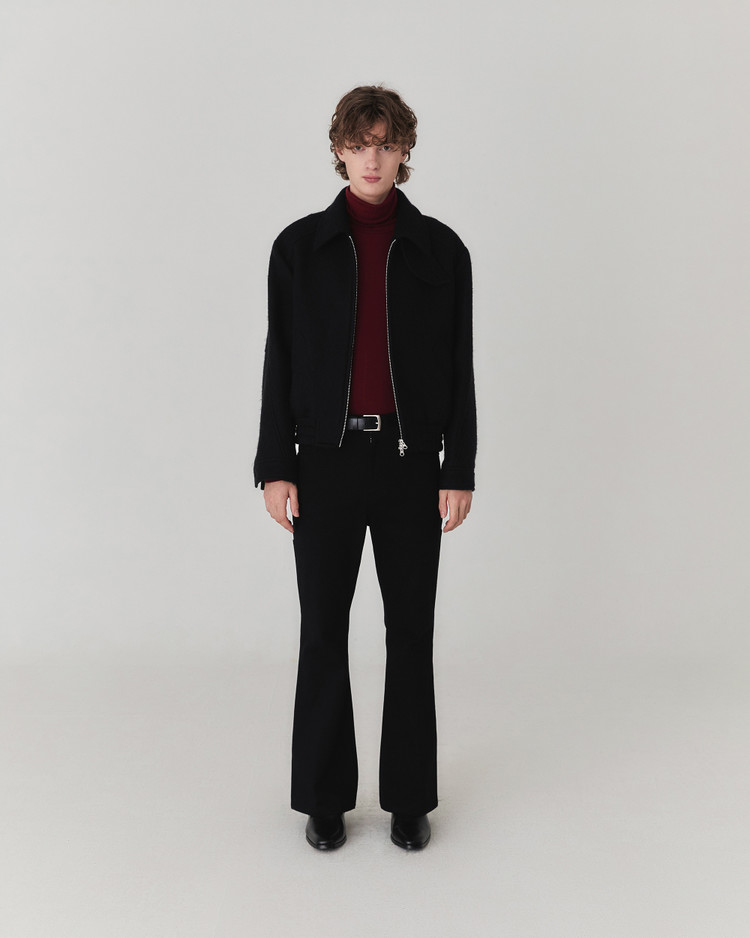 헤어리한 텍스처와 부드러운 터치감이 매력적인 울 소재로 제작된 크롭 실루엣 의 자켓입니다. 소재 자체에서 보여지는 브러쉬된 텍스쳐가 포근하면서도 입체 적으로 표현되어 깊이감과 동시에 안정감 있는 착용감과 보온성이 특징입니다.