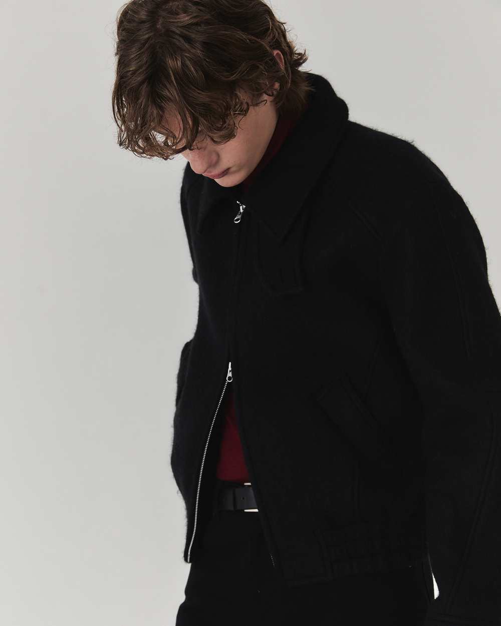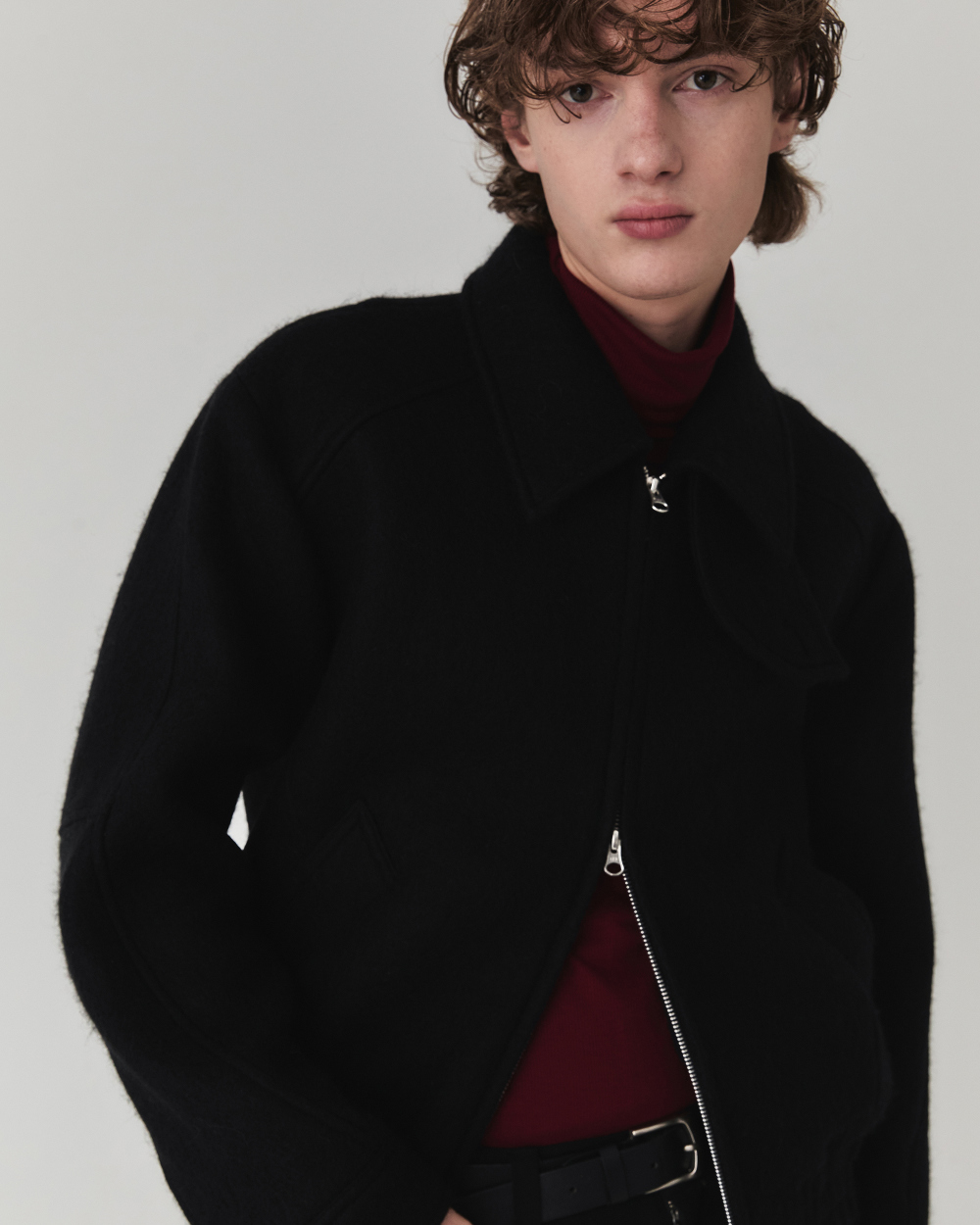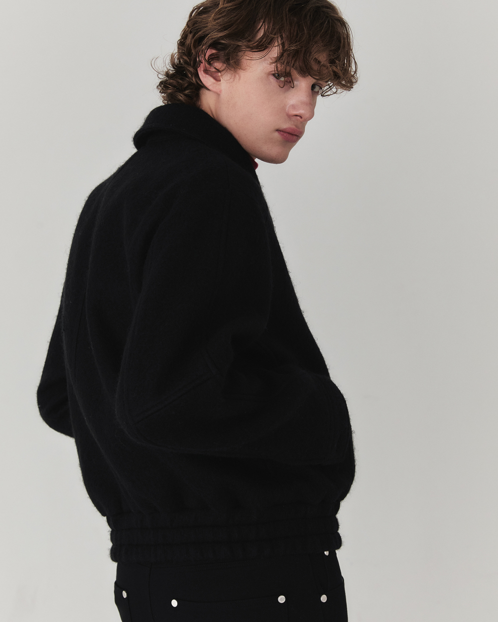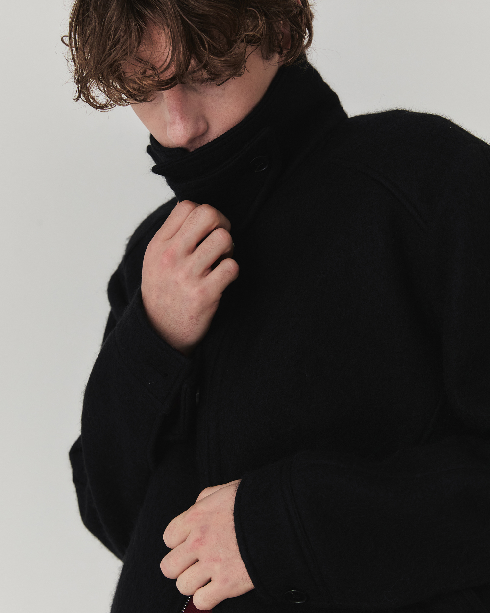 헤어리한 텍스처와 부드러운 터치감이 매력적인 울 소재로 제작된 크롭 실루엣 의 자켓입니다. 소재 자체에서 보여지는 브러쉬된 텍스쳐가 포근하면서도 입체 적으로 표현되어 깊이감과 동시에 안정감 있는 착용감과 보온성이 특징입니다.