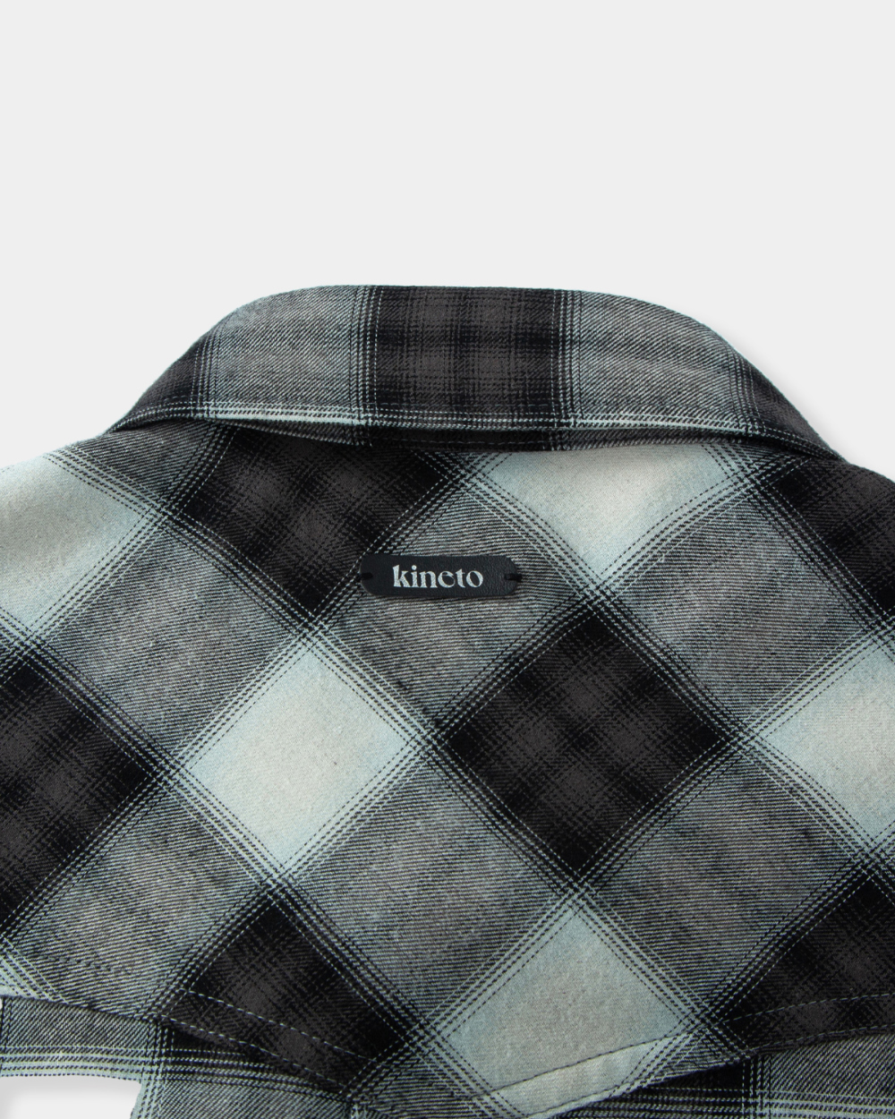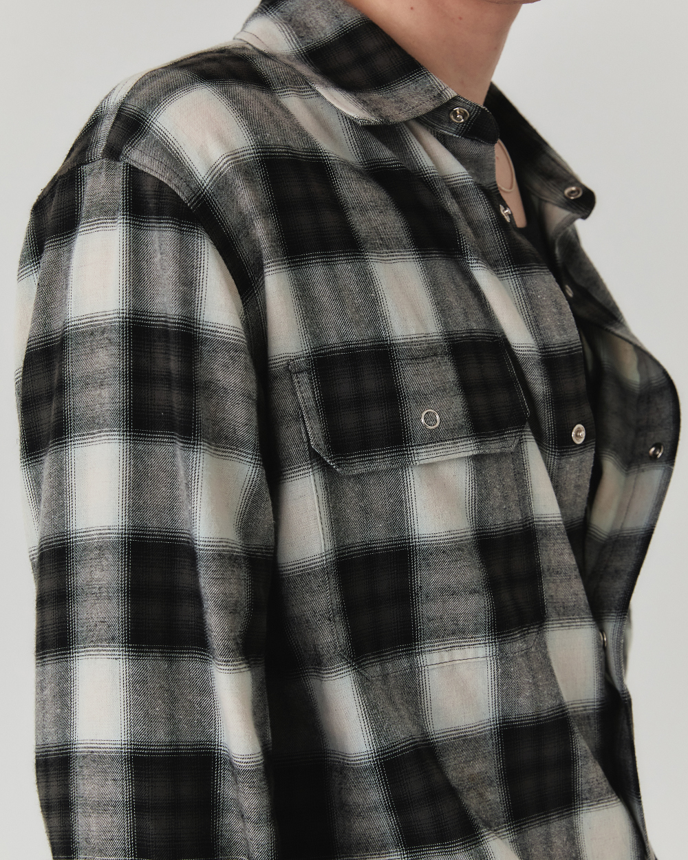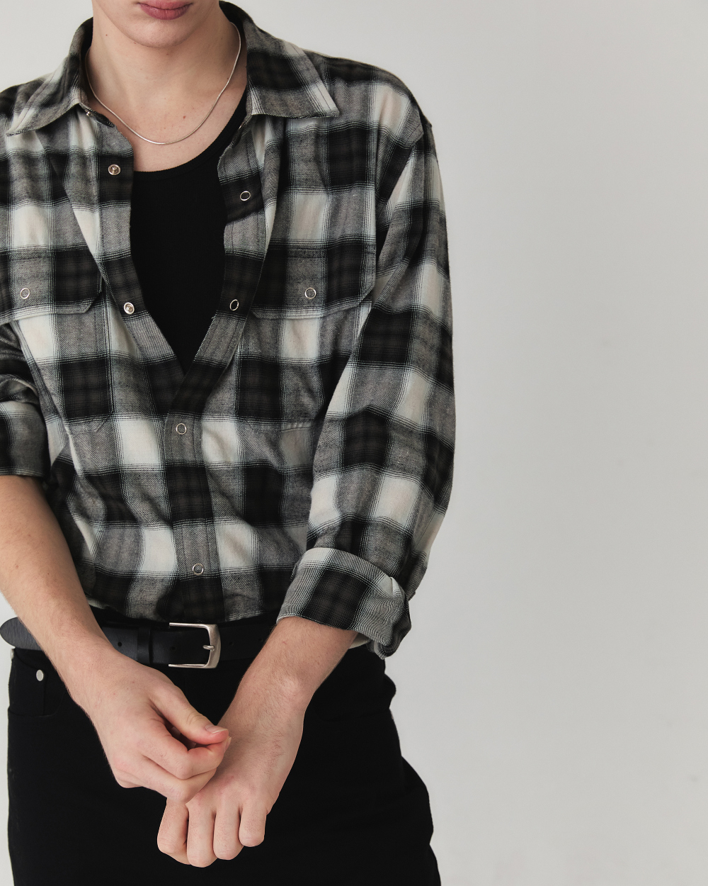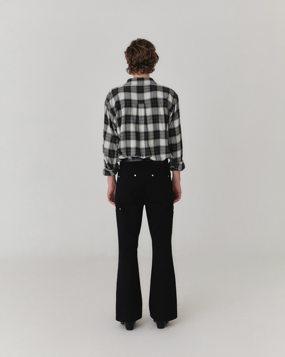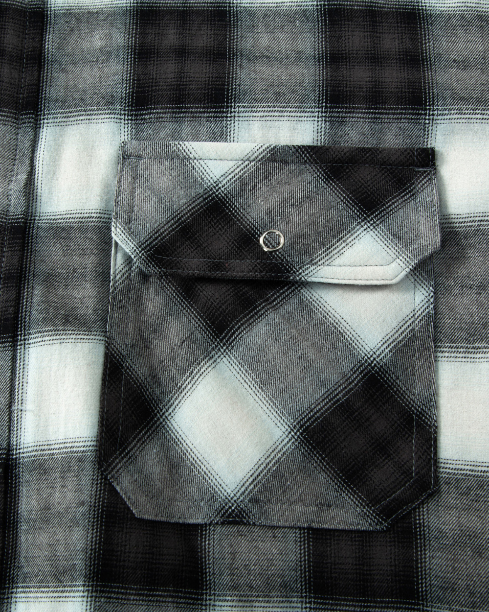 스탠다드한 실루엣으로 가슴부위에 플랩 형식의 아웃포켓과 어깨라인의 웨스턴 요크 컷팅, 후면 웨스턴 요크 컷팅부위의 체크 패턴을 사선으로 표현하여 전체적으로 조화를 이루며 유니크한 무드를 보여줍니다.