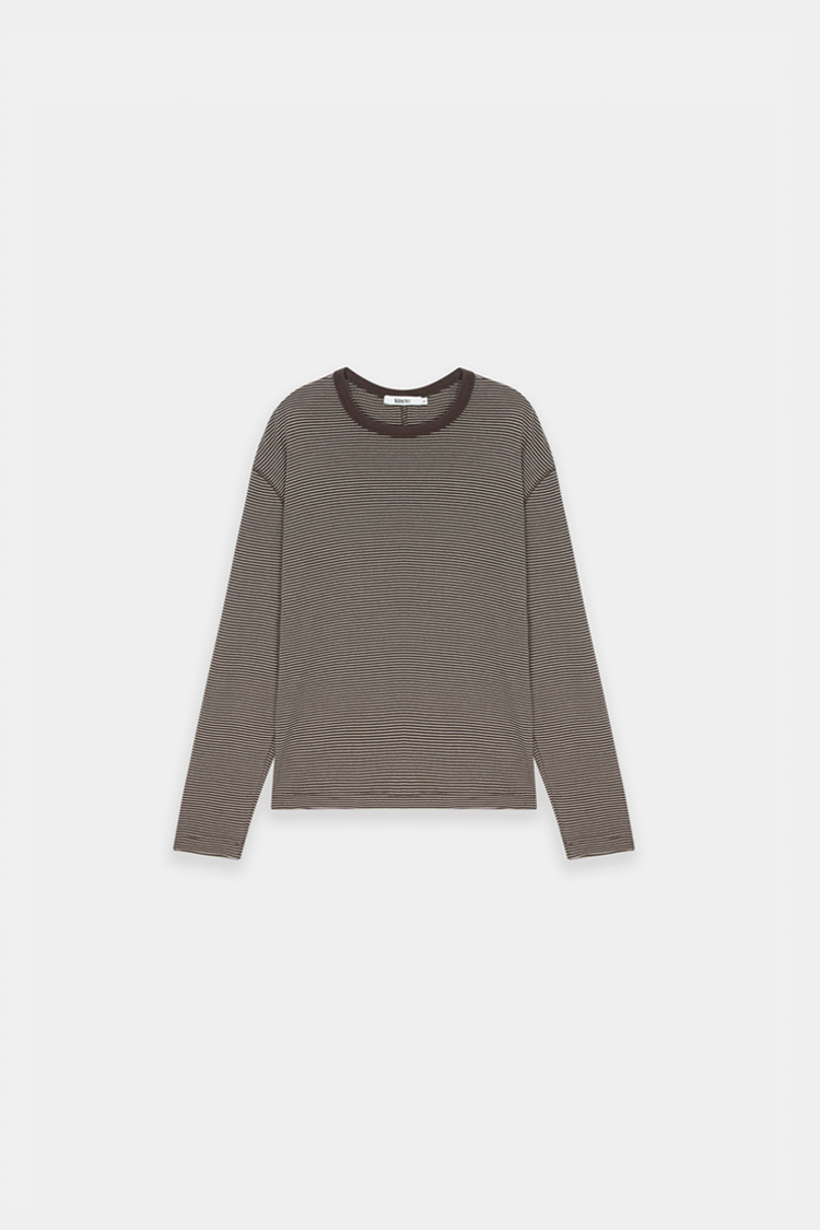 조화로운 색채의 조합이 매력적인 레귤러한 실루엣의 스트라이프 코튼 탑 입니다.