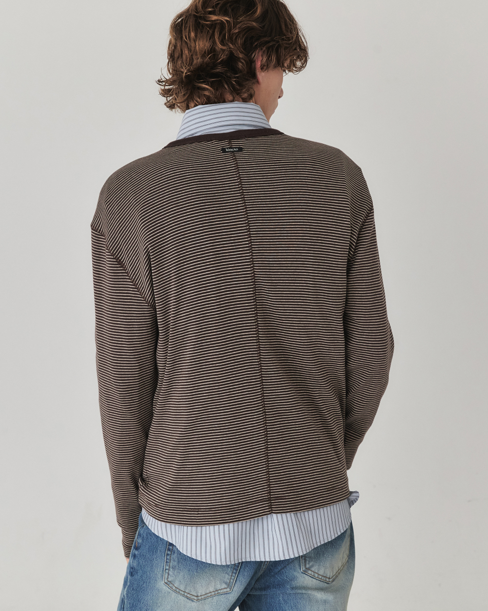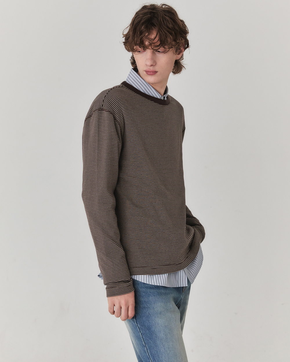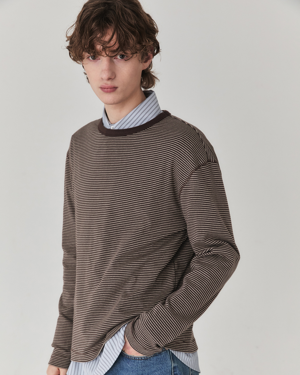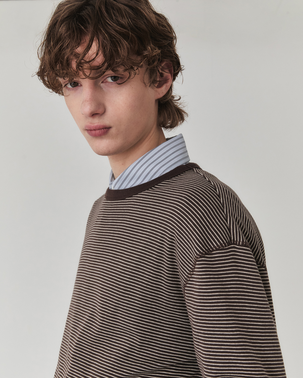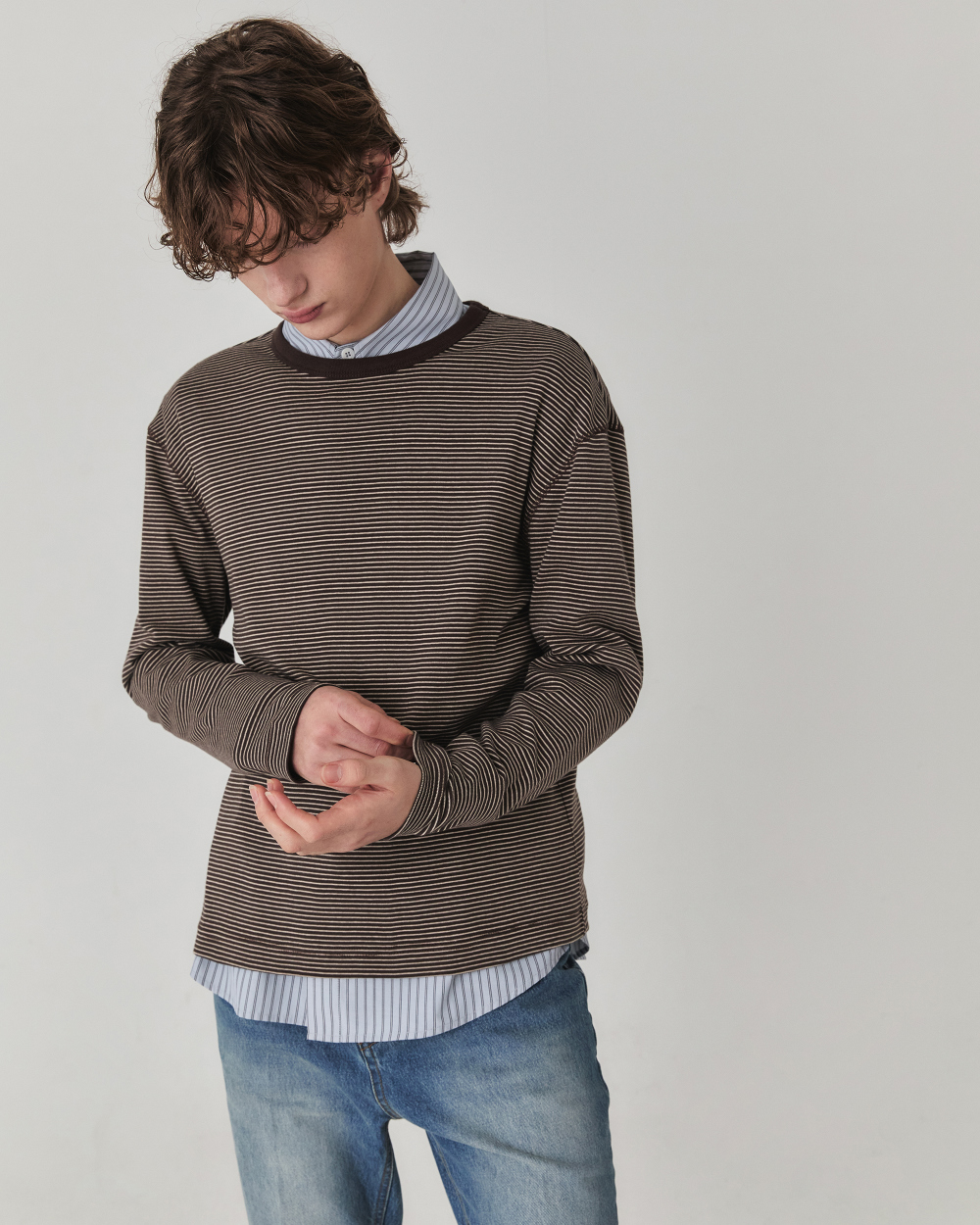 핀스트라이프 형태의 패턴으로 세련되면서도 캐주얼한 무드를 동시에 나타내며, 넥 라인에는 립 소재로 바인딩 처리 되어 포인트를 더하였습니다.