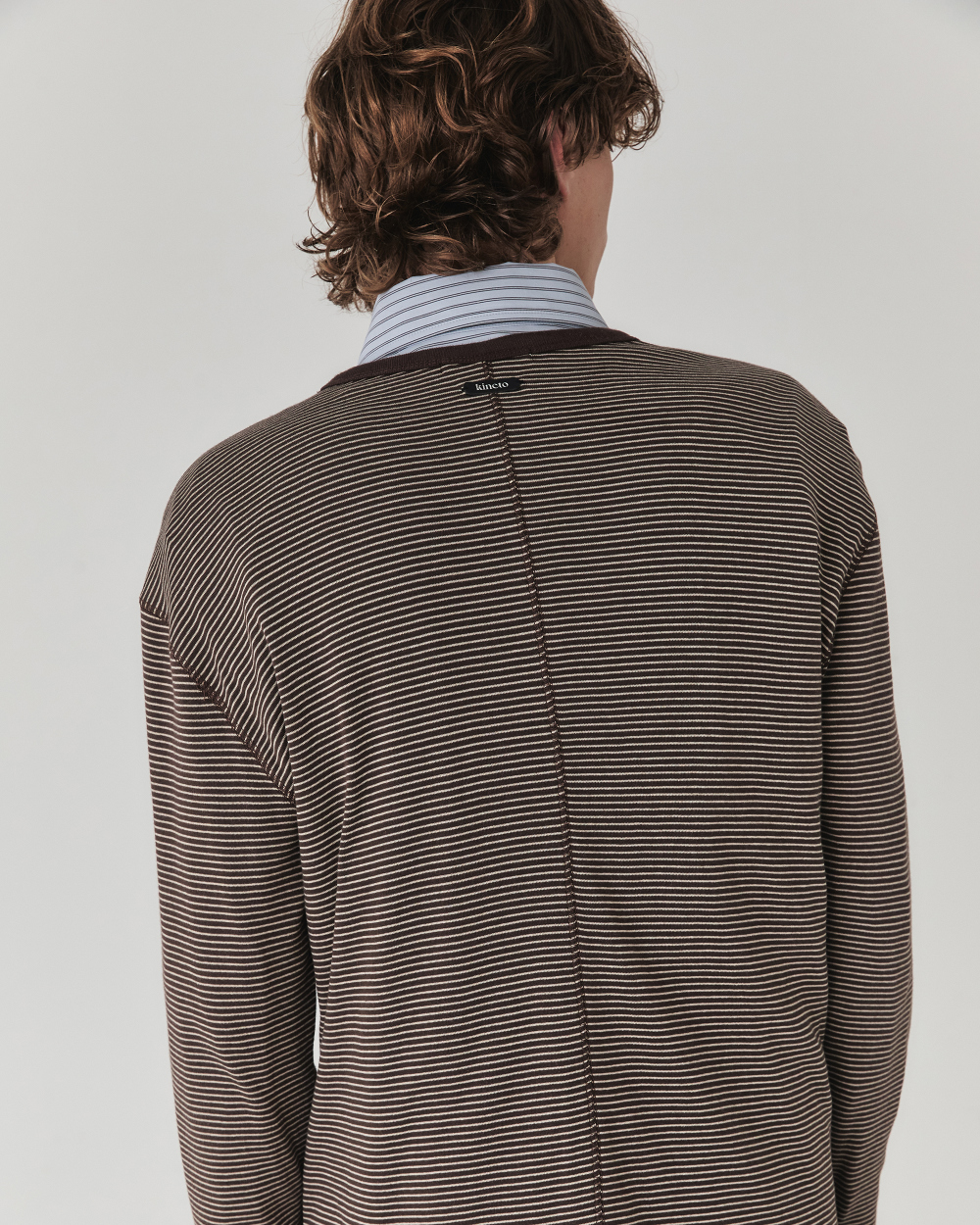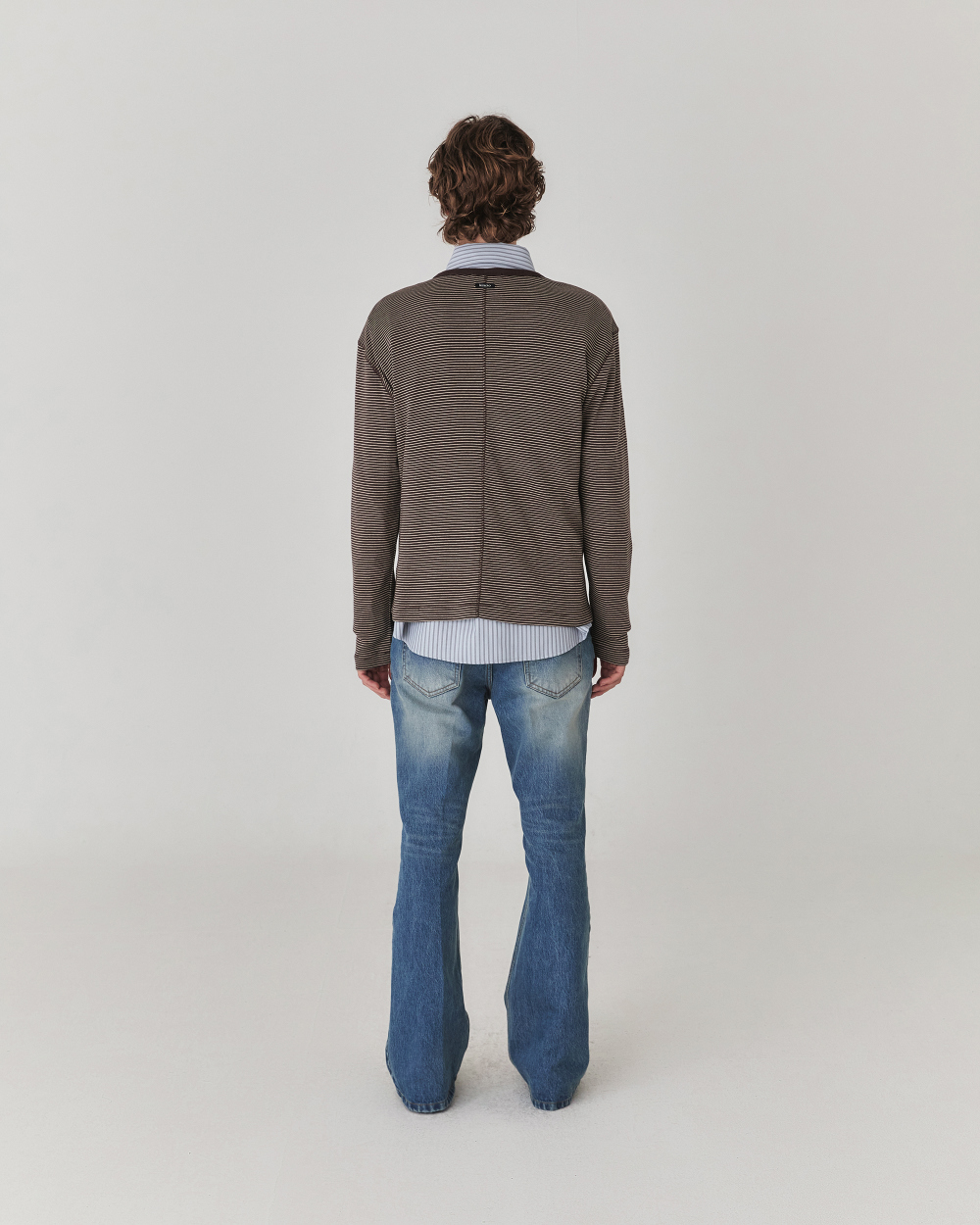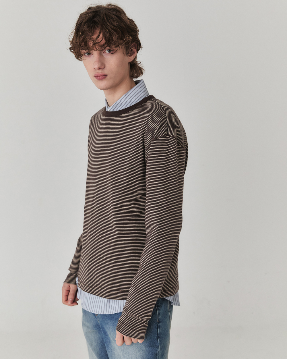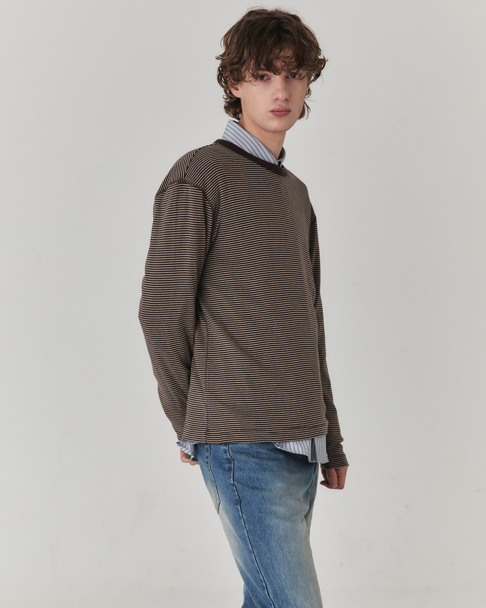 핀스트라이프 형태의 패턴으로 세련되면서도 캐주얼한 무드를 동시에 나타내며, 넥 라인에는 립 소재로 바인딩 처리 되어 포인트를 더하였습니다.