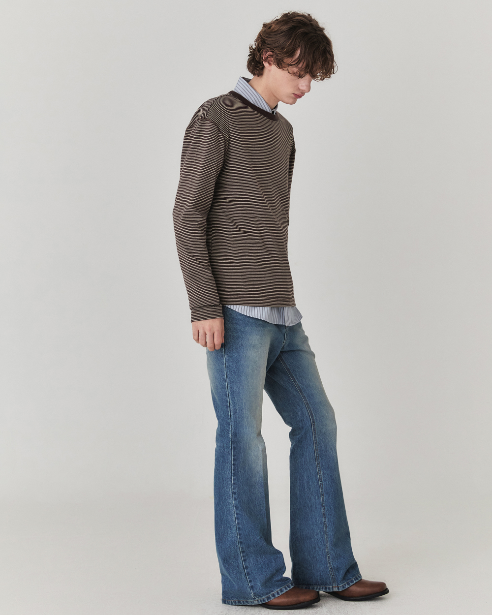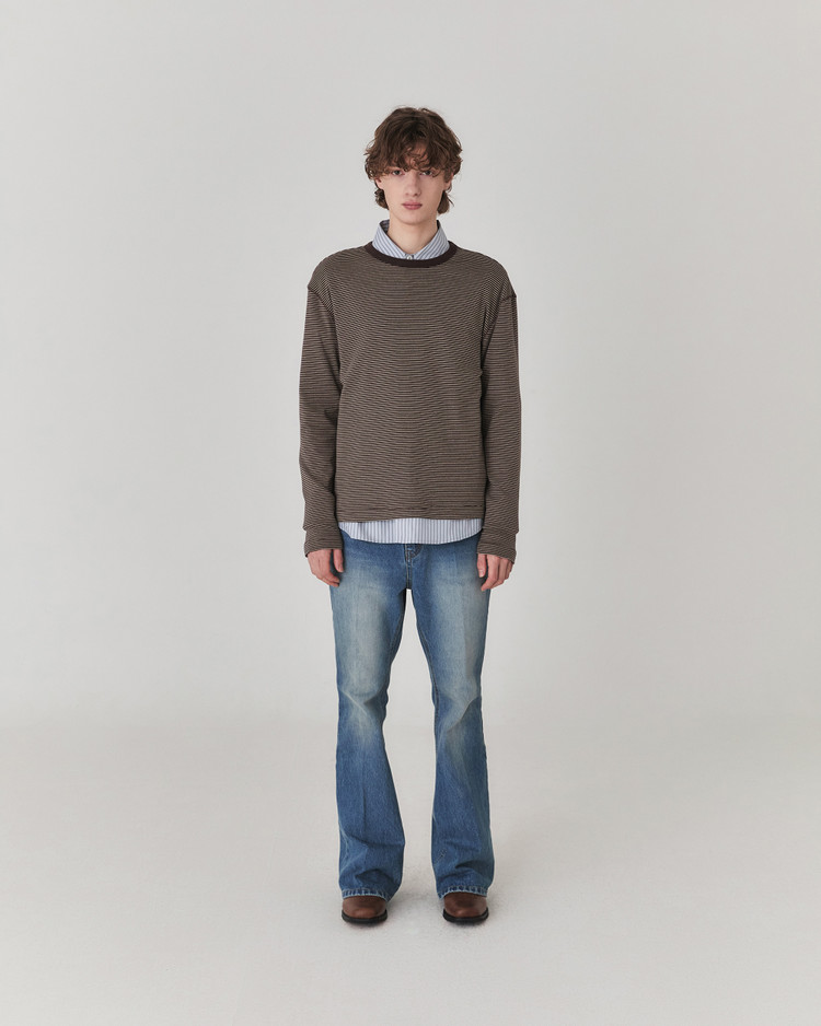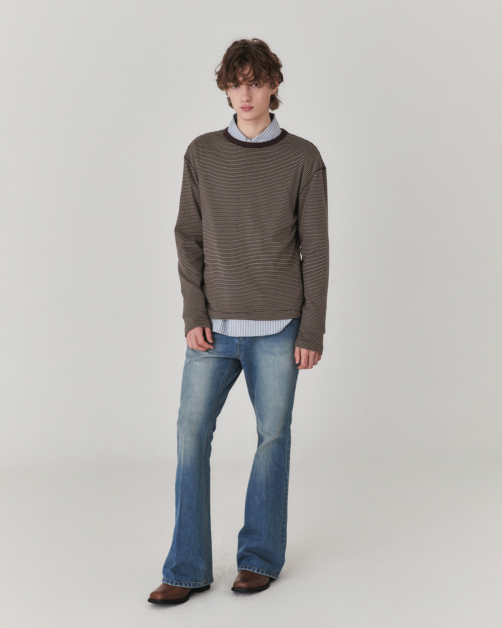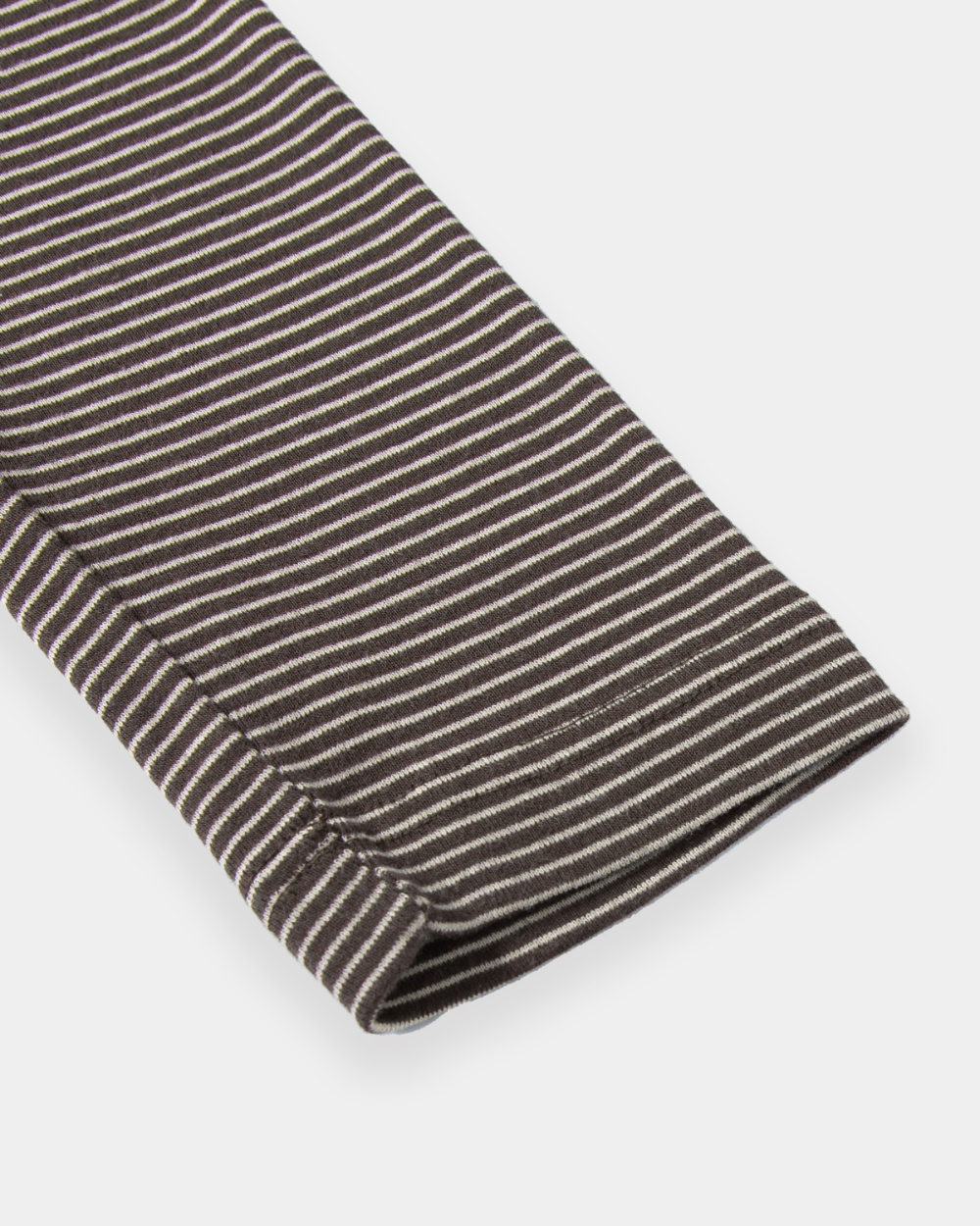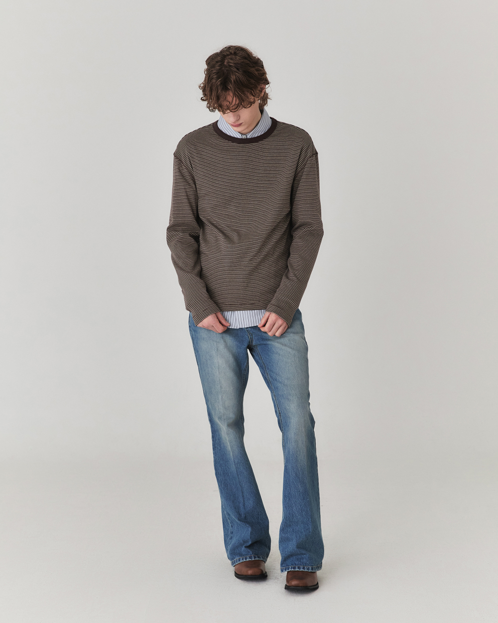 핀스트라이프 형태의 패턴으로 세련되면서도 캐주얼한 무드를 동시에 나타내며, 넥 라인에는 립 소재로 바인딩 처리 되어 포인트를 더하였습니다.