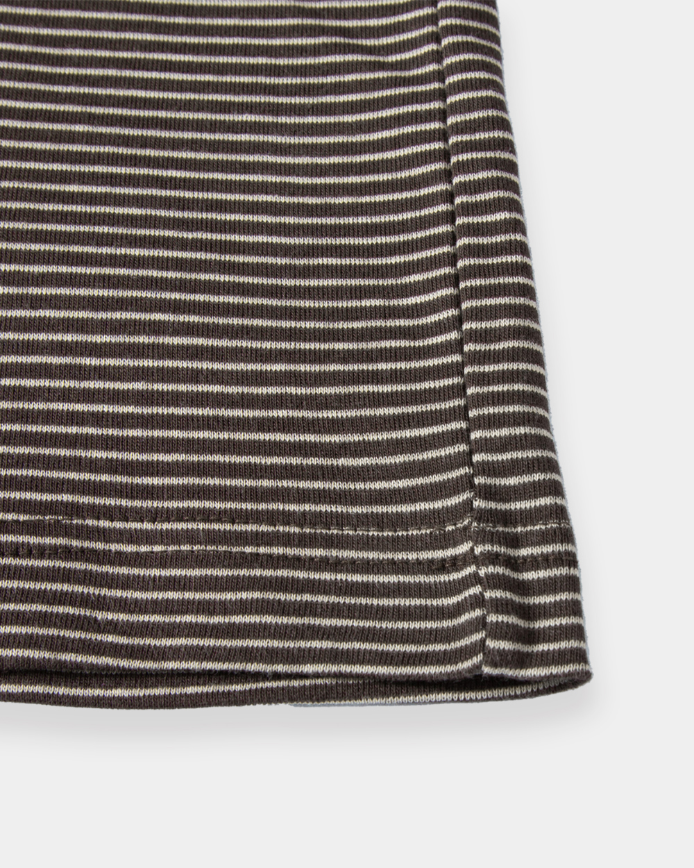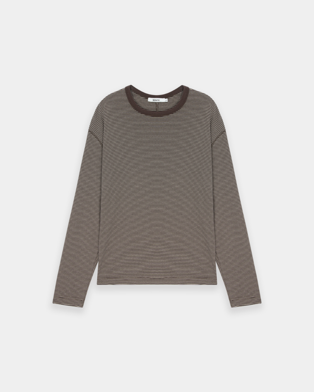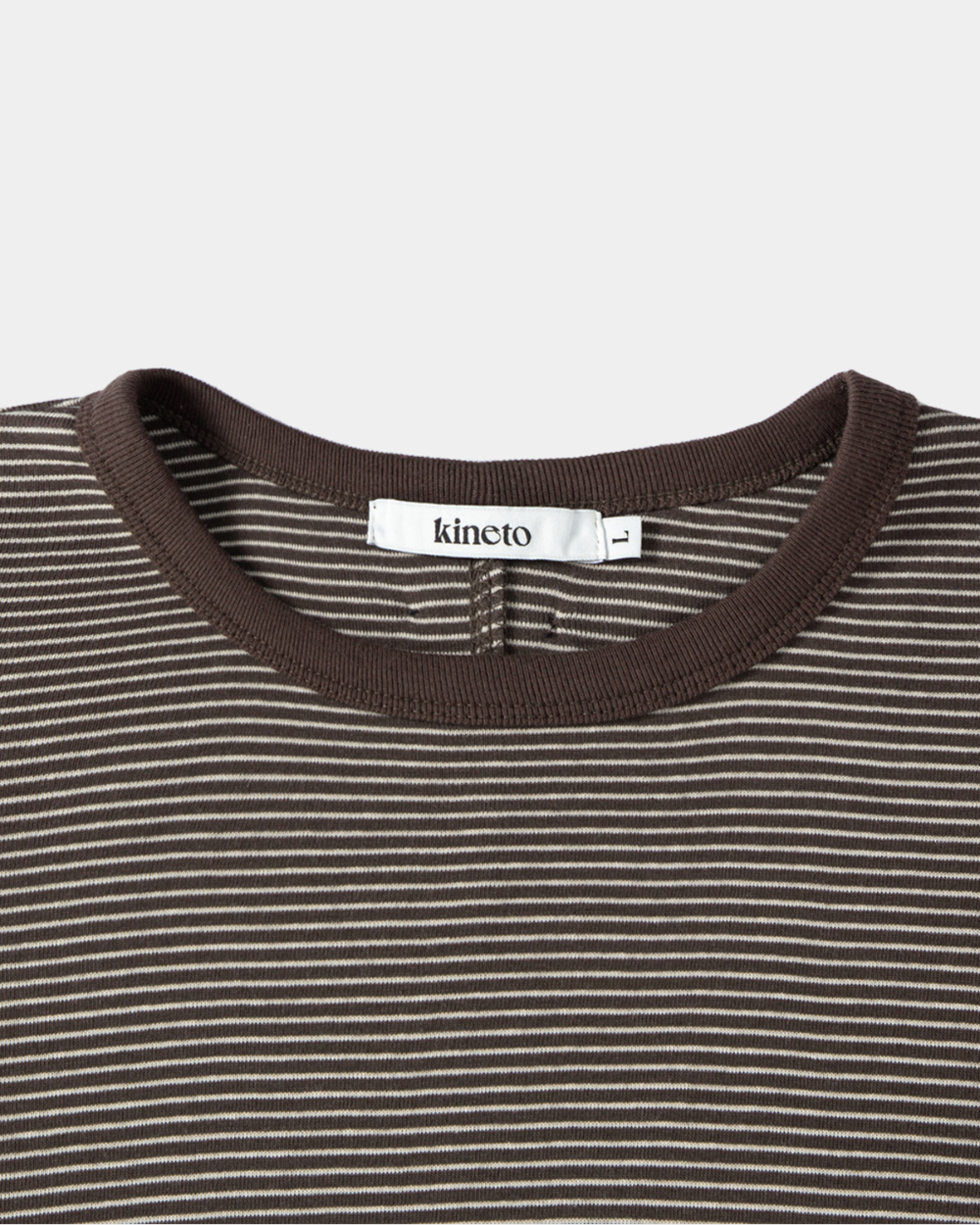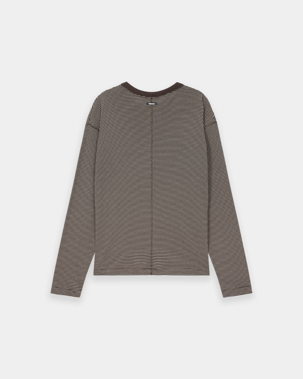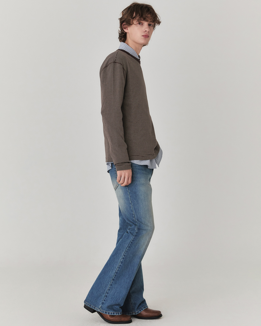 핀스트라이프 형태의 패턴으로 세련되면서도 캐주얼한 무드를 동시에 나타내며, 넥 라인에는 립 소재로 바인딩 처리 되어 포인트를 더하였습니다.