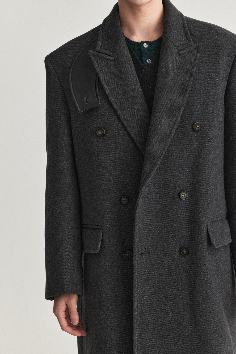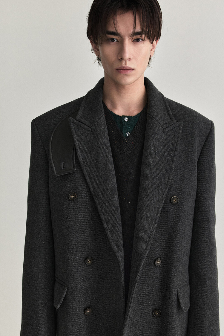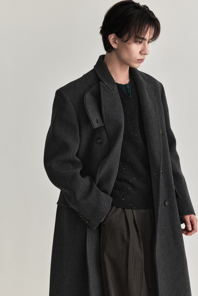 Collar-Base Leather Double Long Coat - Charcoal