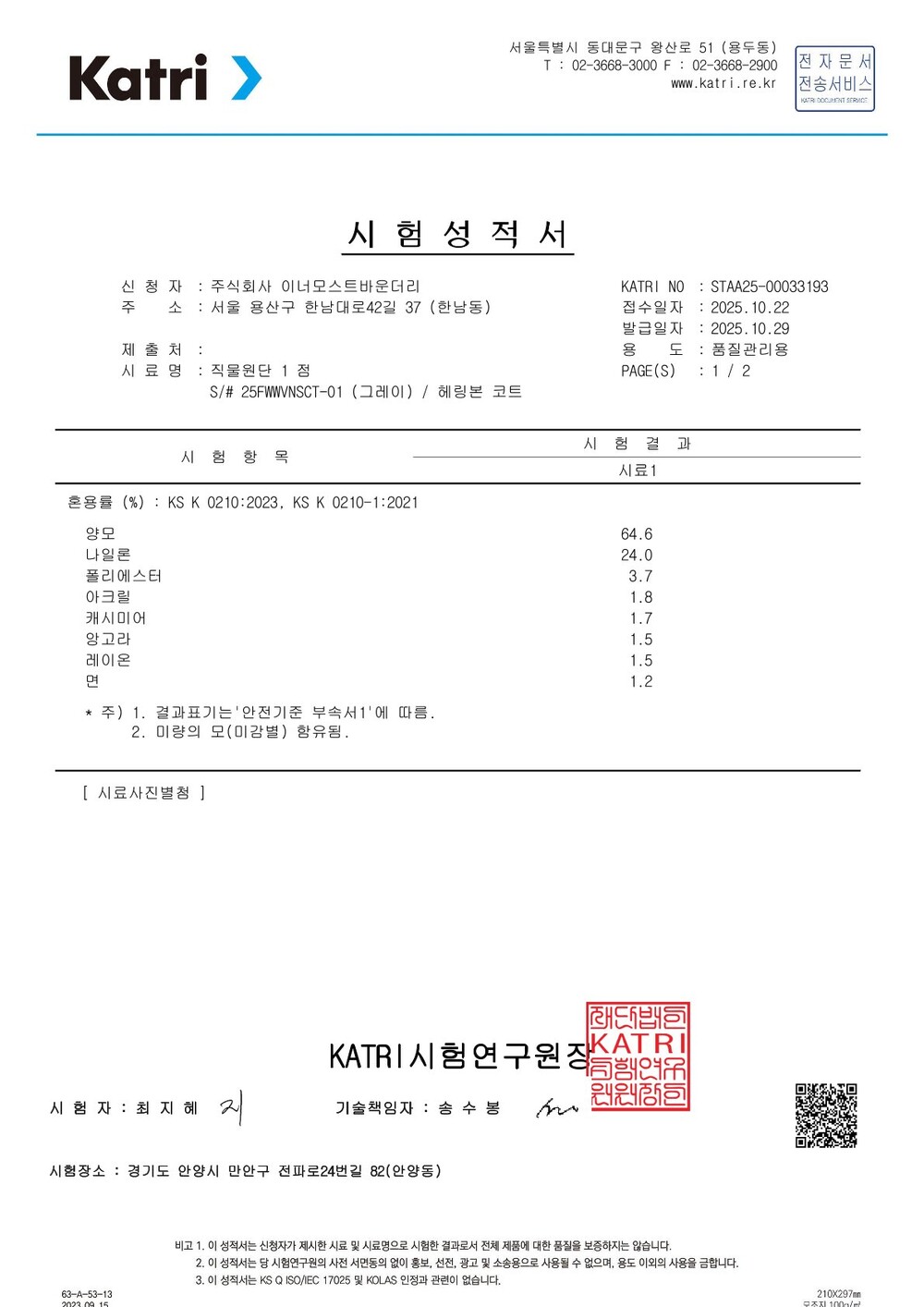 1 : 어깨 50 가슴 61.5 소매 65 총장 120