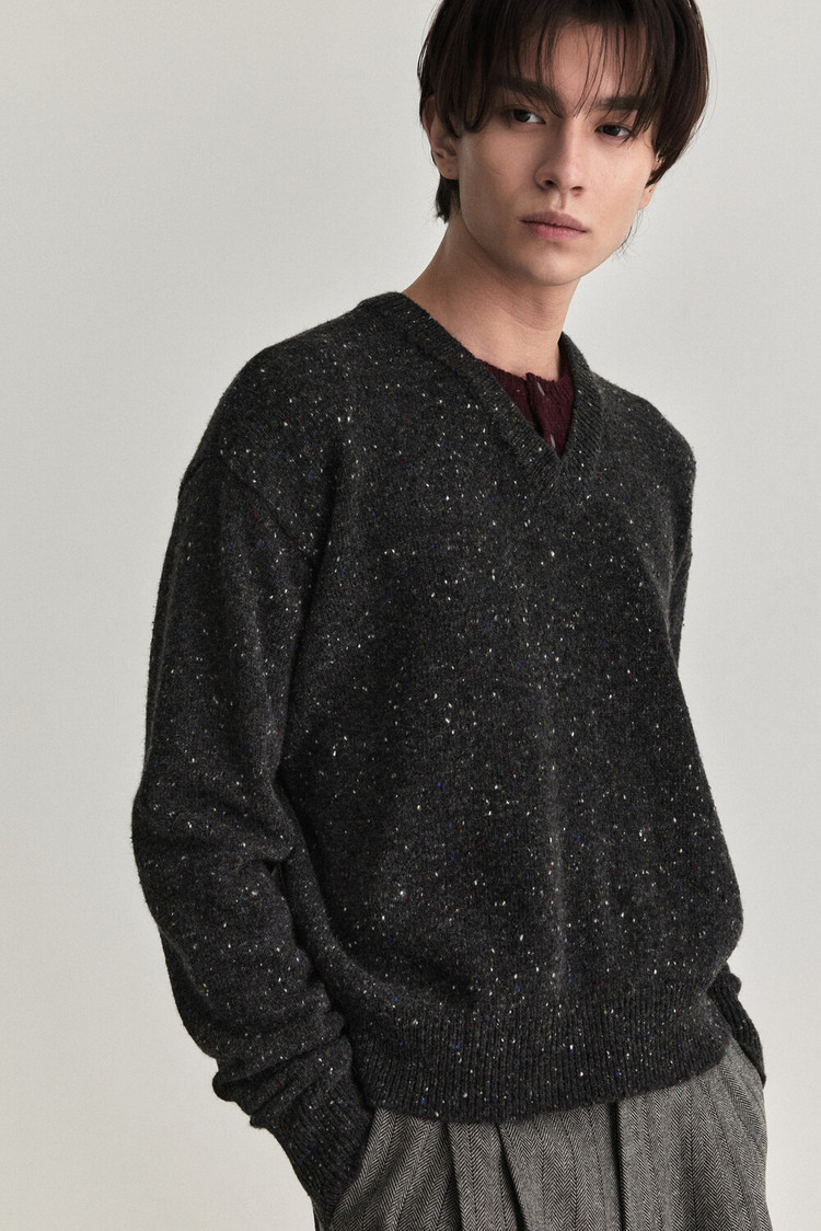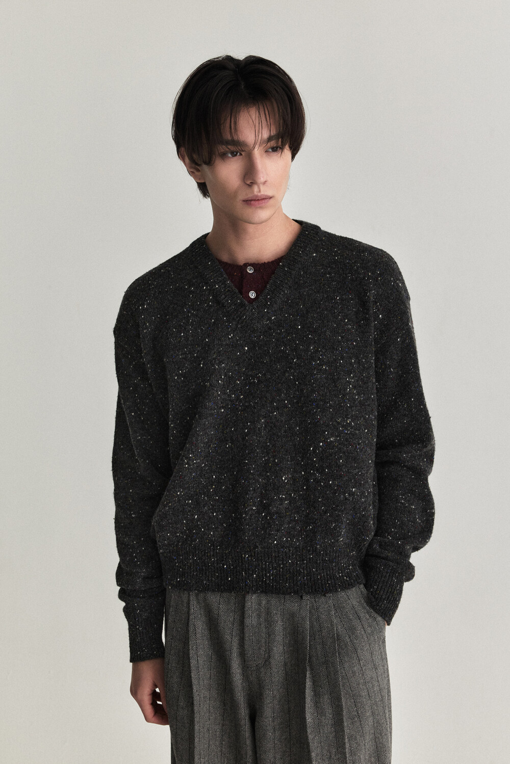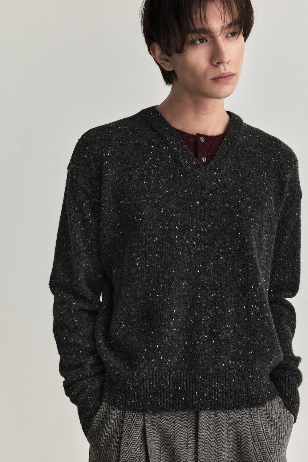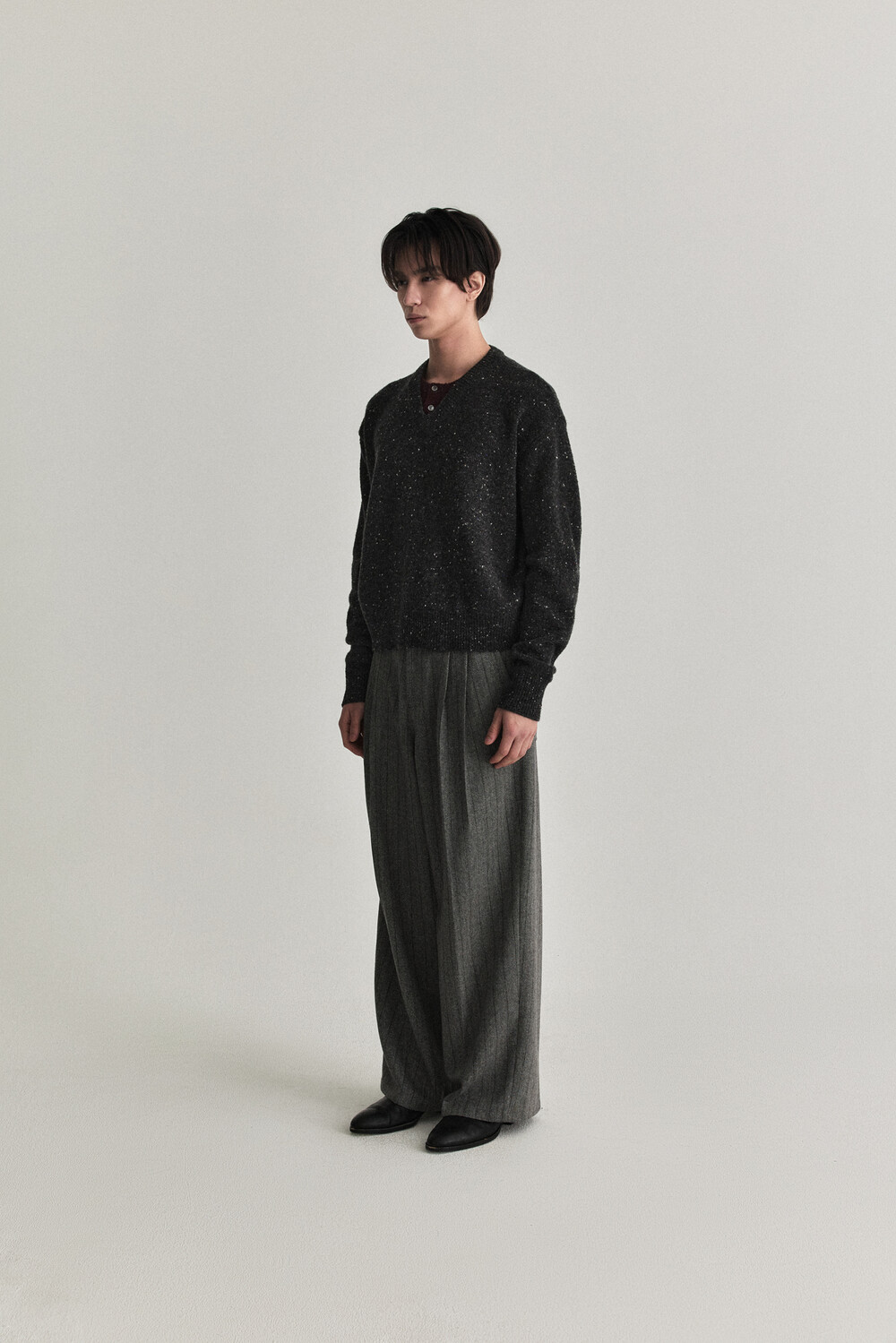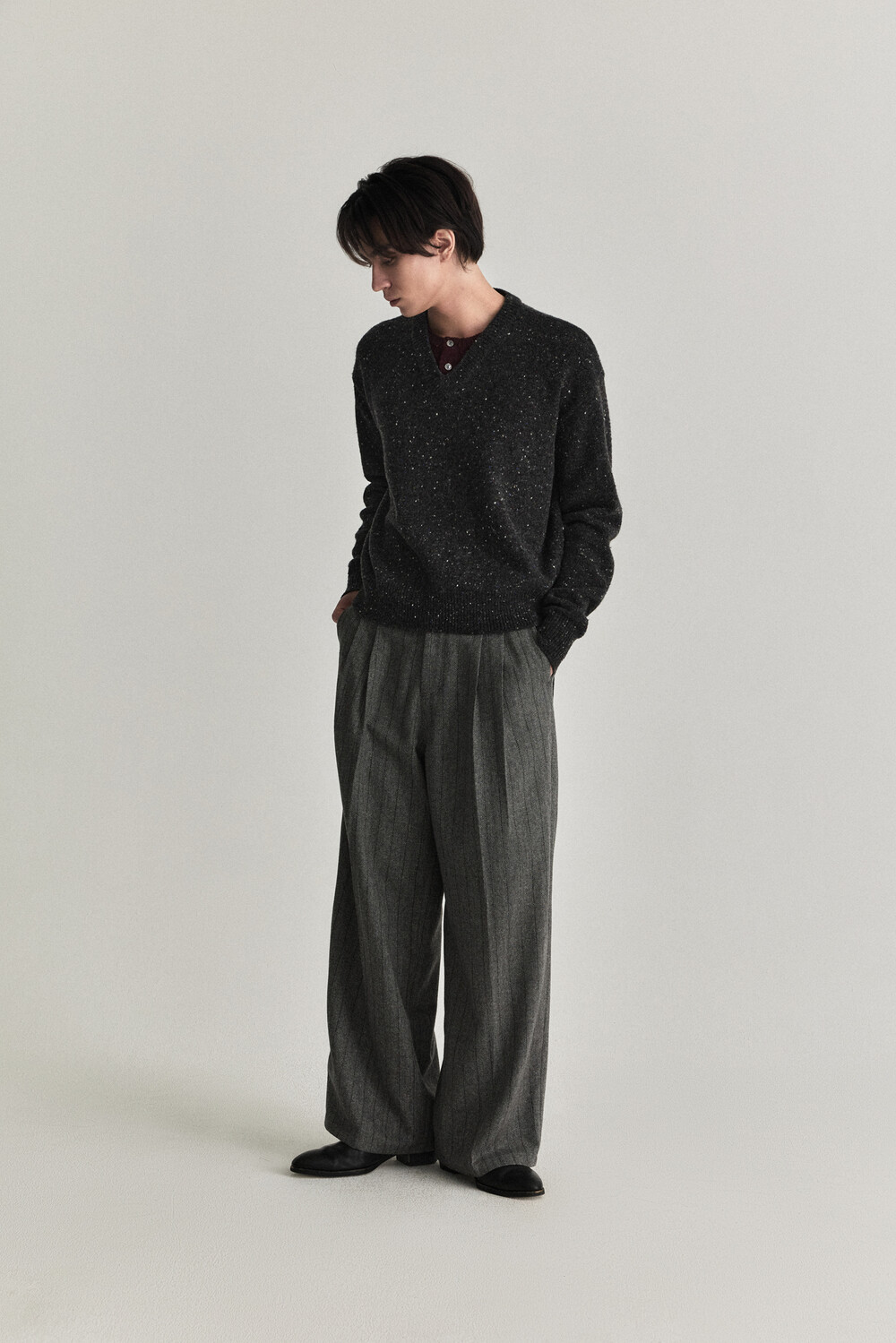 - 울 혼용 니트 패브릭으로 제작된 헨리넥 레이어드 브이넥 디자인