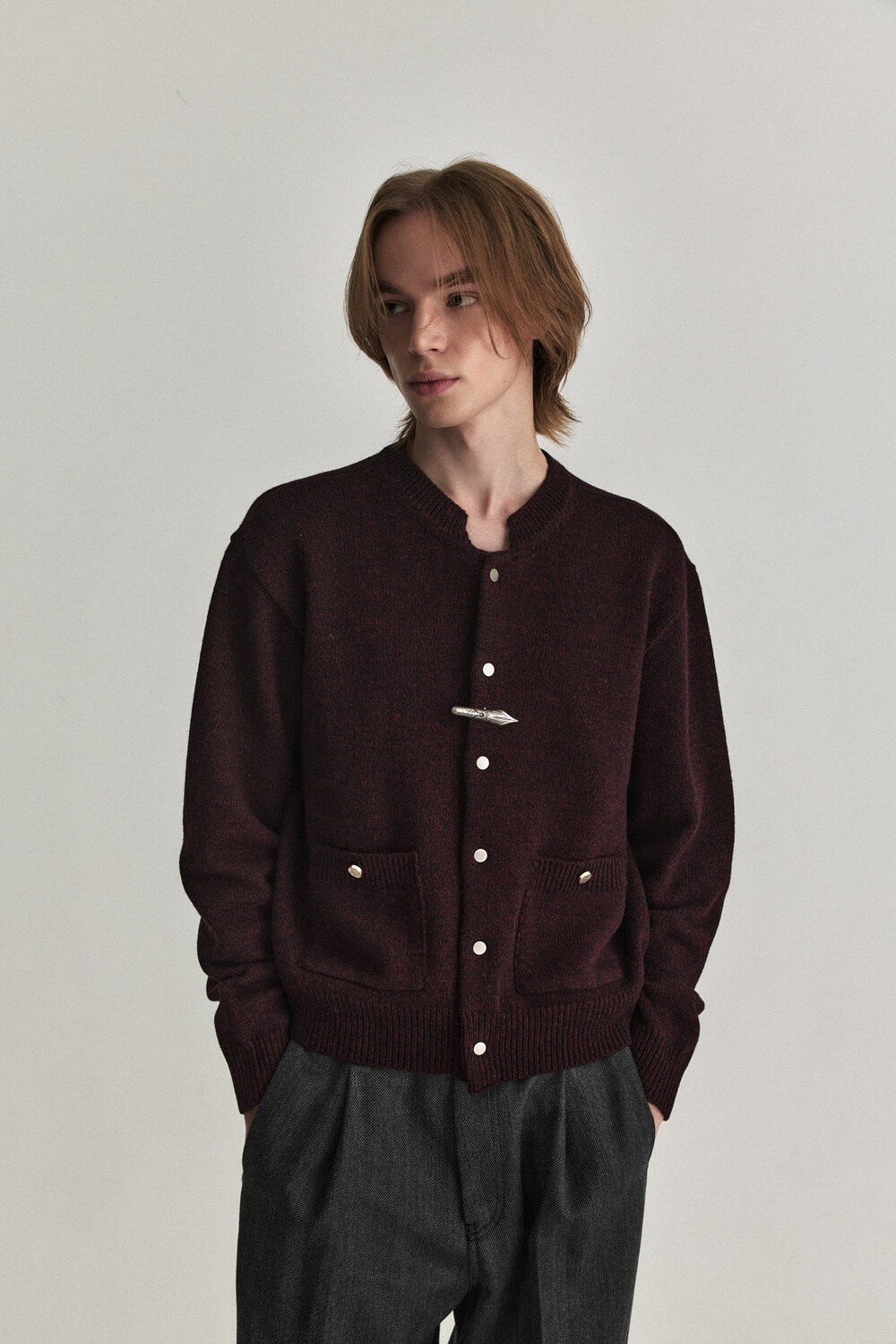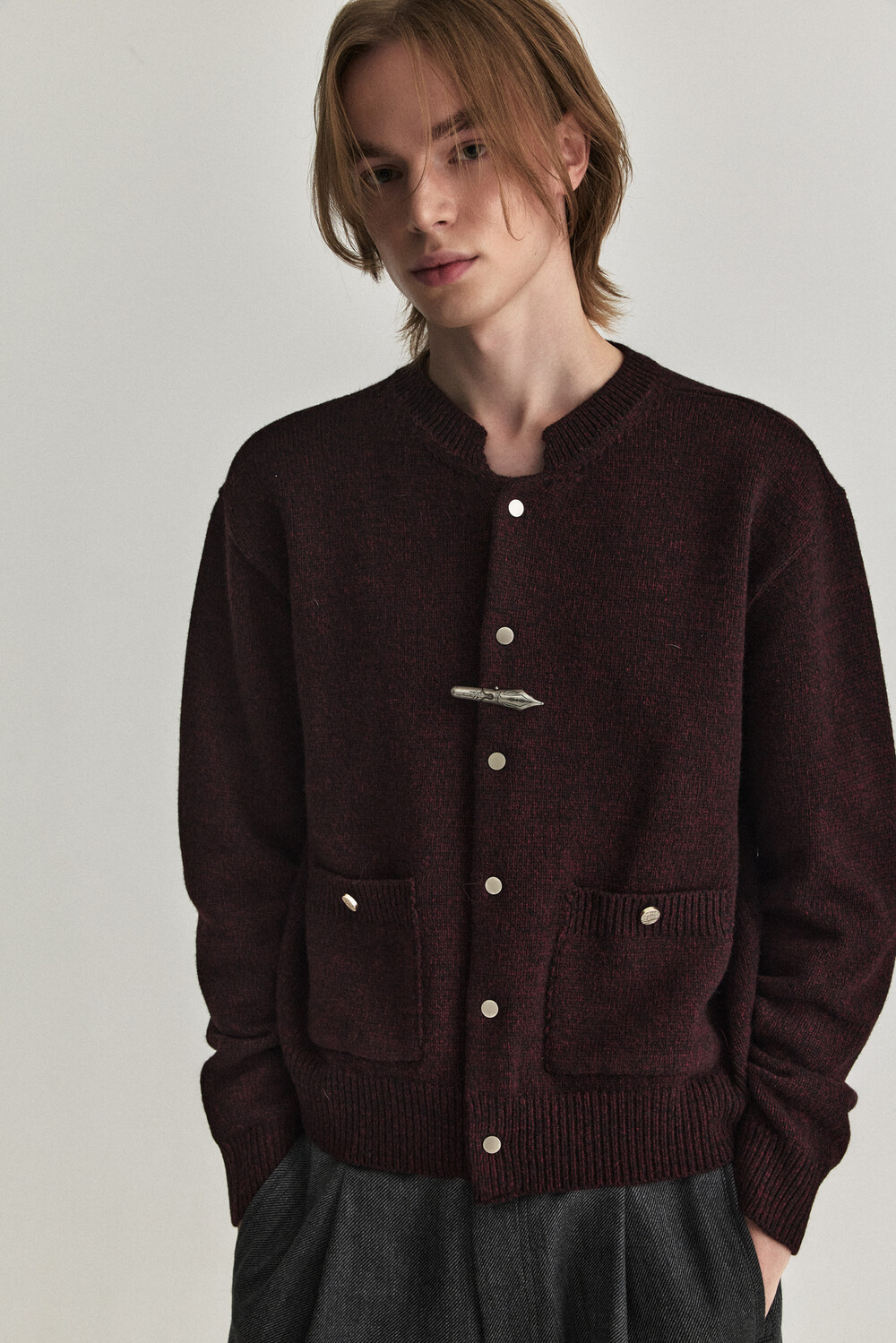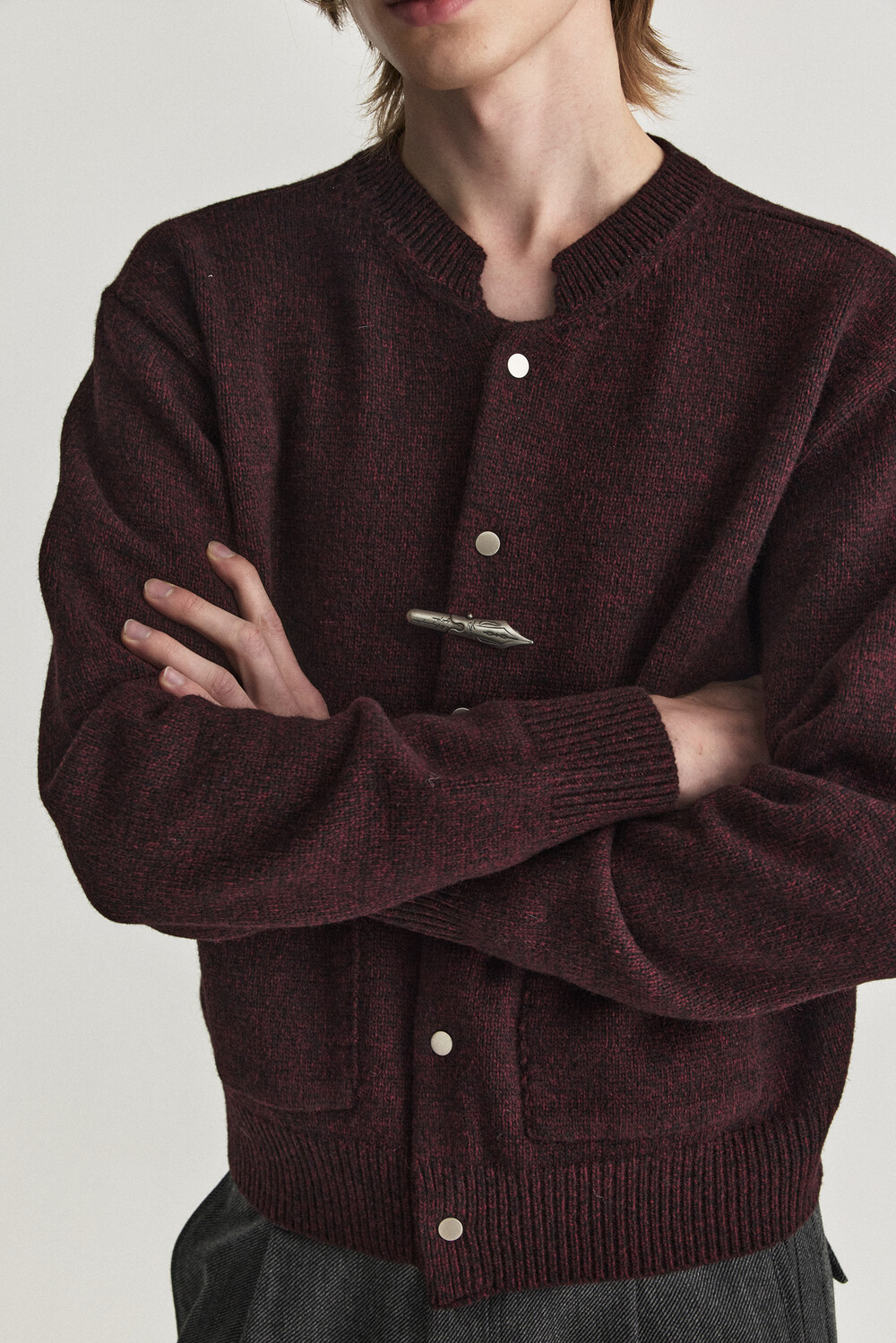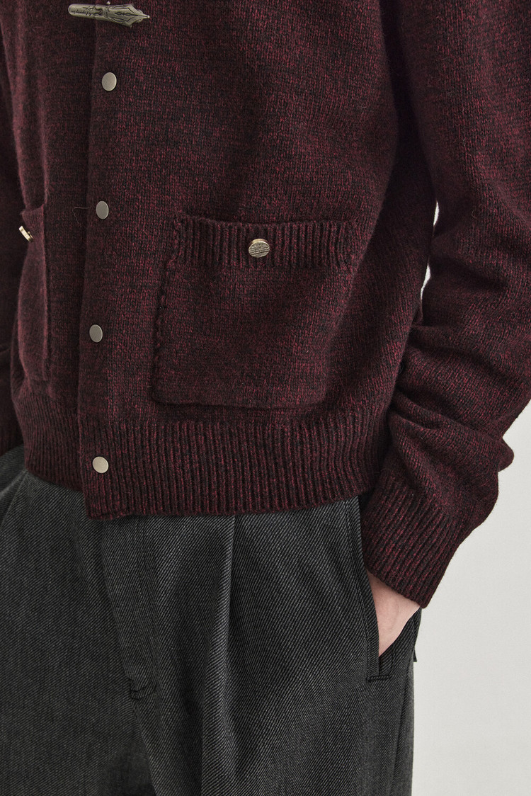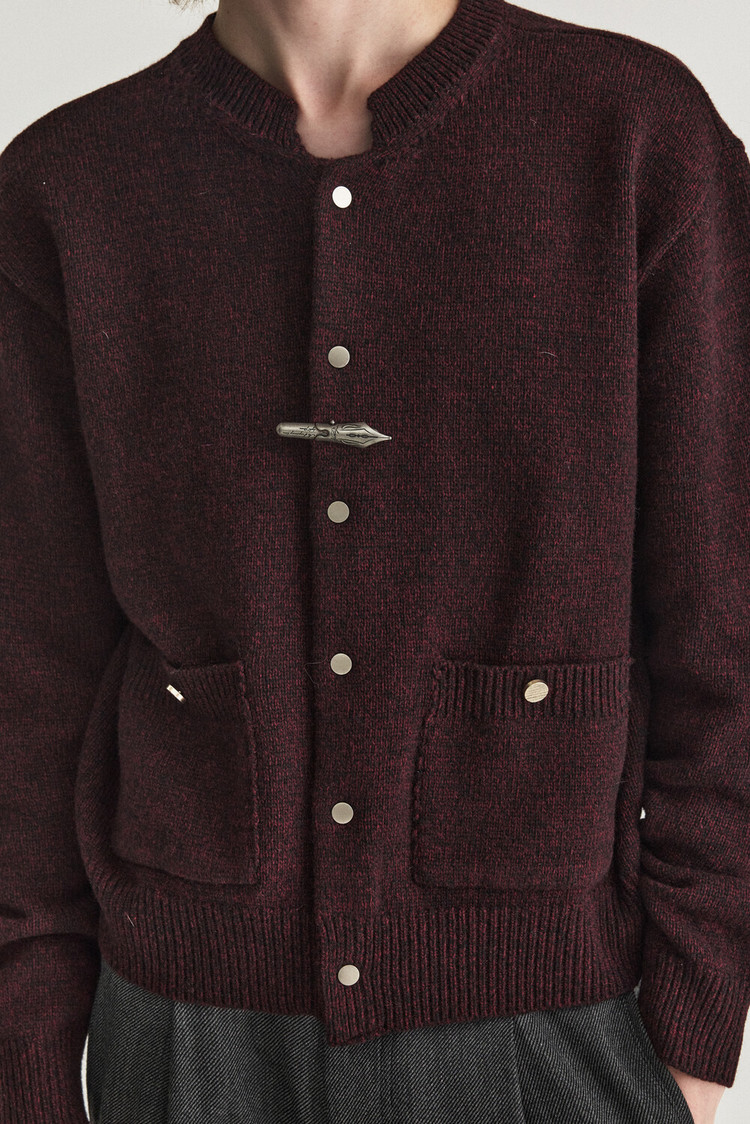 - 울 혼용 니트 패브릭으로 제작된 바시티 형태의 니트 가디건