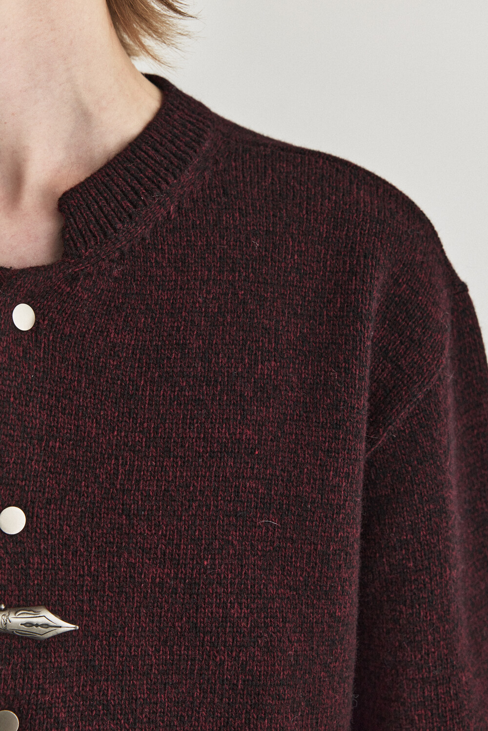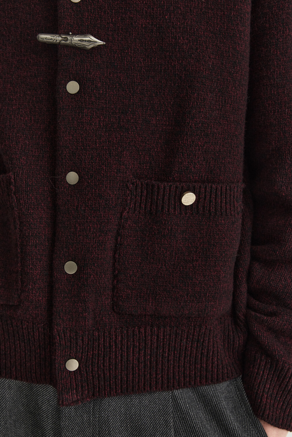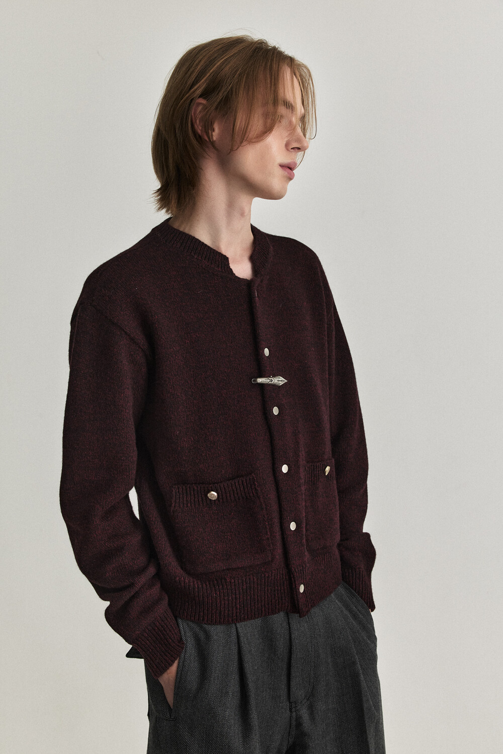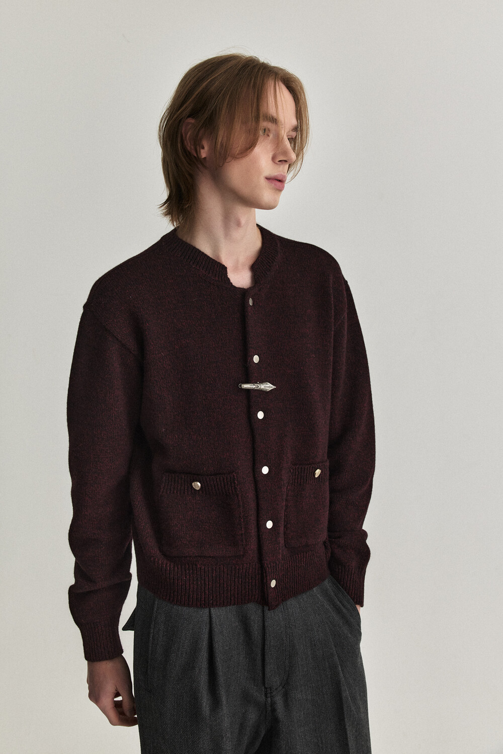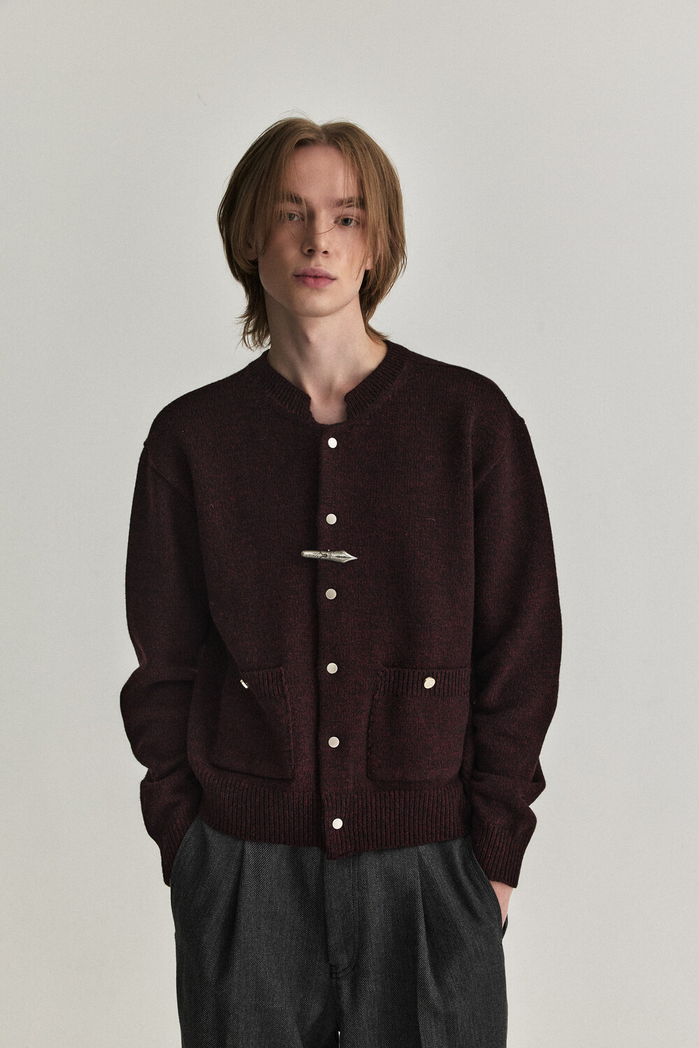- 울 혼용 니트 패브릭으로 제작된 바시티 형태의 니트 가디건