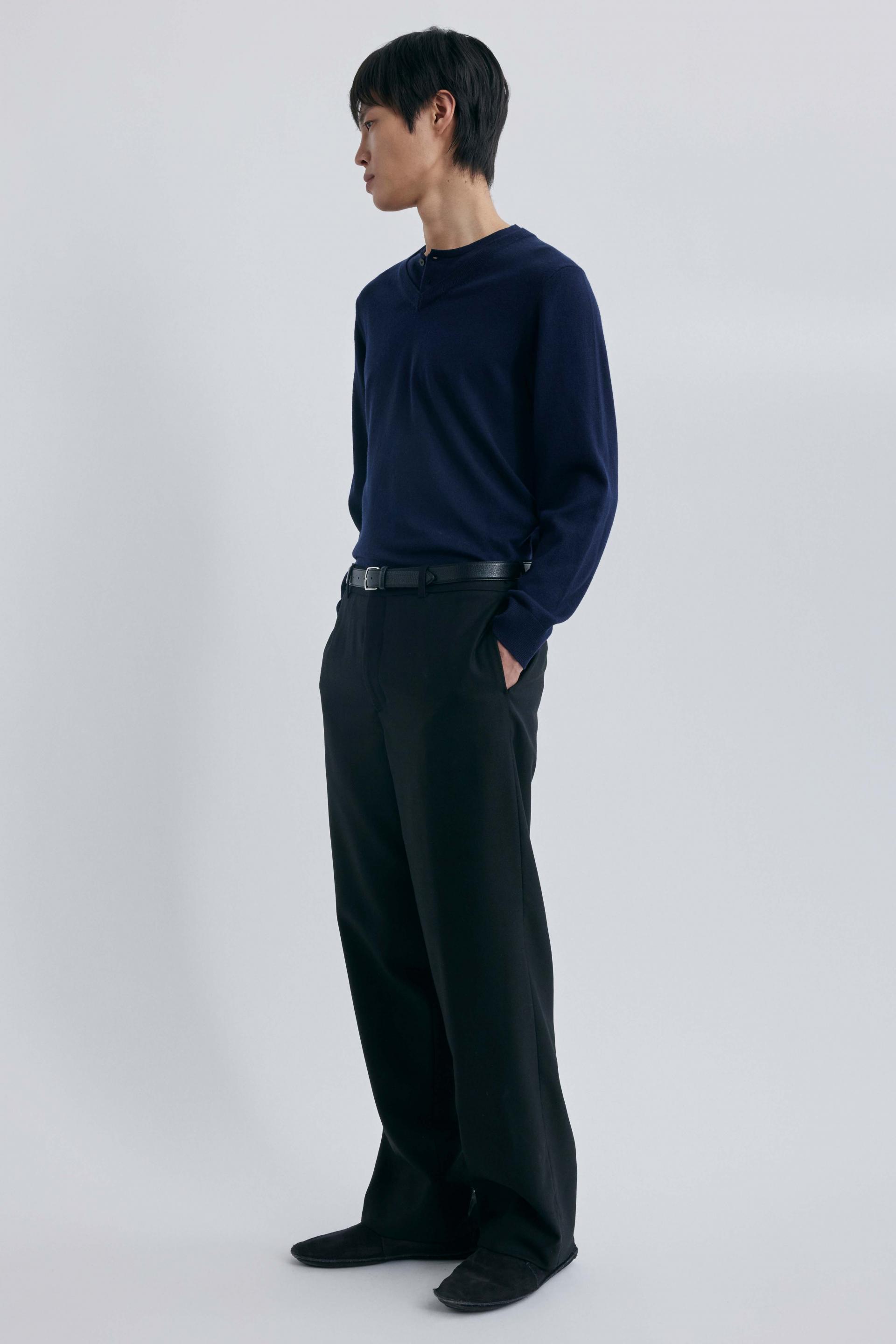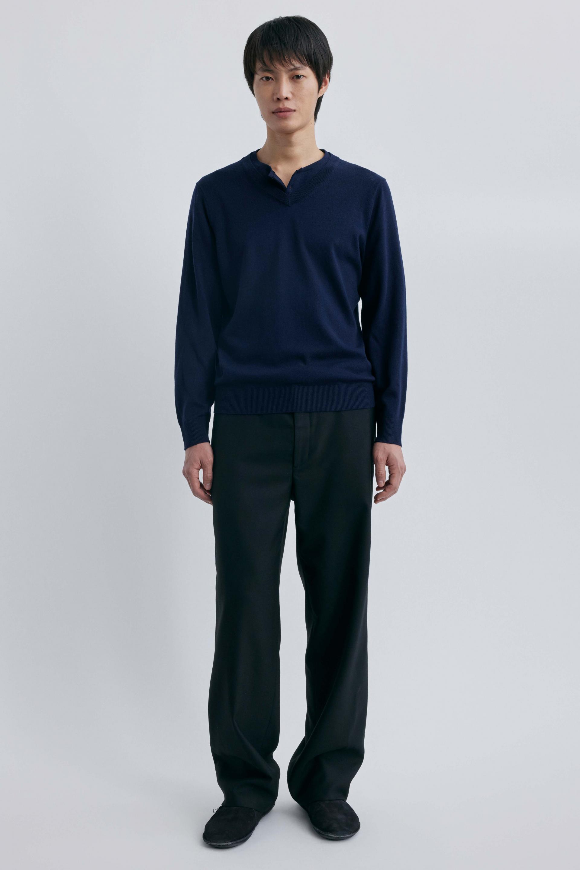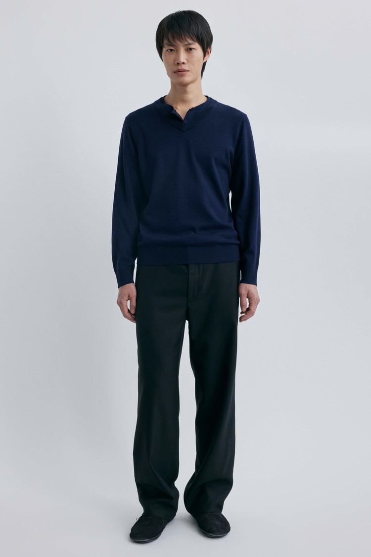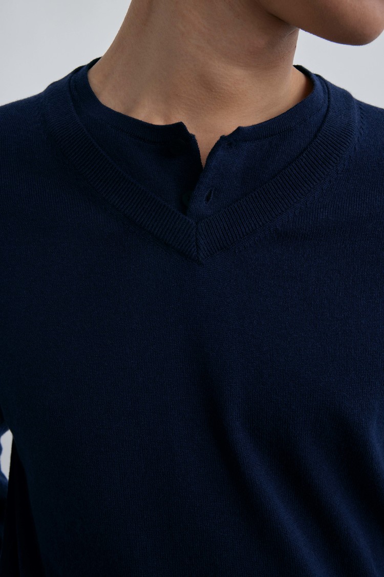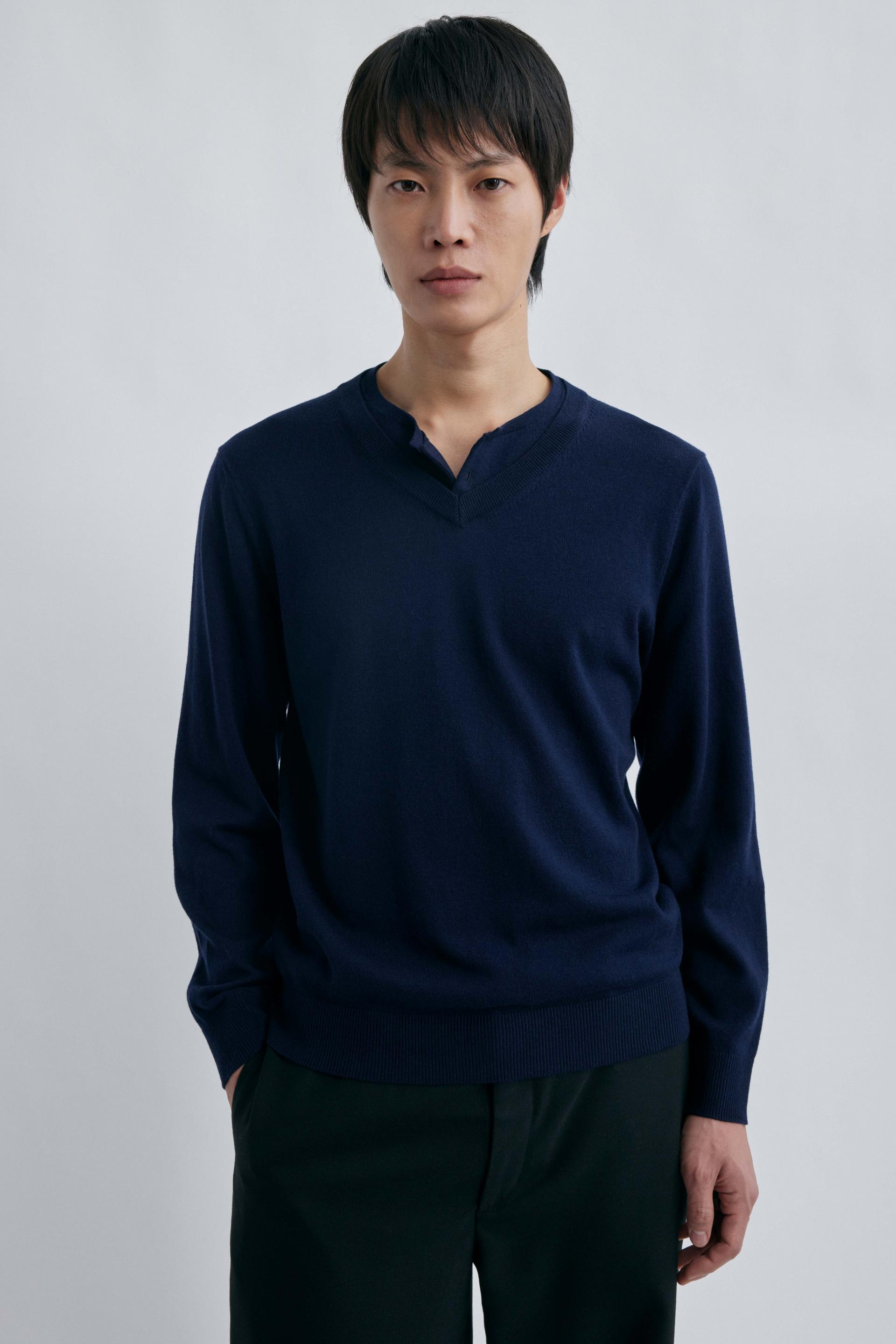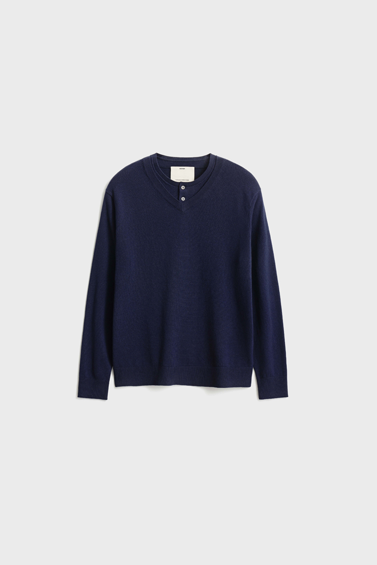 브이넥과 헨리넥이 자연스럽게 겹쳐진 독특한 더블 레이어드 구조로, 한 벌만으로도 깊이 있는 스타일링을 완성하는 니트입니다.